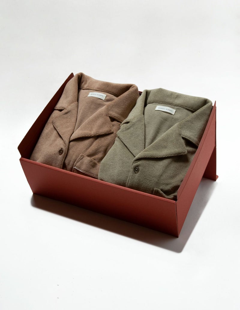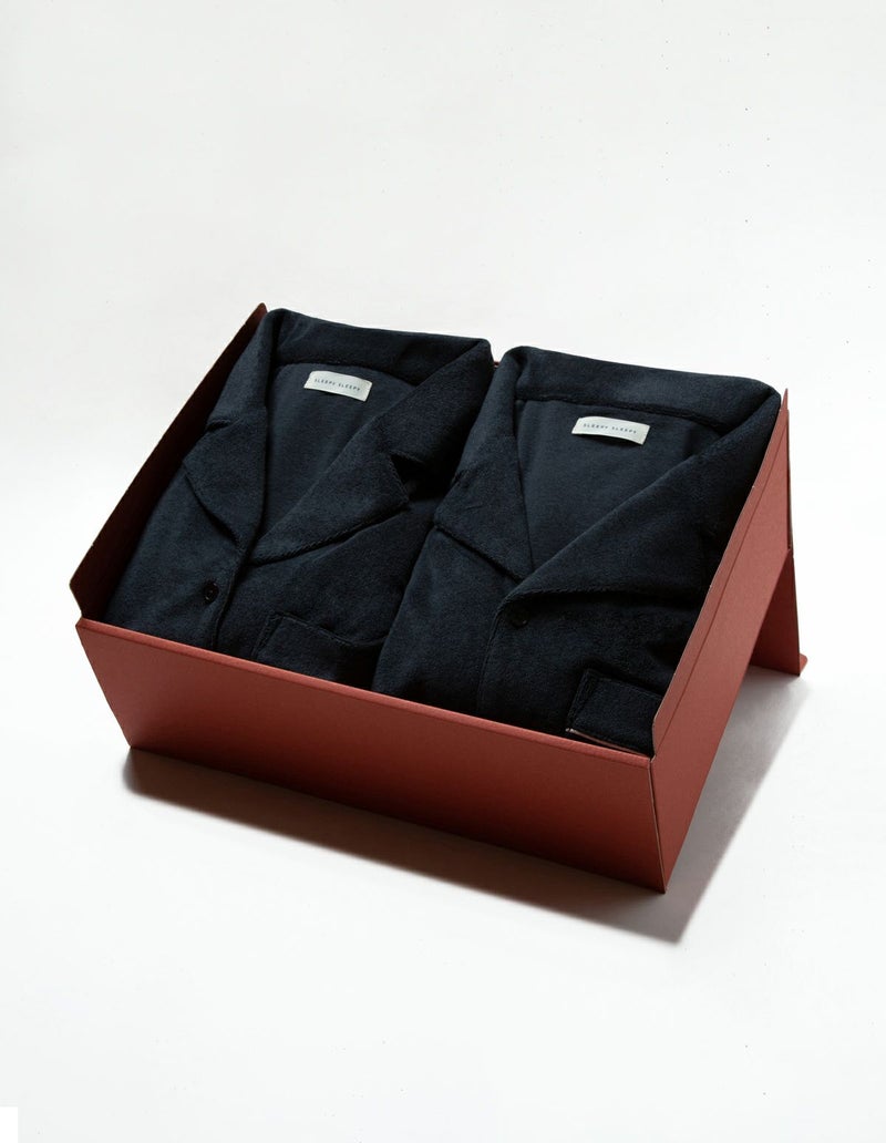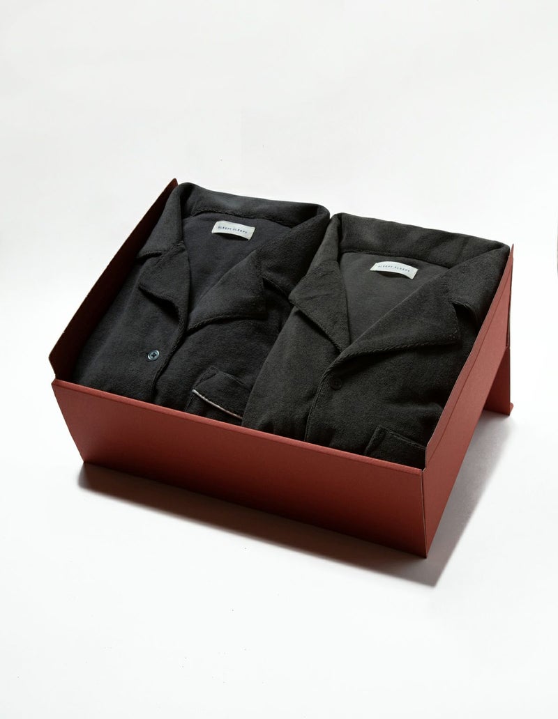 柔らかな肌触りのパイルパジャマをペアでセットしたギフトセット。ゆったりとしたシルエットでベーシックなシャツデザインに袖口とポケットのパイピングでアクセントをプラス。厚手の素材ながらもスッキリとしたシルエットに仕上げました。限定BOX入り。