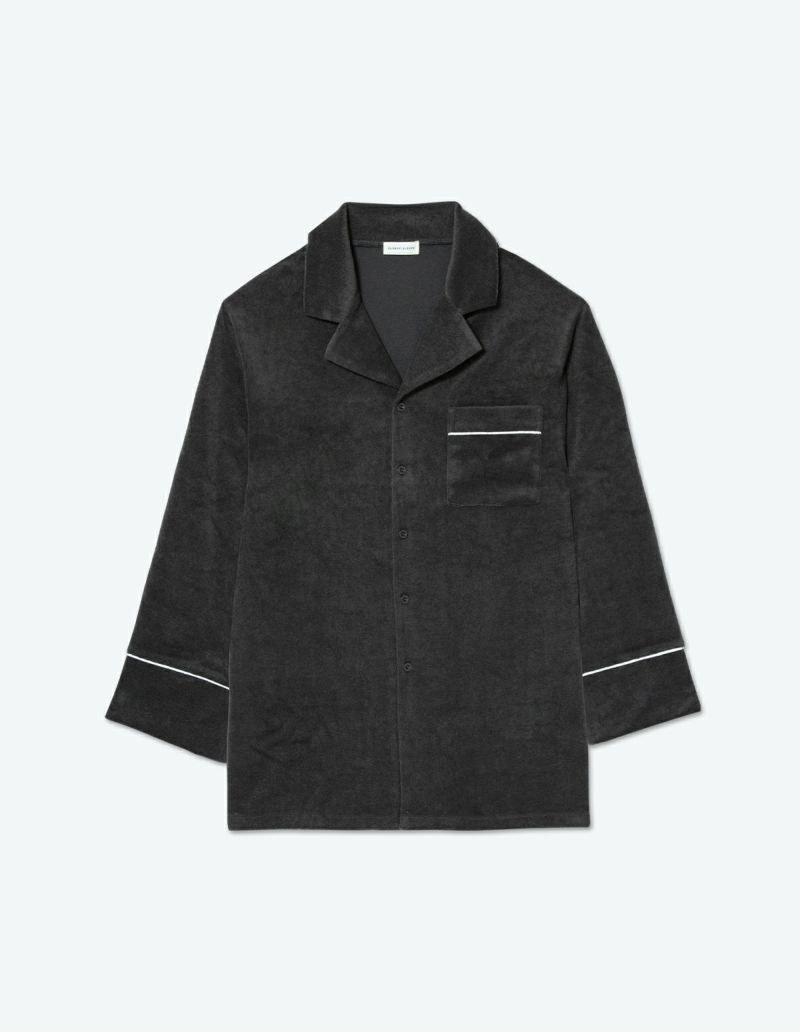 柔らかな肌触りのメンズパイルパジャマ長袖ロングパンツセット。ゆったりとしたシルエットでベーシックなシャツデザインに袖口とポケットのパイピングでアクセントをプラス。厚手の素材ながらもスッキリとしたシルエットに仕上げました。ペアアイテムとしてもおすすめです。
