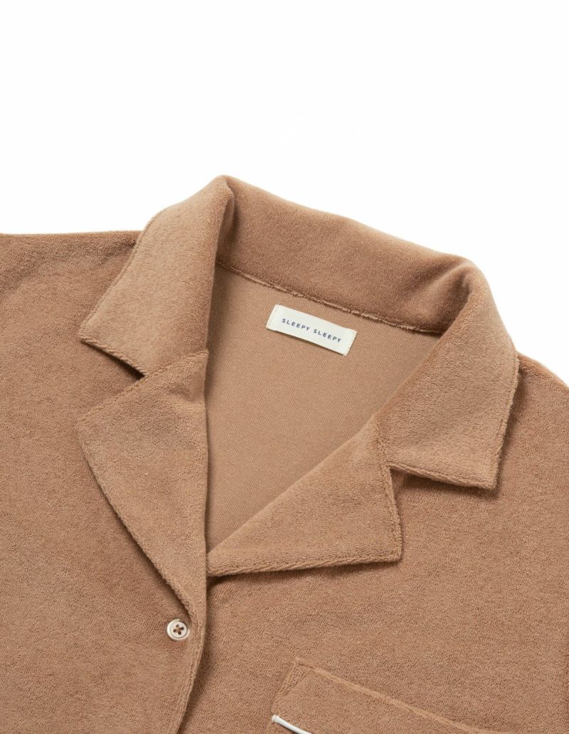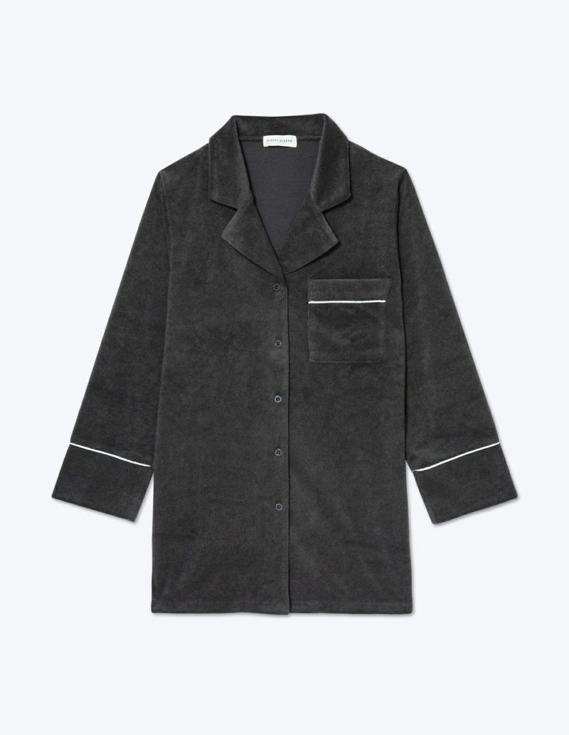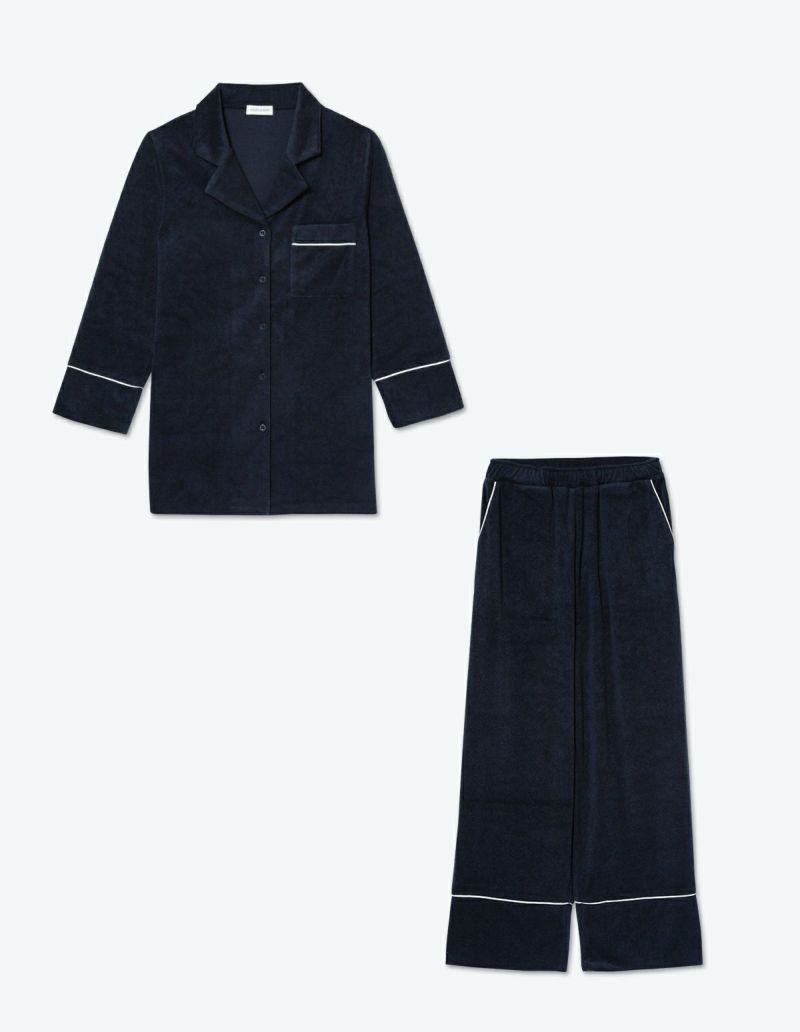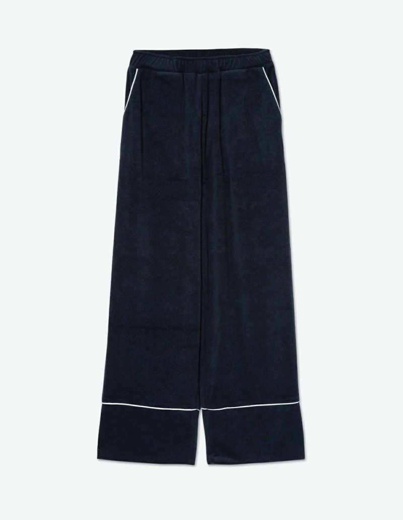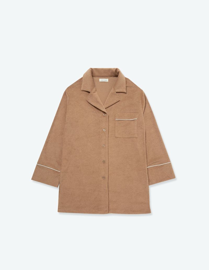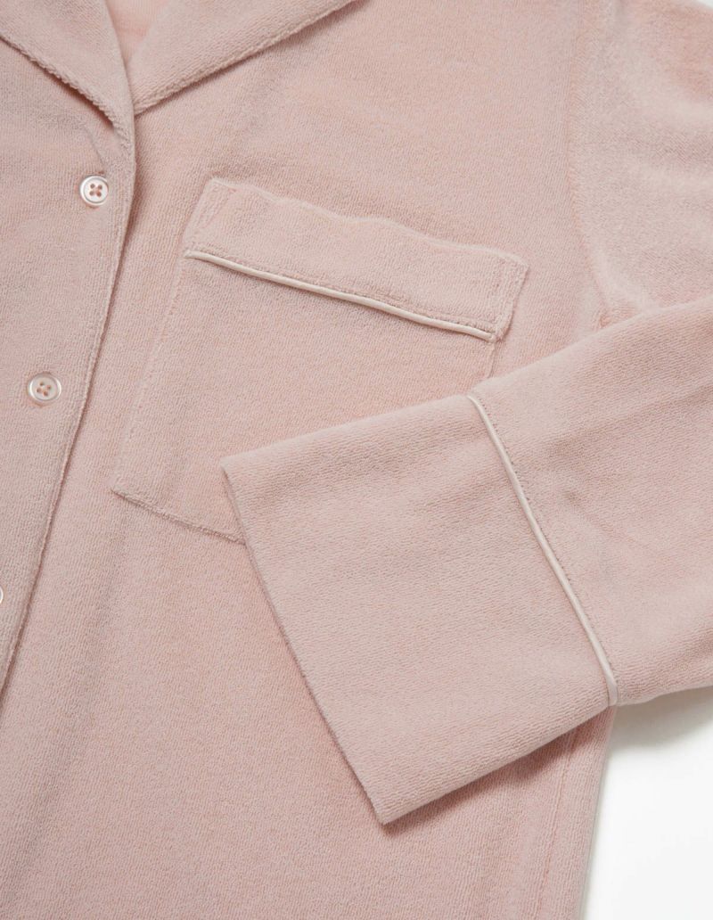 柔らかな肌触りのパイルパジャマ長袖ロングパンツセット。ゆったりとしたシルエットでベーシックなシャツデザインに袖口とポケットのパイピングでアクセントをプラス。厚手の素材ながらもスッキリとしたシルエットに仕上げました。ペアアイテムとしてもおすすめです。
