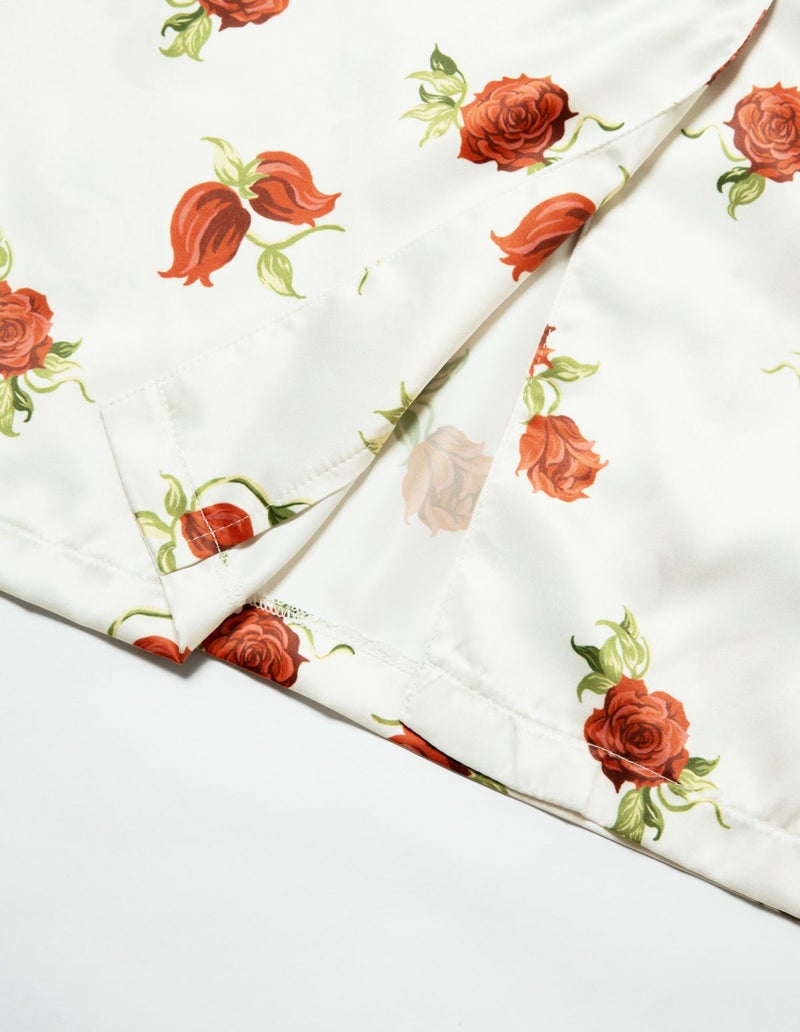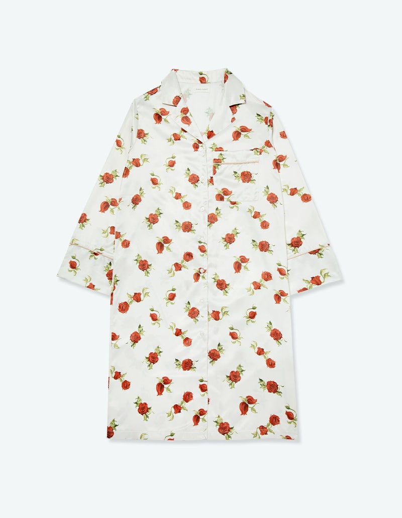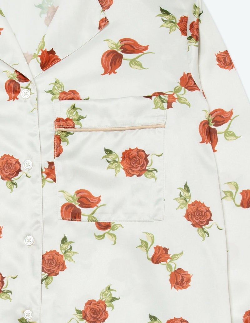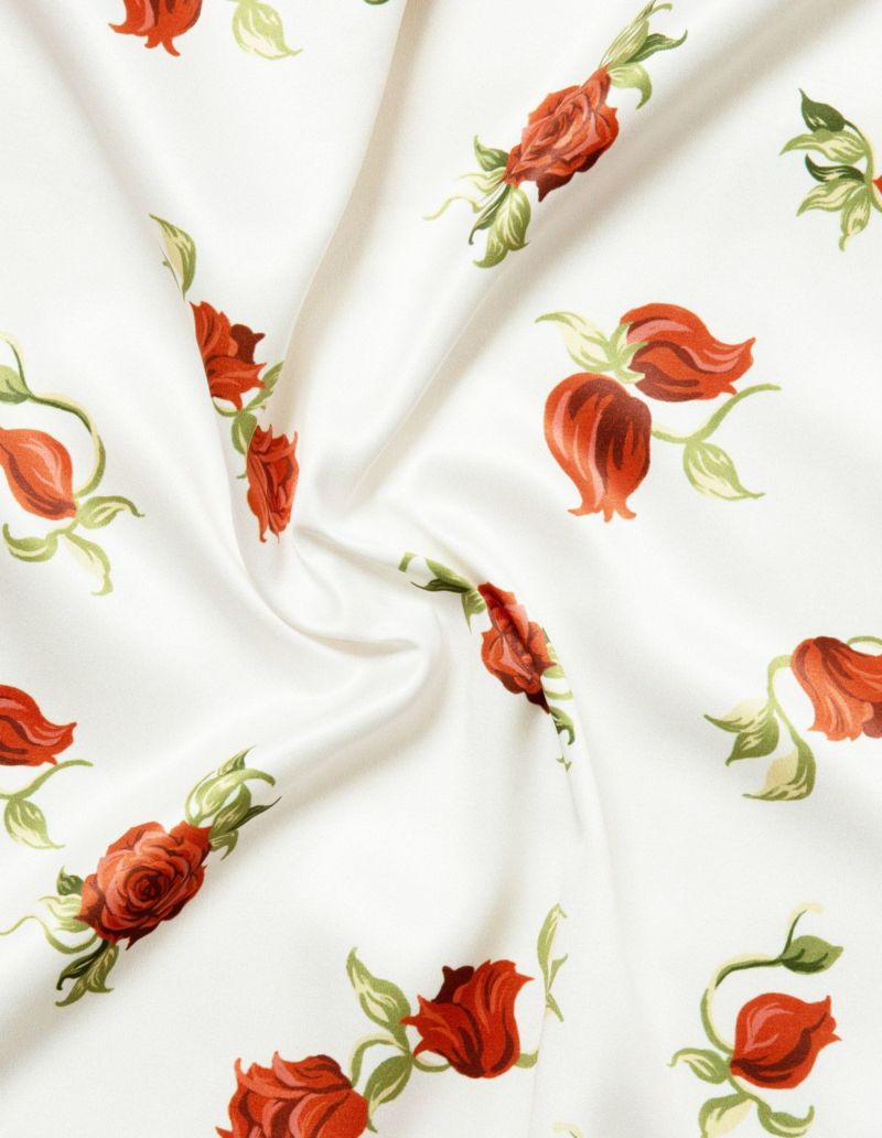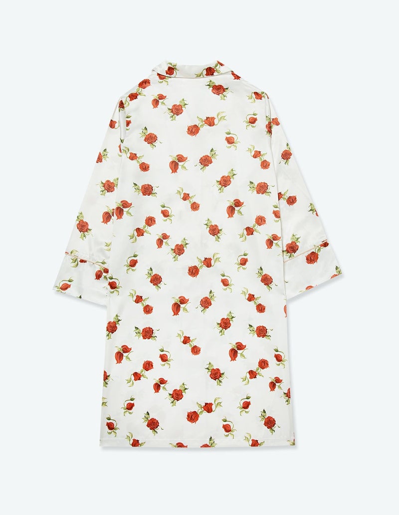 摘み取ったローズを散りばめたような、フラワープリントの長袖ワンピース。微光沢のサテン生地がさらりとした肌触りで、シーズンレスに着用可能な素材です。華やかなレッドローズとシックなフラワーローズの2色展開。