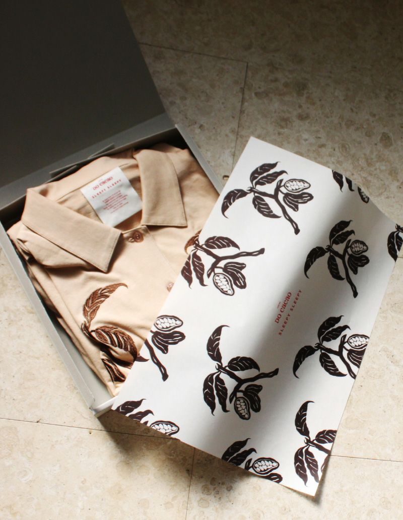 デザインはカカオの美しい果実のフォルムを、 SLEEPY SLEEPYならではの華やかな描写、 そして今回は繊細な刺繍でカカオを表現した風合いある一着に仕上げています。