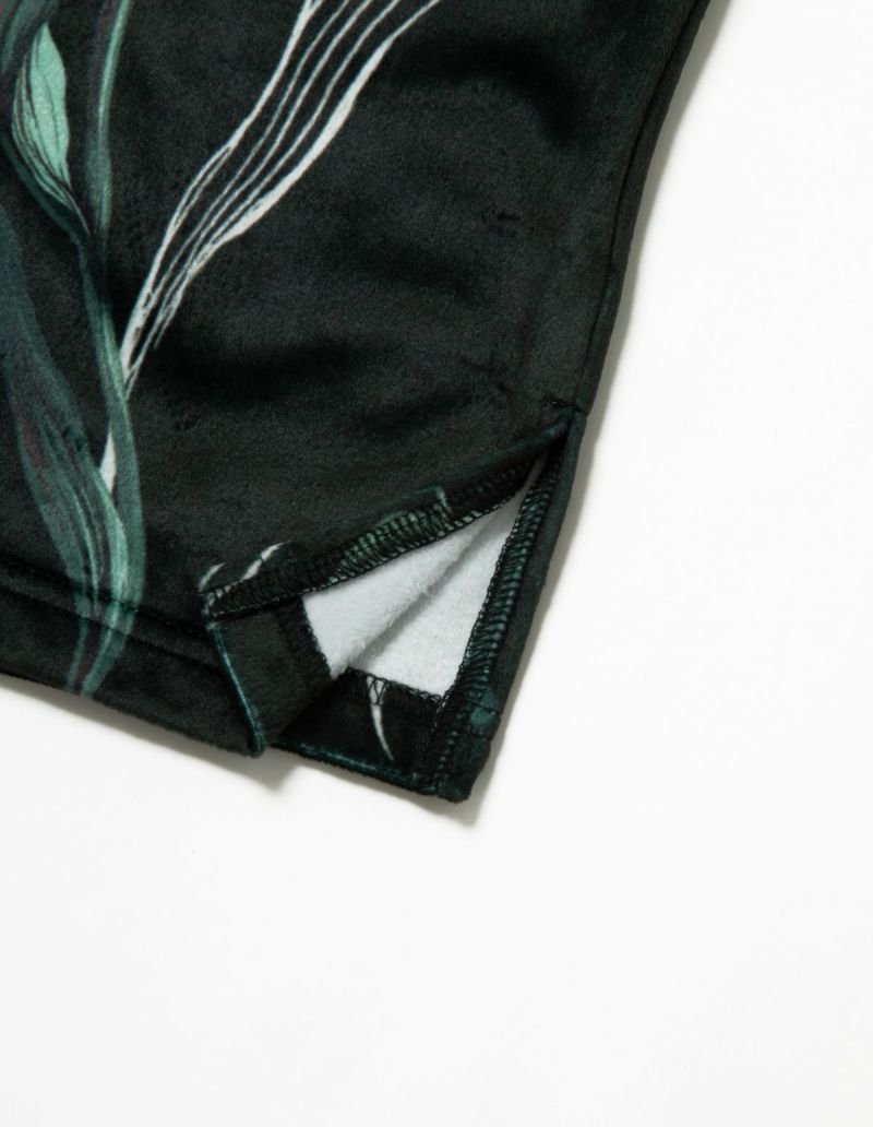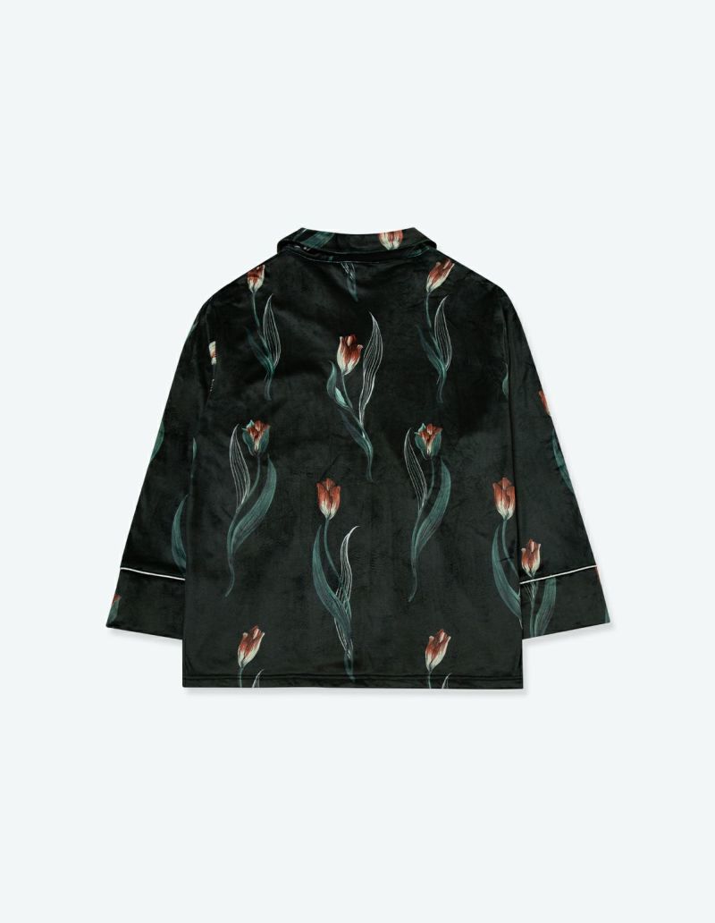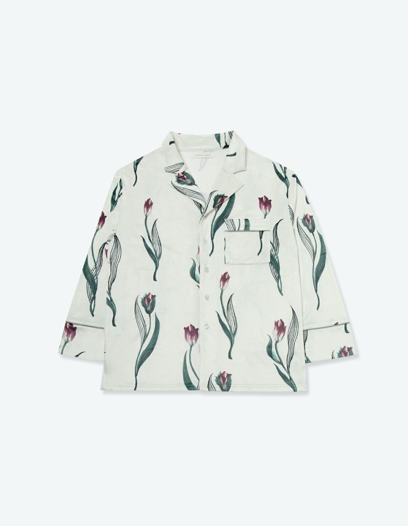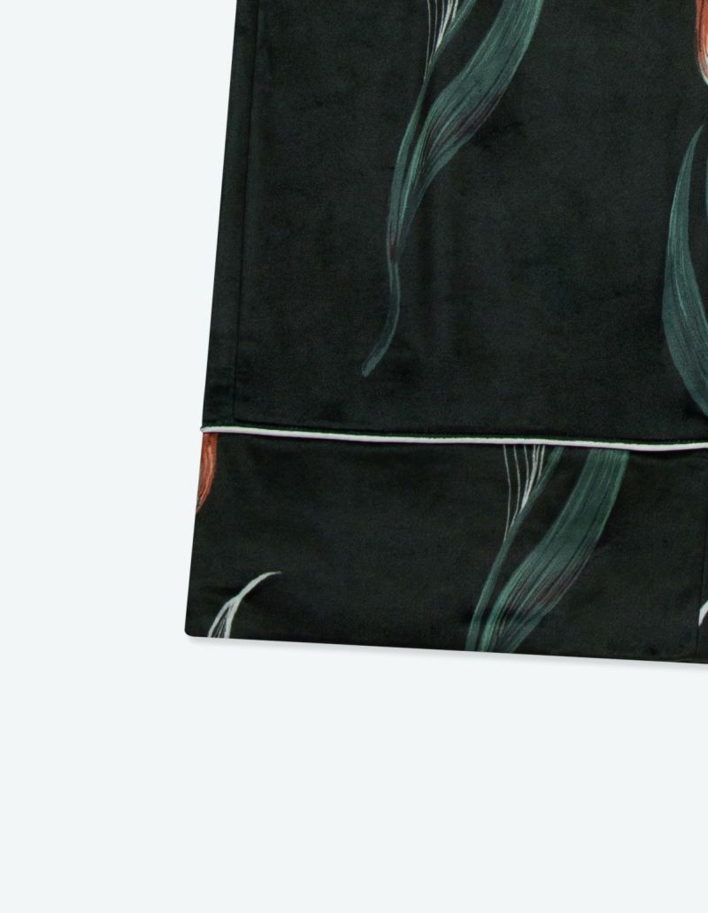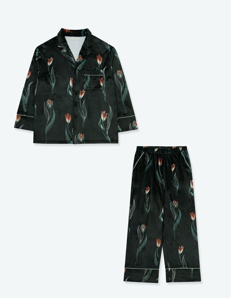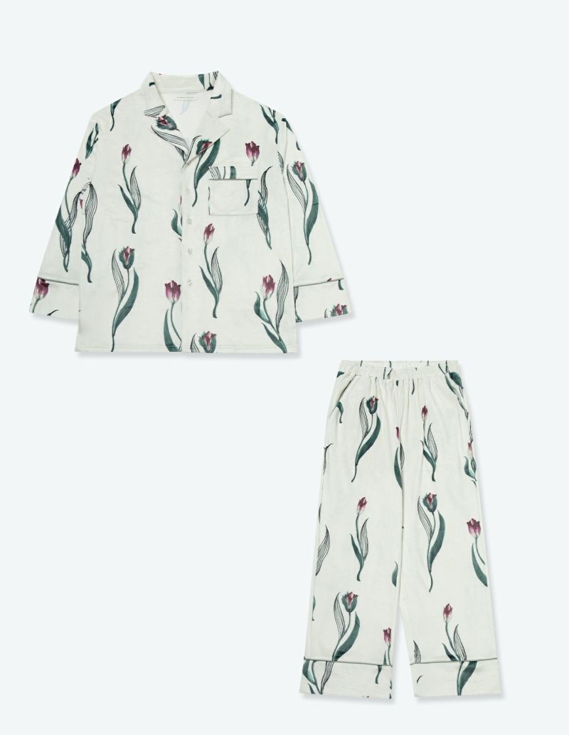 チューリップの持つ特徴的なラインを抽出したフラワーパターンを、柔らかくしっとりとしたベロア生地プリントした長袖ロングパンツ。チューリップの花弁に優美にさす色と、葉っぱのラインとのコントラストでシックな印象にまとめたデザイン。着心地の柔らかなベロアは保温性も高く暖かくお過ごしいただけます。 ペアアイテムとしてもおすすめ。