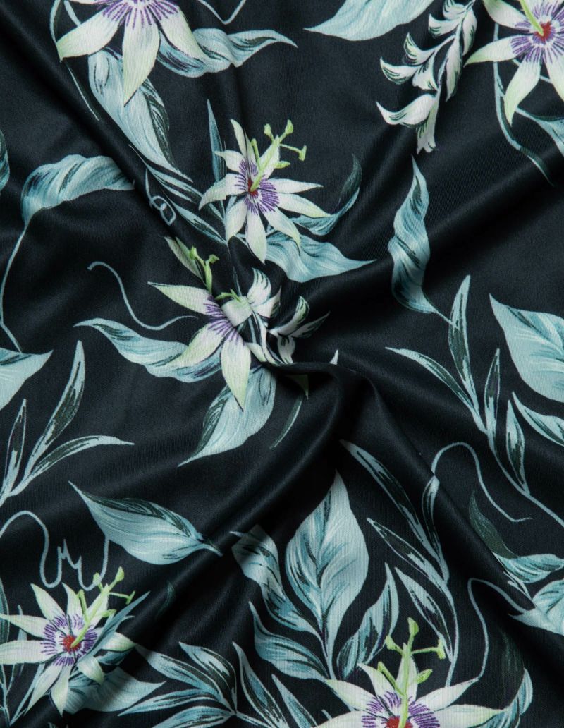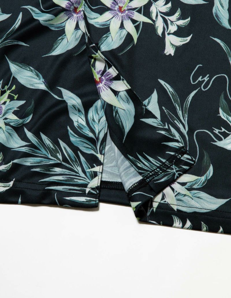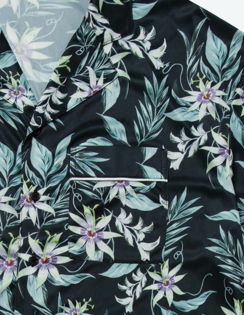 十字架上の花とされたパッションフラワーは煌びやかな美しさが特徴。その逸話から「聖なる愛」を花言葉持つ。ゆとりのあるオーバーサイズデザインで、アロハシャツのようにご着用いただくことも可能です。伸縮性の良いカットソー素材でありながら微光沢のある生地感で上質なイメージも演出。さらりとして速乾性もあり心地よくお過ごしいただけるアイテムです。おそろいで着られるペアパジャマとして誕生日のギフト、結婚祝いなど様々なお祝いシーンにもおすすめです。