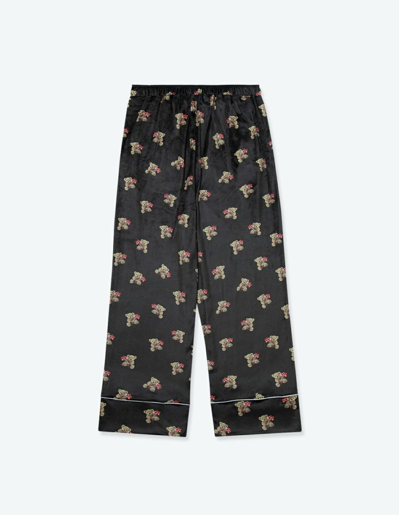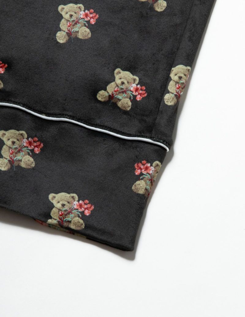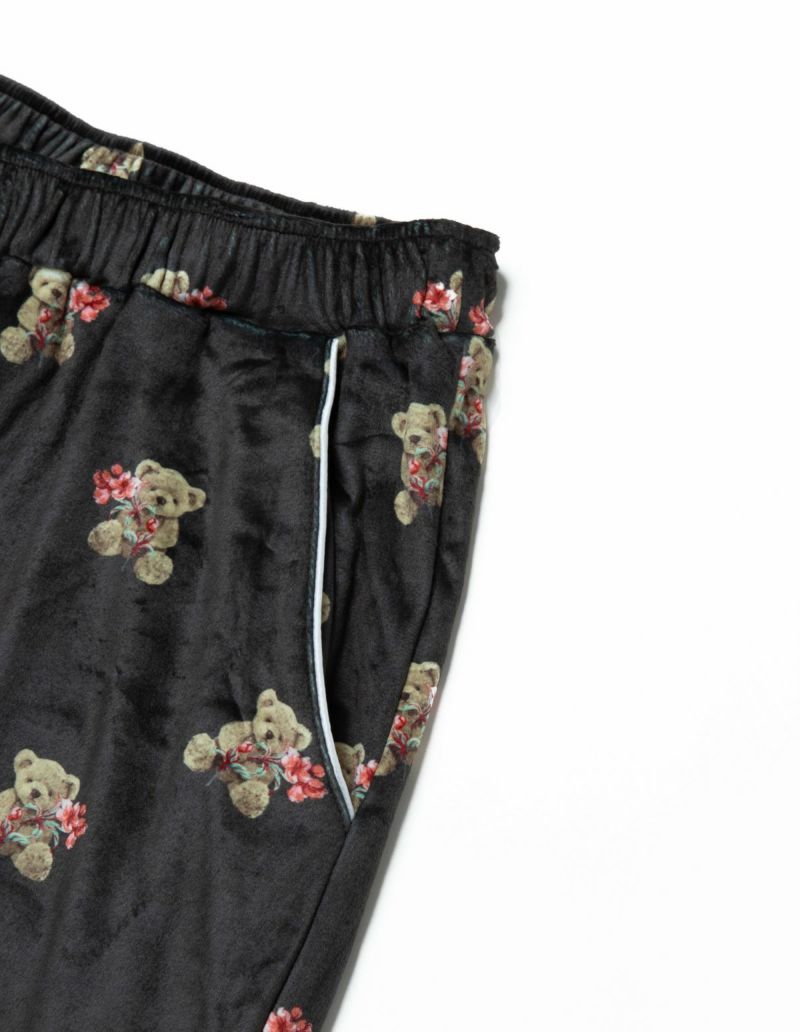 花束を抱いたベアを柔らかくしっとりとしたベロア生地プリントした長袖ロングパンツ。キュートなモチーフをSLEEPYらしいニュアンスカラーにまとめ大人っぽいプリントに。着心地の柔らかなベロアは保温性も高く暖かく過ごしいただけます。 ペアアイテムとしてもおすすめ。
