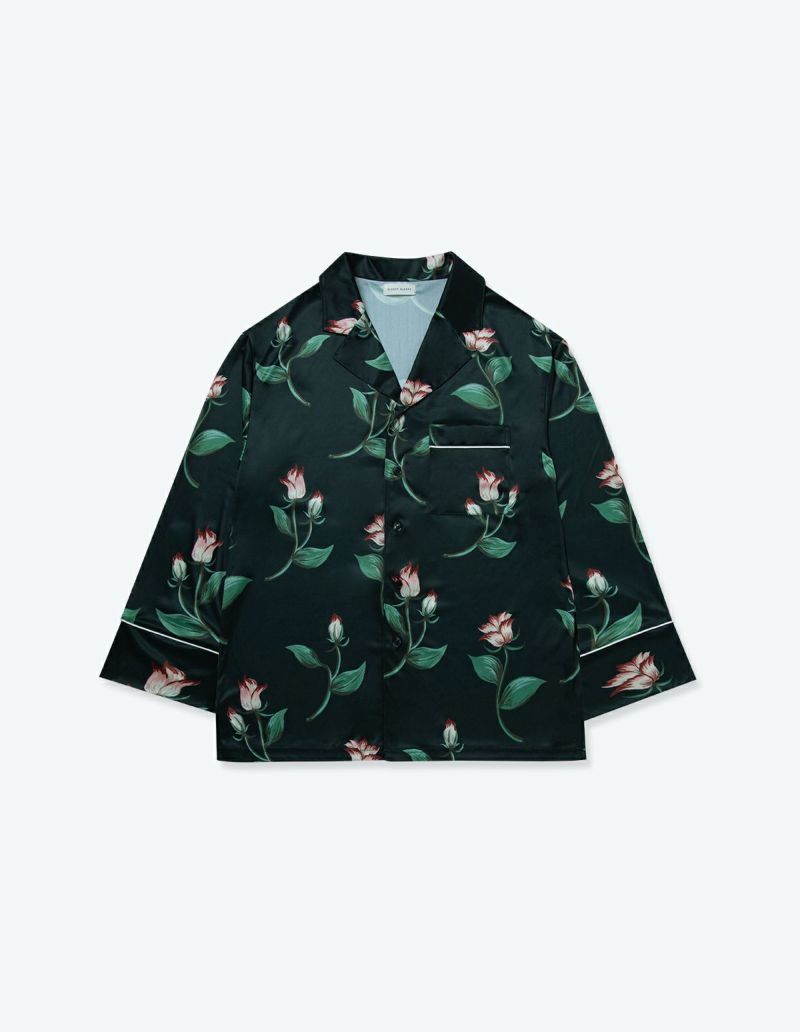 ドリーミングローズとよばれるバラをデザインしたフラワーパジャマ。ローズの赤い差し色で華やかさがありつつ華奢なラインの美しさを表現。 着丈のゆったりとしたデザインと落ち感のある生地が相まって上品な印象に。 ペアアイテムとしてもおすすめです。