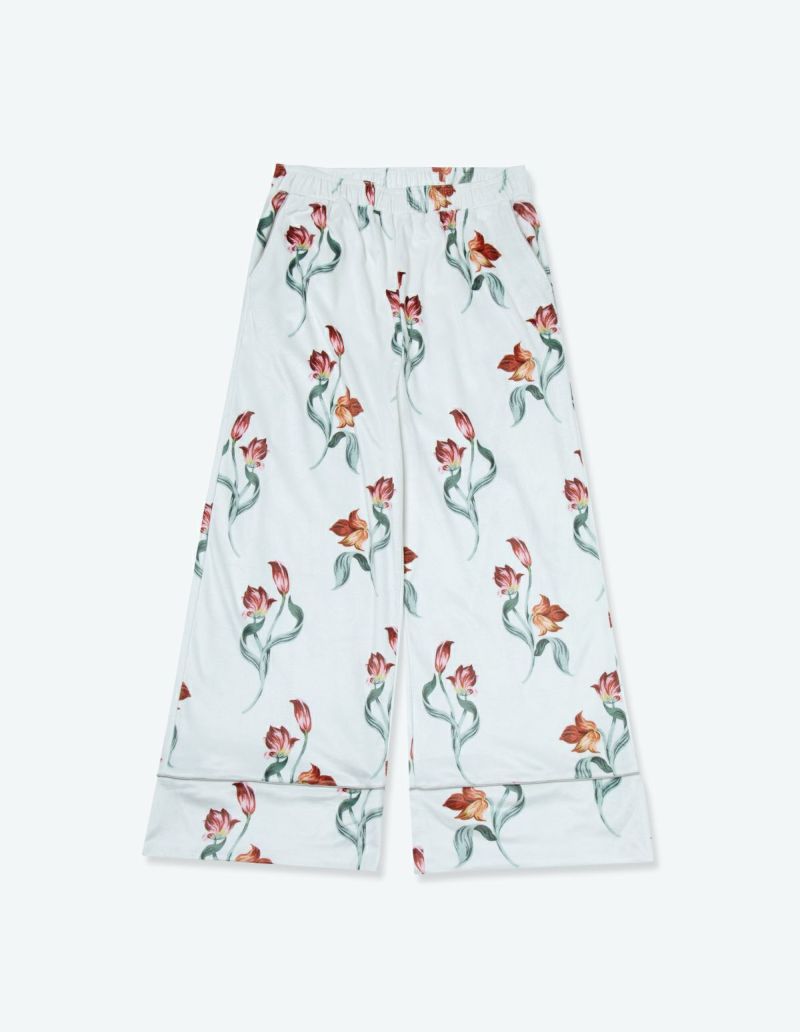 チューリップの持つ官能的なラインを抽出したフラワーパターンを、柔らかくしっとりとしたベロア生地プリントした長袖ロングパンツ。チューリップの花弁に優美にさす色と、葉っぱのラインとのコントラストでシックな印象にまとめたデザイン。着心地の柔らかなベロアは保温性も高く暖かく過ごしいただけます。 ペアアイテムとしてもおすすめ。