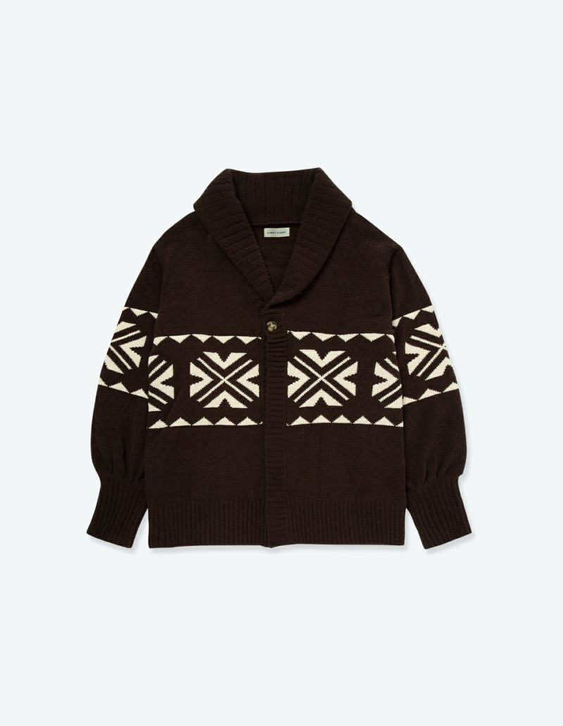 厚手のニットでありながら、ふんわりとしたモール糸のため軽やかな着心地のジャガードニットガウン 。大きくモチーフが編み込まれたカウチンライクデザインが特徴。 落ち着いたカーキとダークブラウンのカラー展開で他のアイテムとの相性も抜群。オーバーサイズで余裕のある形でありながら、パフデザインにすることでシルエットにアクセントもプラス。ルームウェアだけとしてではなく外着としても活躍します。