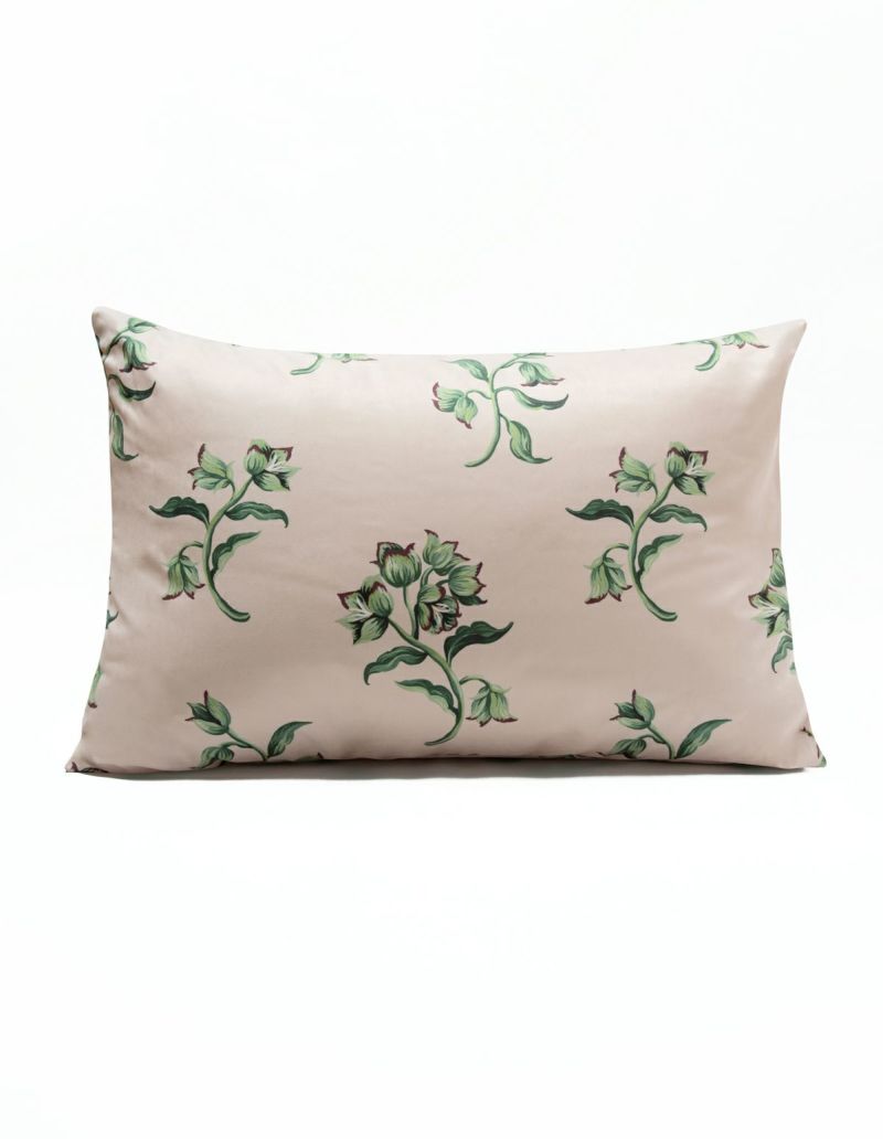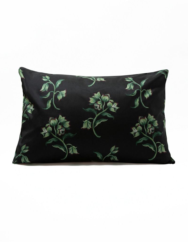クリスマスローズを大柄で施したフラワープリントのピローケース。少し起毛し、ナイロン配合でしっとりとした肌触り。華やかなピンクベースとシックなブラックベースでご用意。