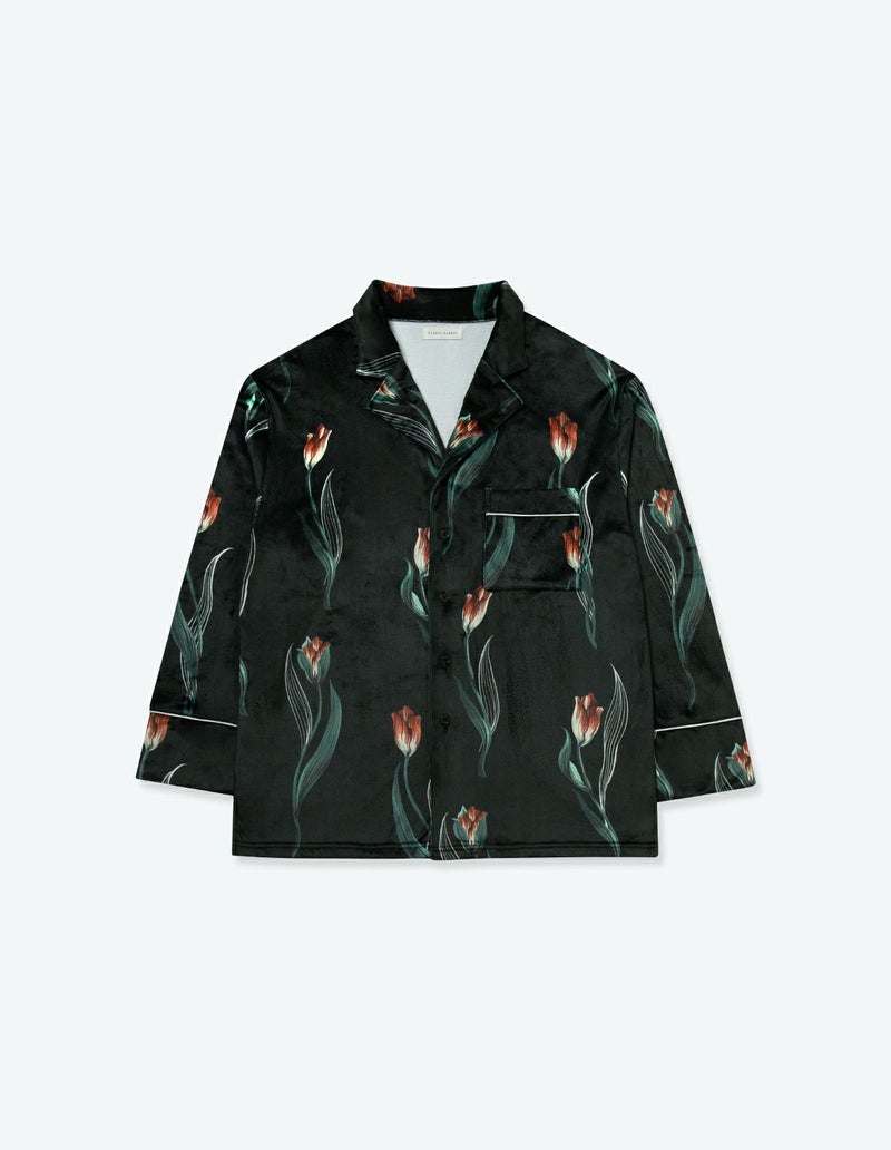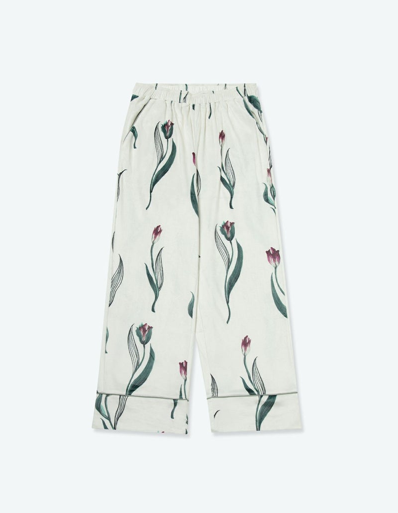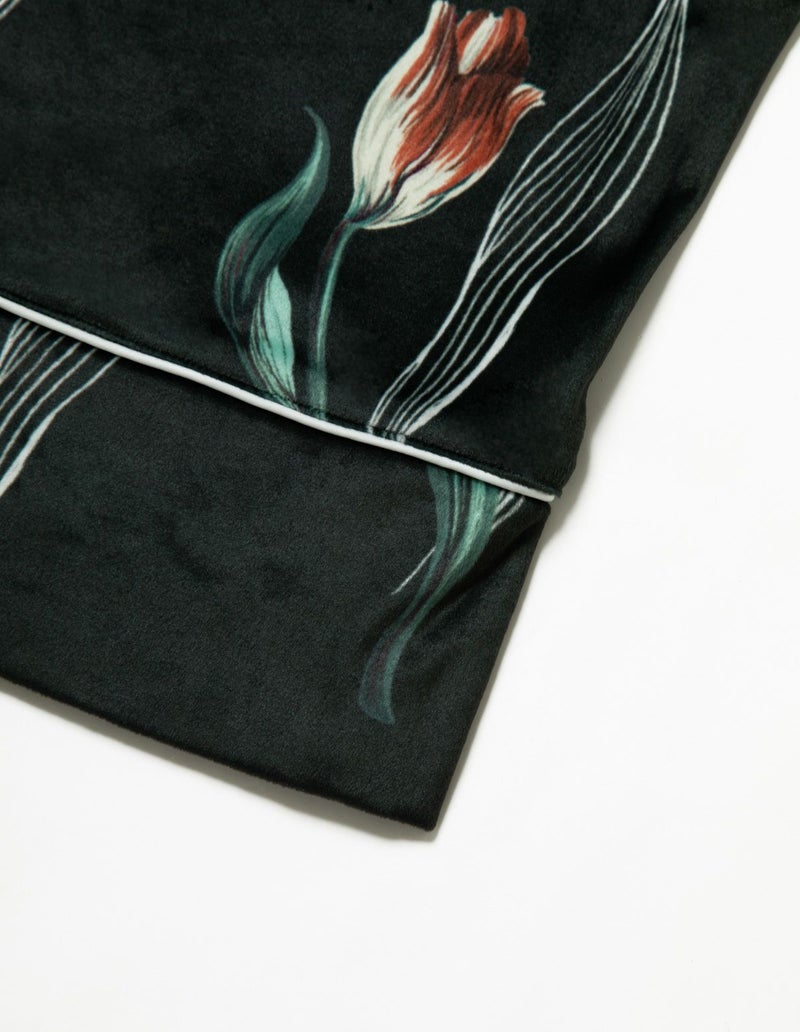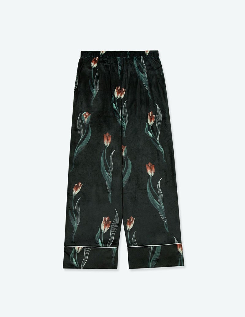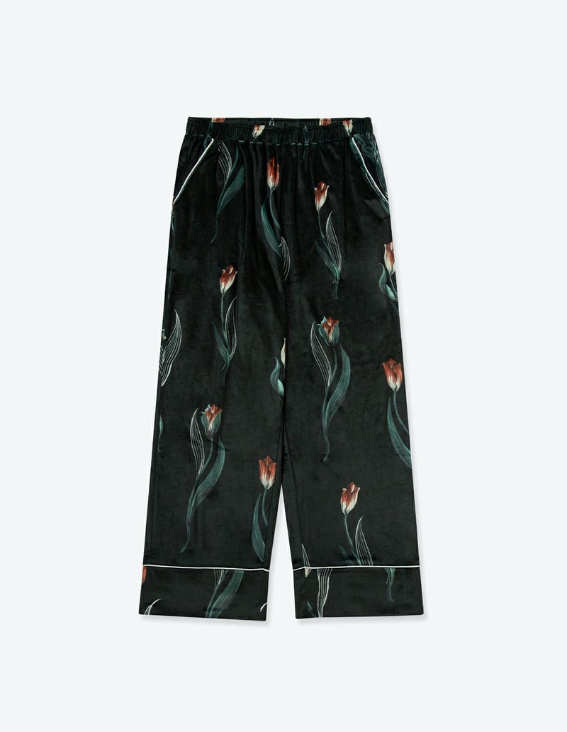 チューリップの持つ特徴的なラインを抽出したフラワーパターンを、柔らかくしっとりとしたベロア生地プリントした長袖ロングパンツ。チューリップの花弁に優美にさす色と、葉っぱのラインとのコントラストでシックな印象にまとめたデザイン。着心地の柔らかなベロアは保温性も高く暖かくお過ごしいただけます。 ペアアイテムとしてもおすすめ。