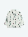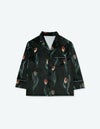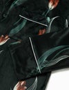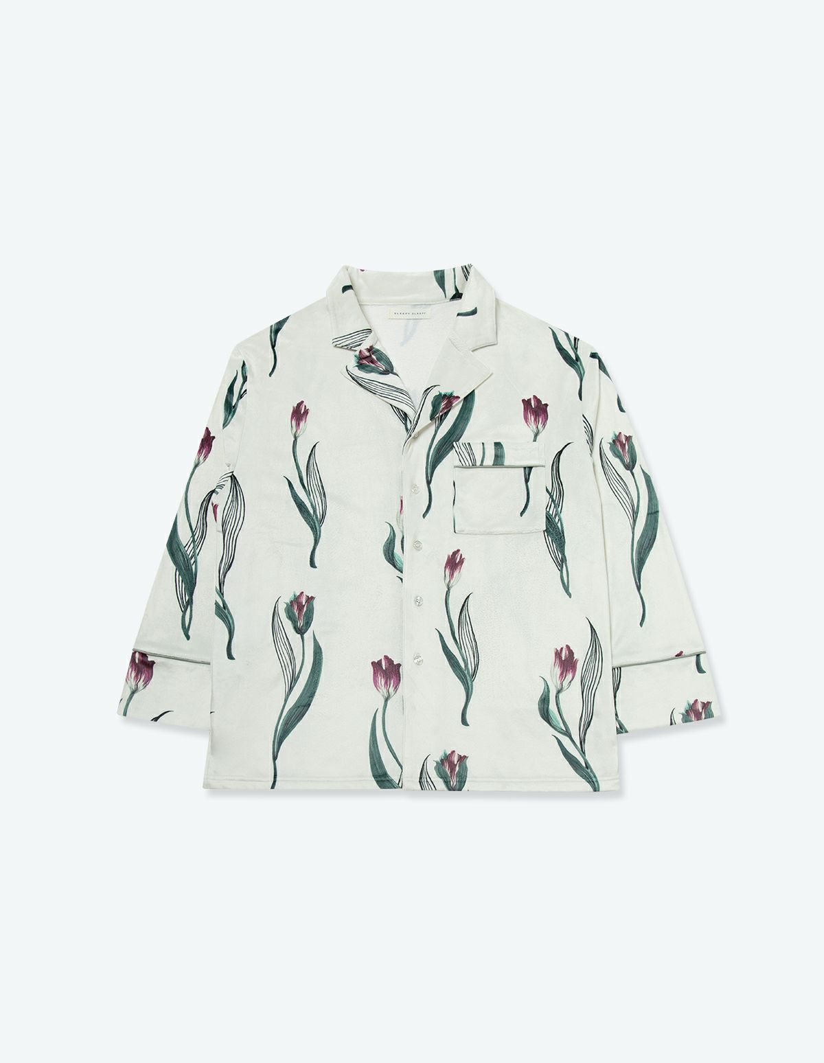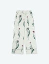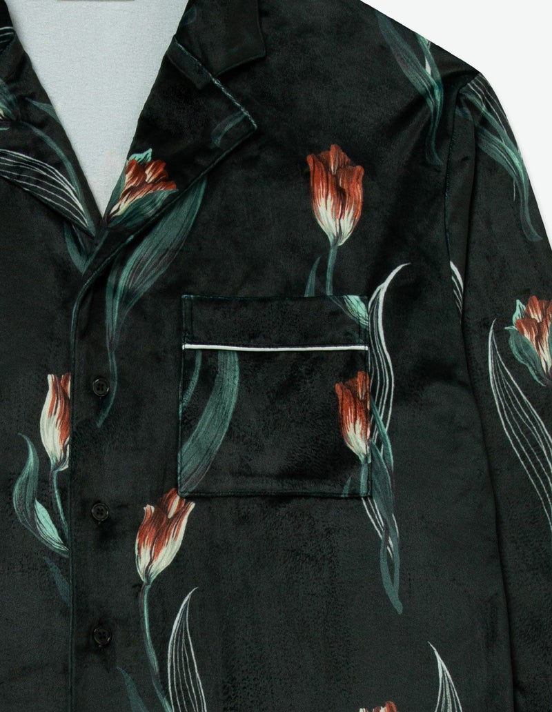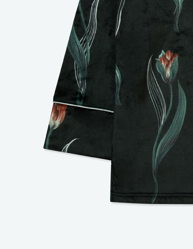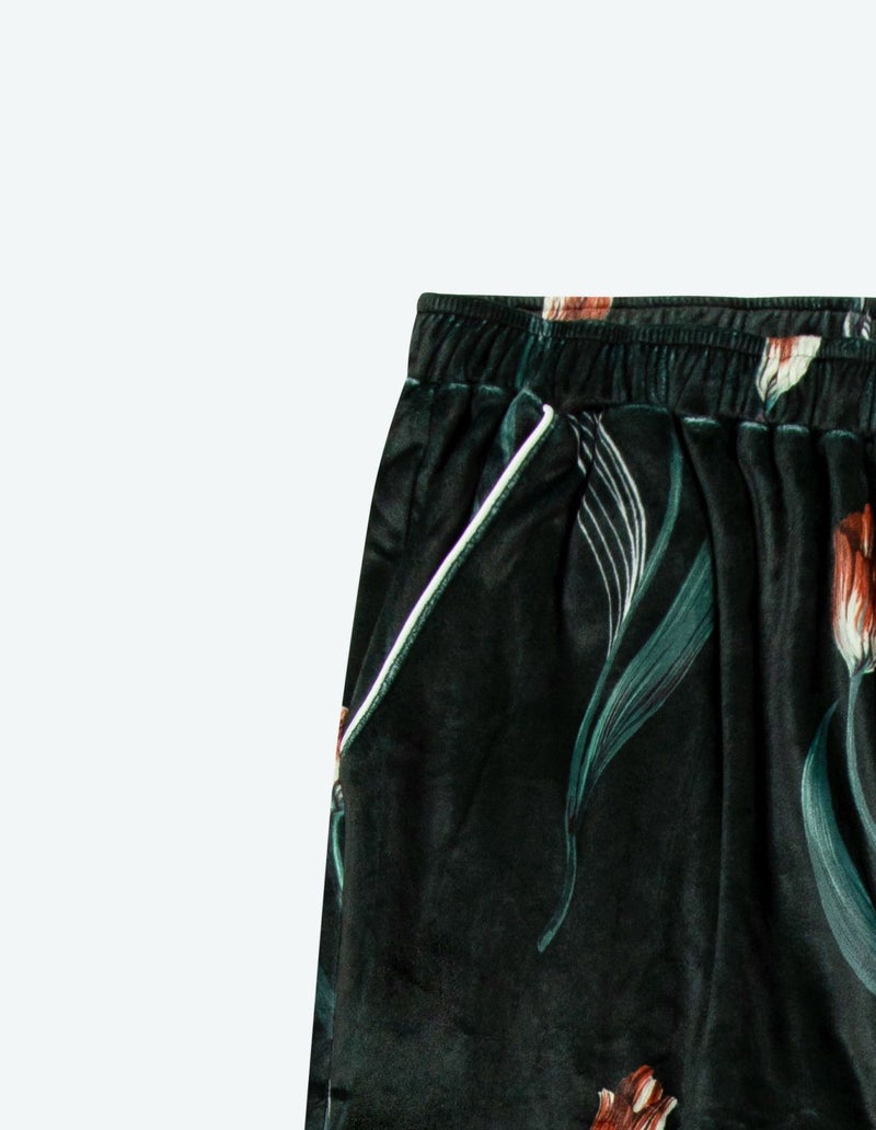 チューリップの持つ特徴的なラインを抽出したフラワーパターンを、柔らかくしっとりとしたベロア生地プリントした長袖ロングパンツ。チューリップの花弁に優美にさす色と、葉っぱのラインとのコントラストでシックな印象にまとめたデザイン。着心地の柔らかなベロアは保温性も高く暖かくお過ごしいただけます。 ペアアイテムとしてもおすすめ。