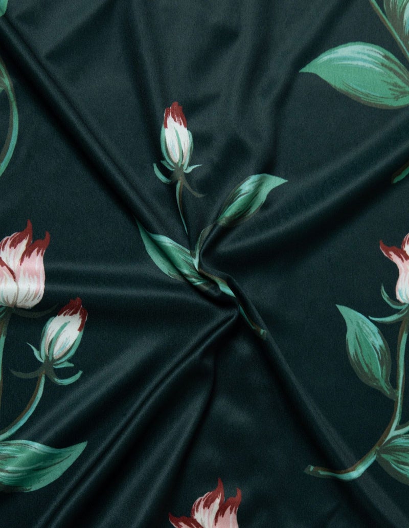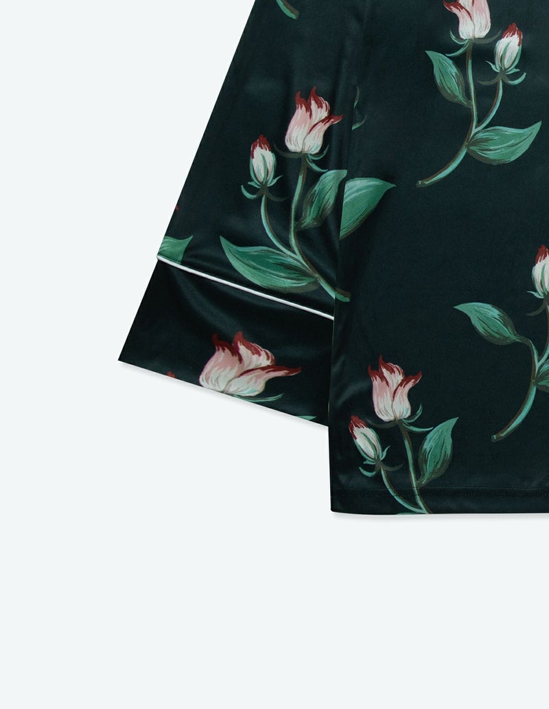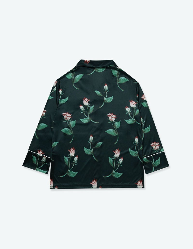 ドリーミングローズとよばれるバラをデザインしたフラワーパジャマ。ローズの赤い差し色で華やかさがありつつ華奢なラインの美しさを表現。 着丈のゆったりとしたデザインと落ち感のある生地が相まって上品な印象に。 ペアアイテムとしてもおすすめです。