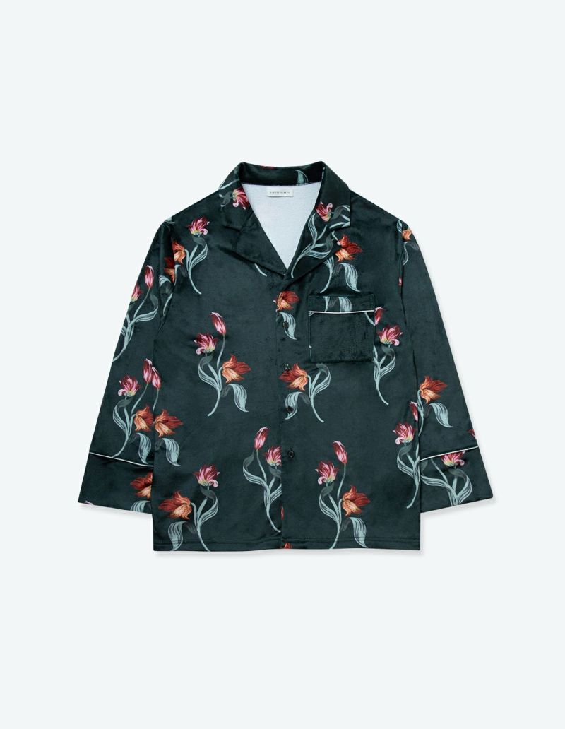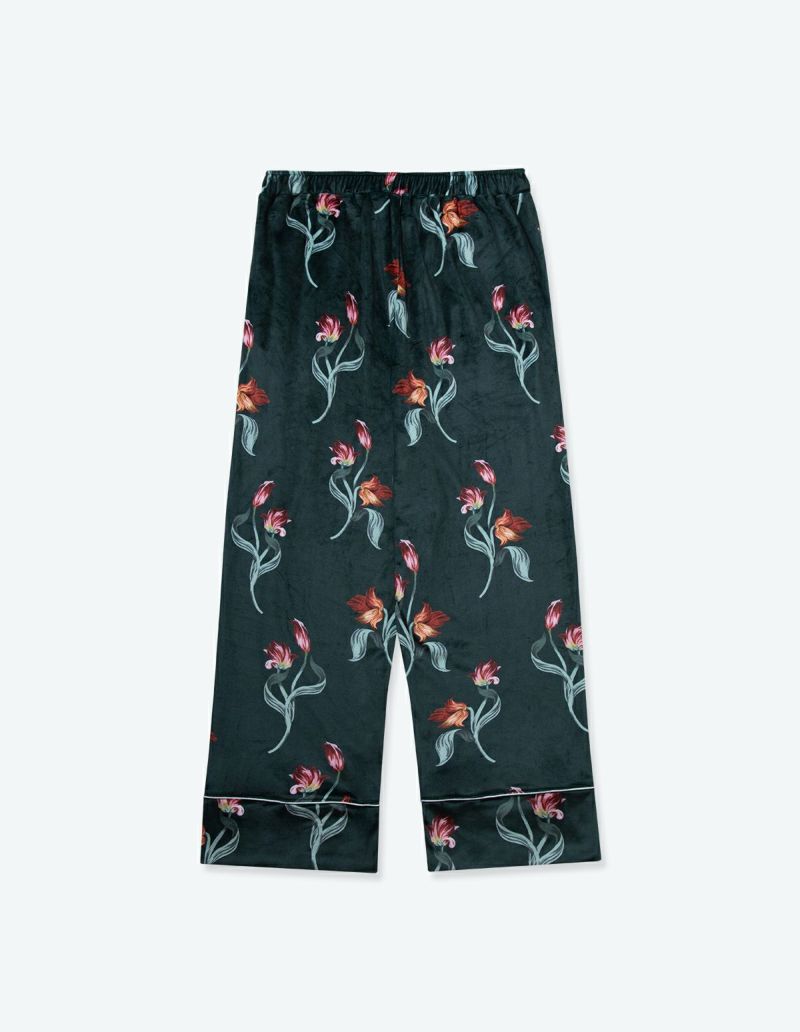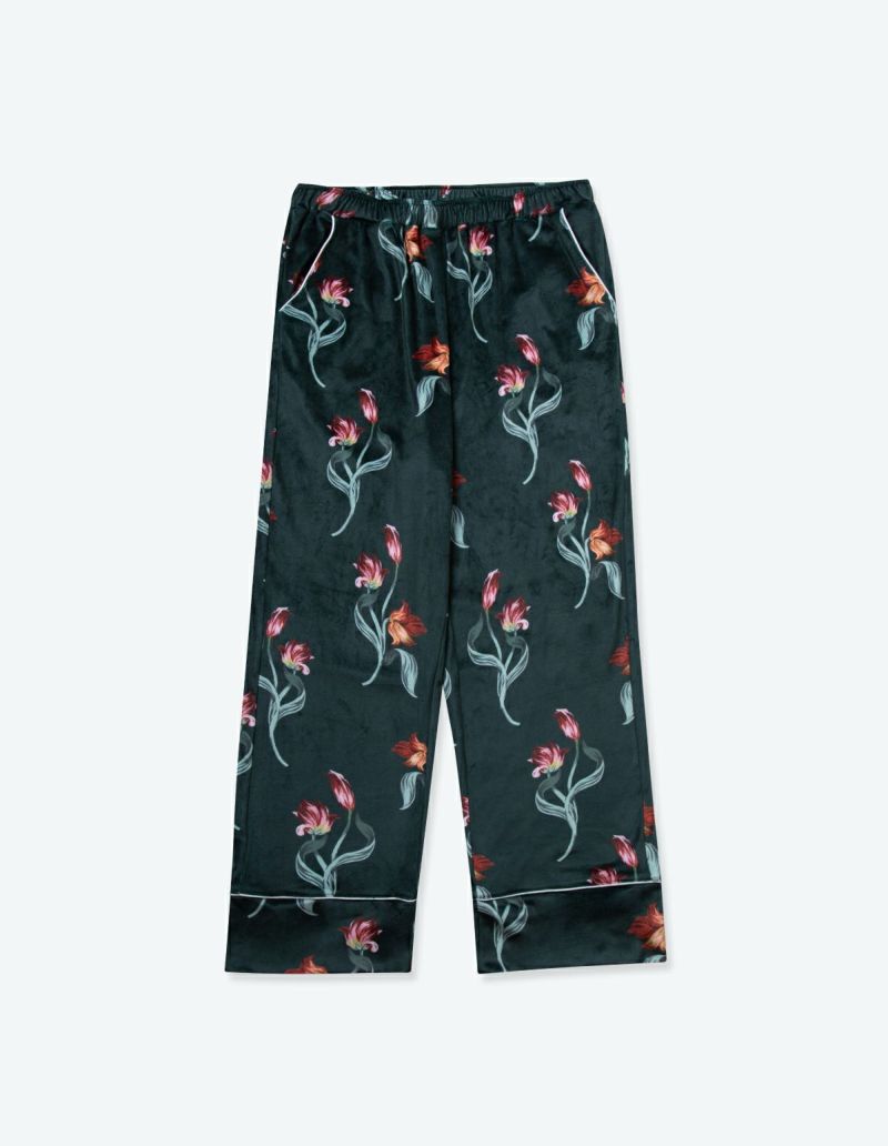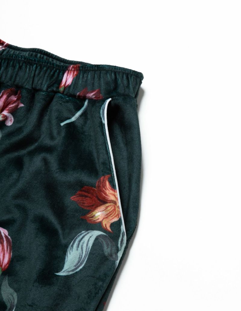 チューリップの持つ官能的なラインを抽出したフラワーパターンを、柔らかくしっとりとしたベロア生地プリントした長袖ロングパンツ。チューリップの花弁に優美にさす色と、葉っぱのラインとのコントラストでシックな印象にまとめたデザイン。着心地の柔らかなベロアは保温性も高く暖かく過ごしいただけます。 ペアアイテムとしてもおすすめ。