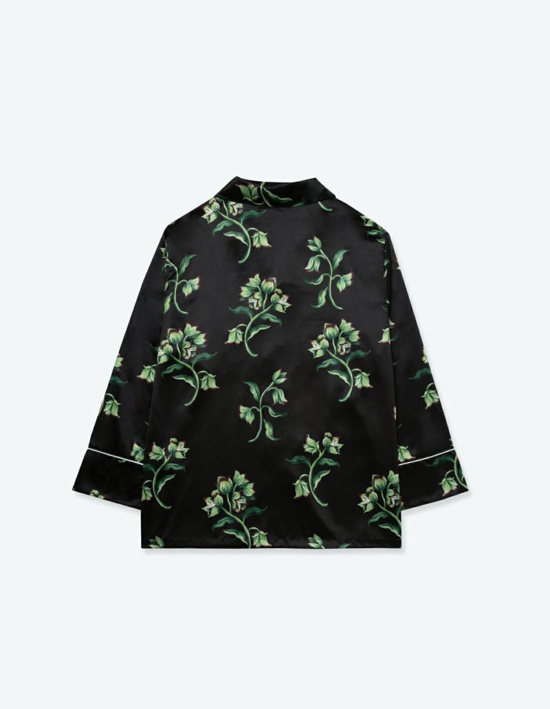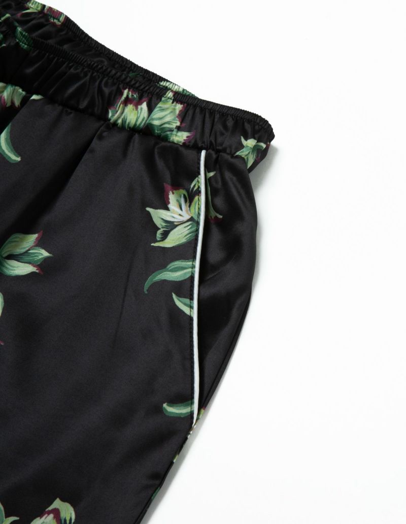 クリスマスローズを大柄で施したフラワープリントの長袖ロングパンツセット。微光沢のサテン生地がさらりとした肌触りで、シーズンレスに着用可能な素材です。シックなブラックベースでご用意。レディースとのペアアイテムとしてもおすすめです。