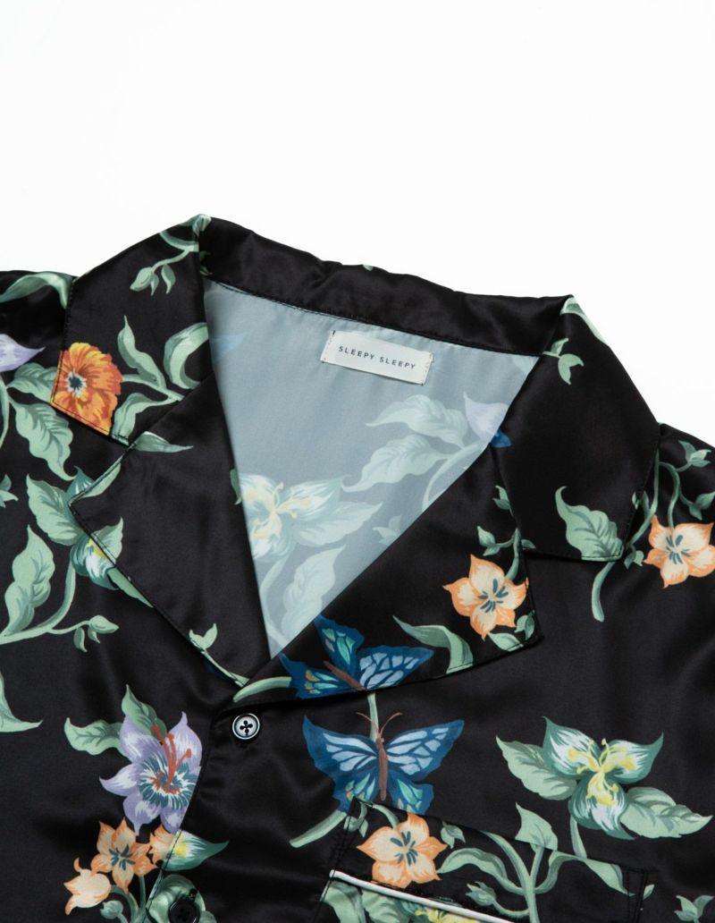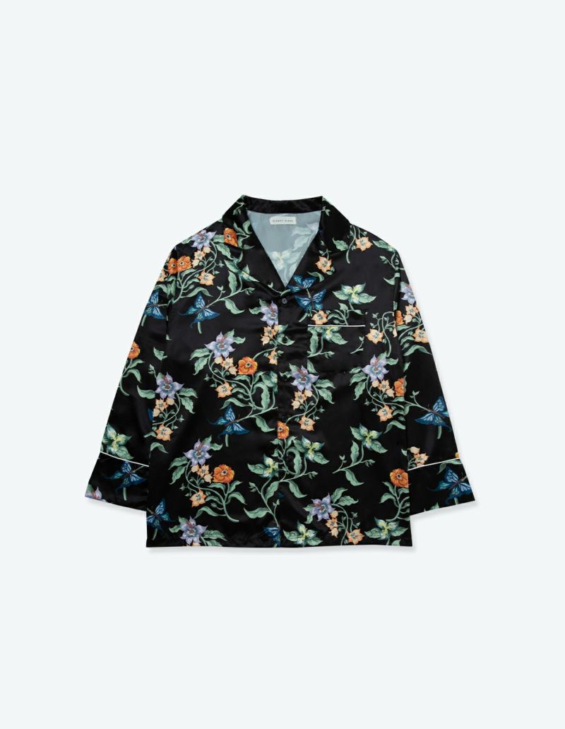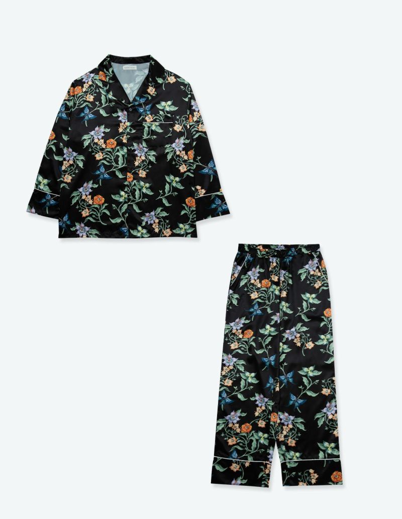 咲き誇る花々を描いたフラワープリントの長袖ロングパンツセット。微光沢のサテン生地がさらりとした肌触りで、シーズンレスに着用可能な素材です。淡いアイボリーベースとシックなブラックベースでご用意。ペアアイテムとしてもおすすめです。