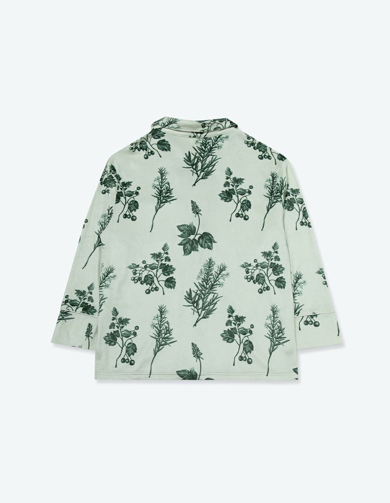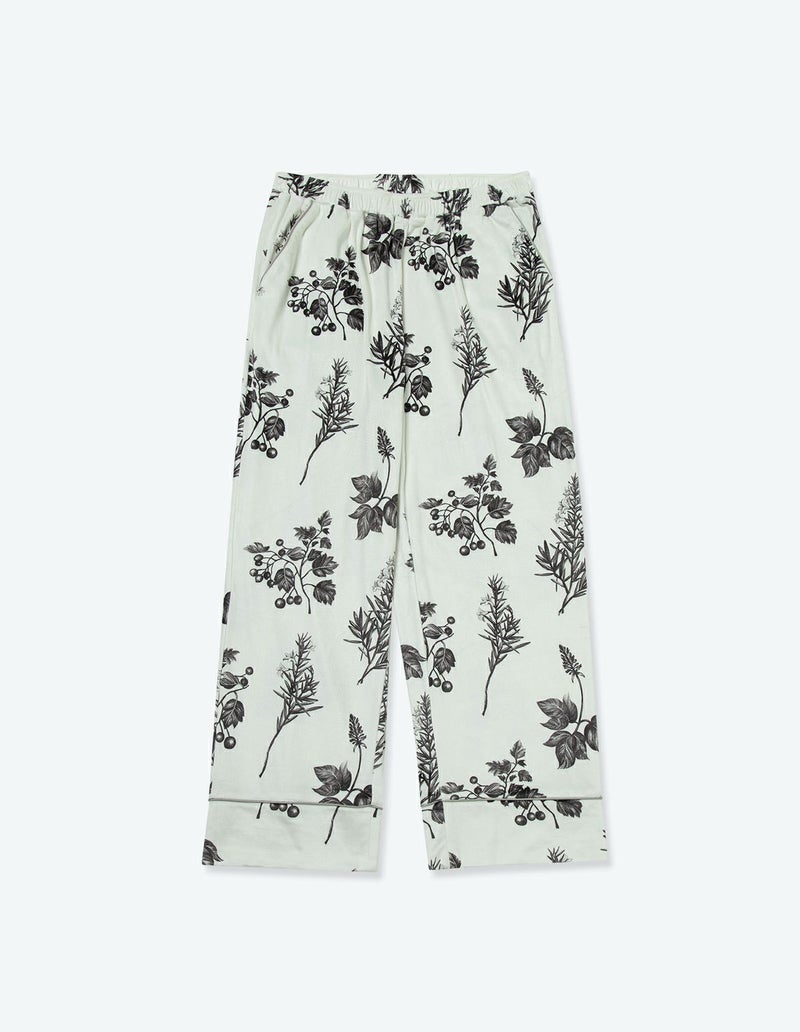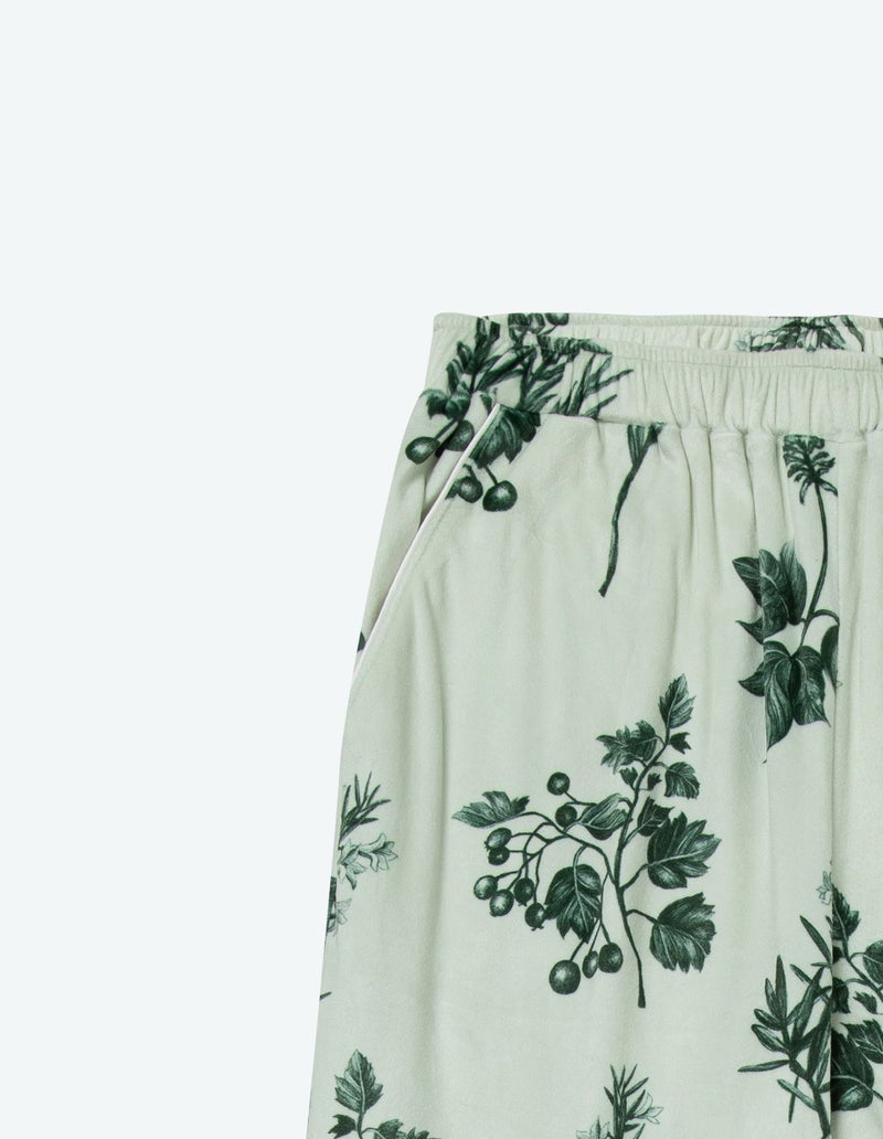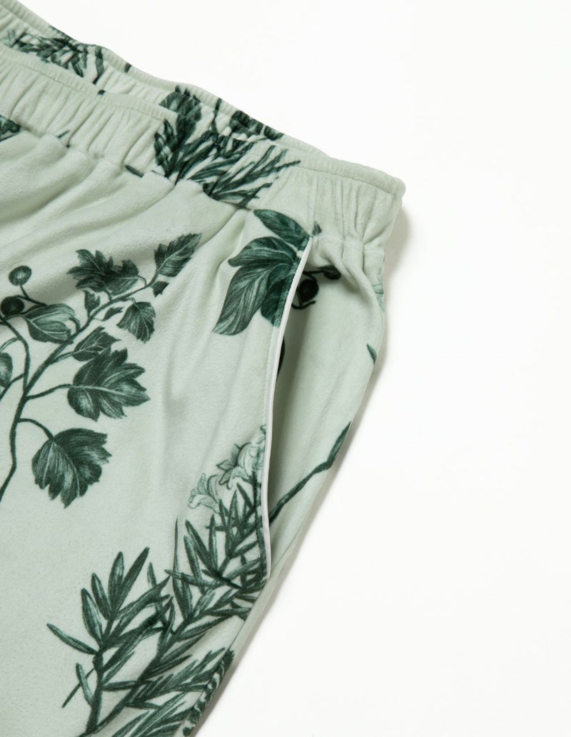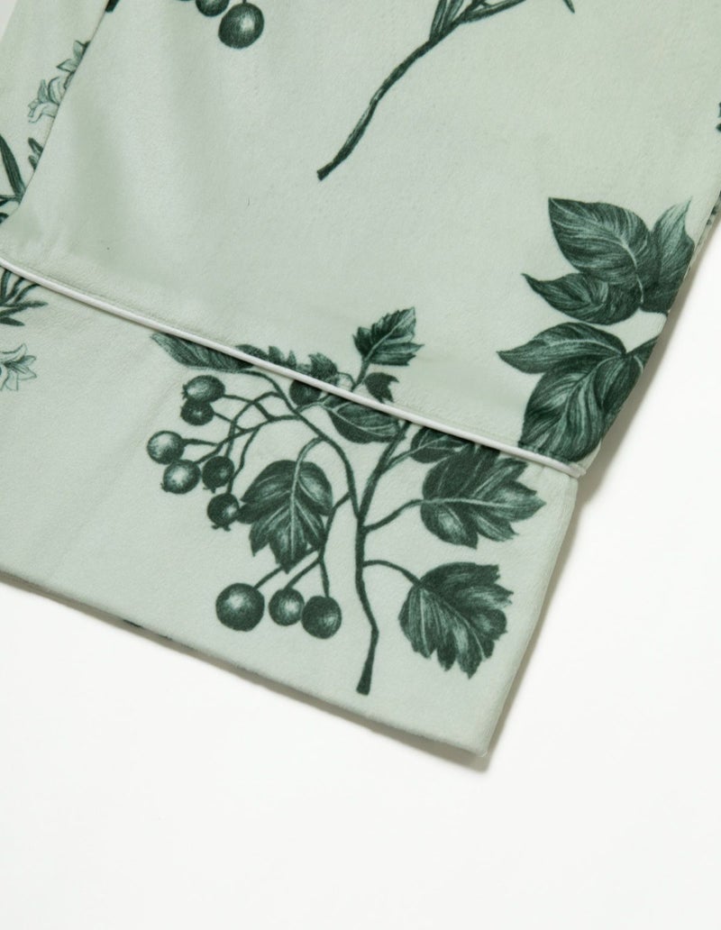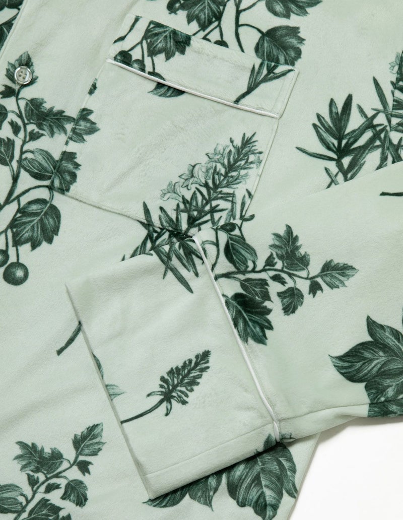 野に咲くハーブを銅版画のようなタッチで描いたフラワーパターンを、柔らかくしっとりとしたベロア生地プリントした長袖ロングパンツ。 繊細に描かれたハーブの凛とした印象で、やわらかなベロアパジャマをシックにまとめました。 着心地の柔らかなベロアは保温性も高く暖かくお過ごしいただけます。 ペアアイテムとしてもおすすめ。