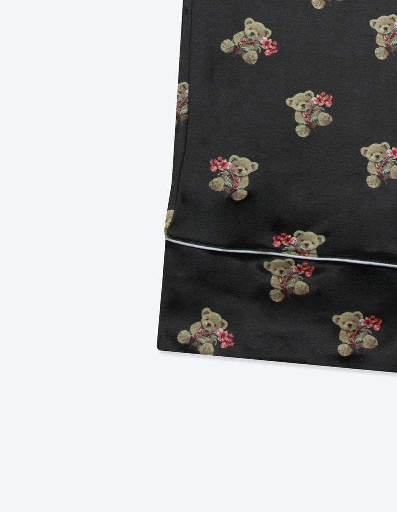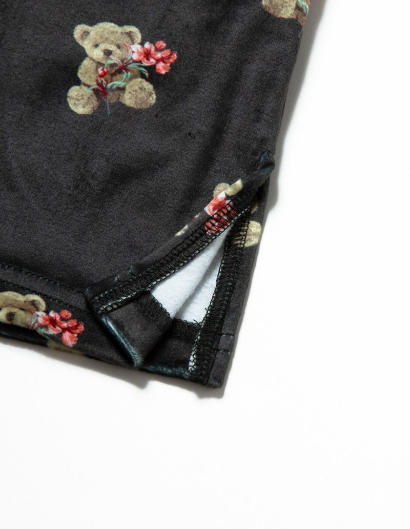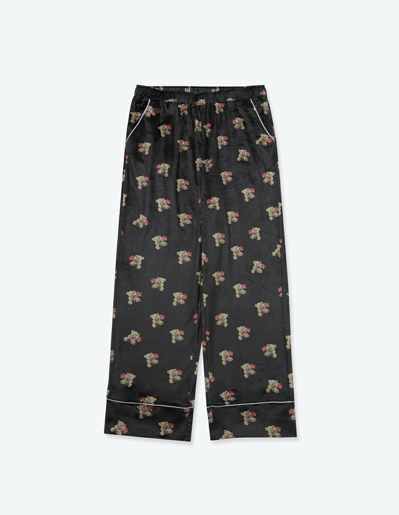 花束を抱いたベアを柔らかくしっとりとしたベロア生地プリントした長袖ロングパンツ。キュートなモチーフをSLEEPYらしいニュアンスカラーにまとめ大人っぽいプリントに。着心地の柔らかなベロアは保温性も高く暖かく過ごしいただけます。 ペアアイテムとしてもおすすめ。