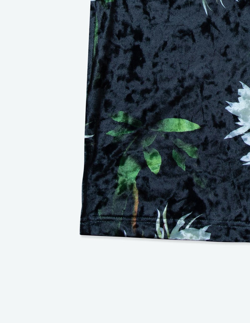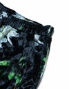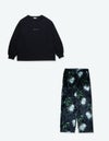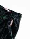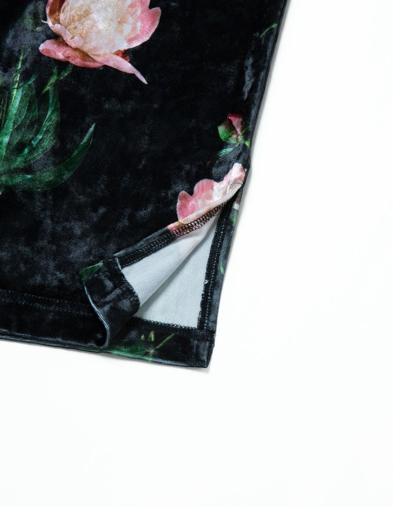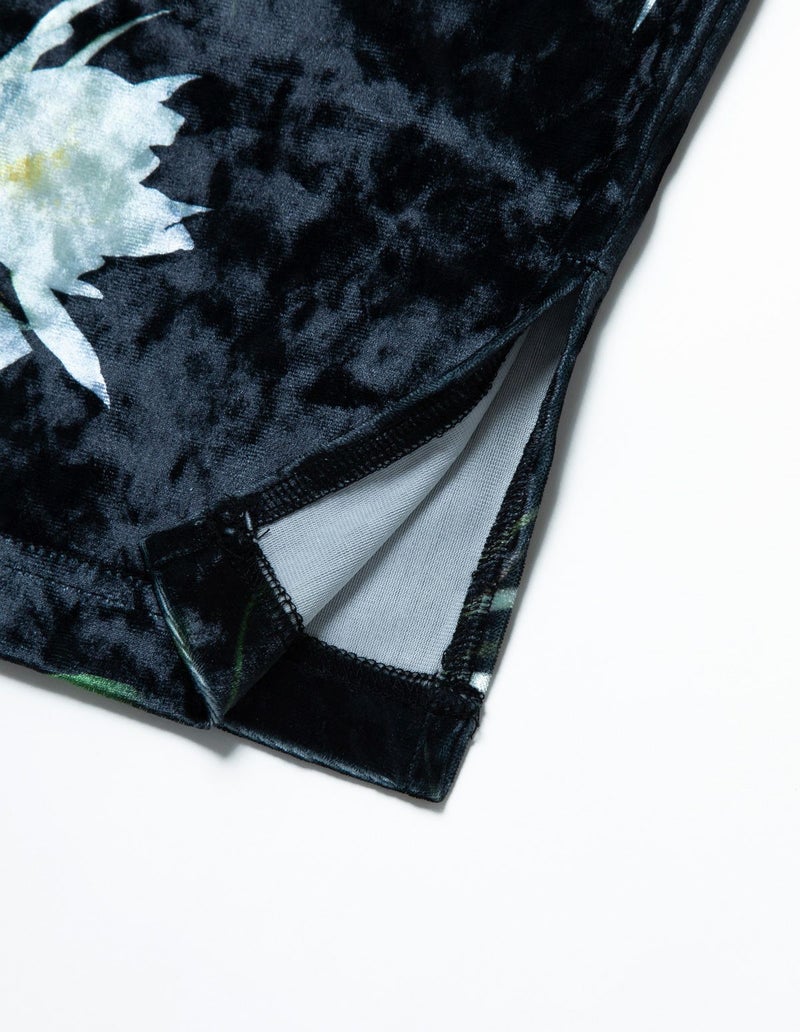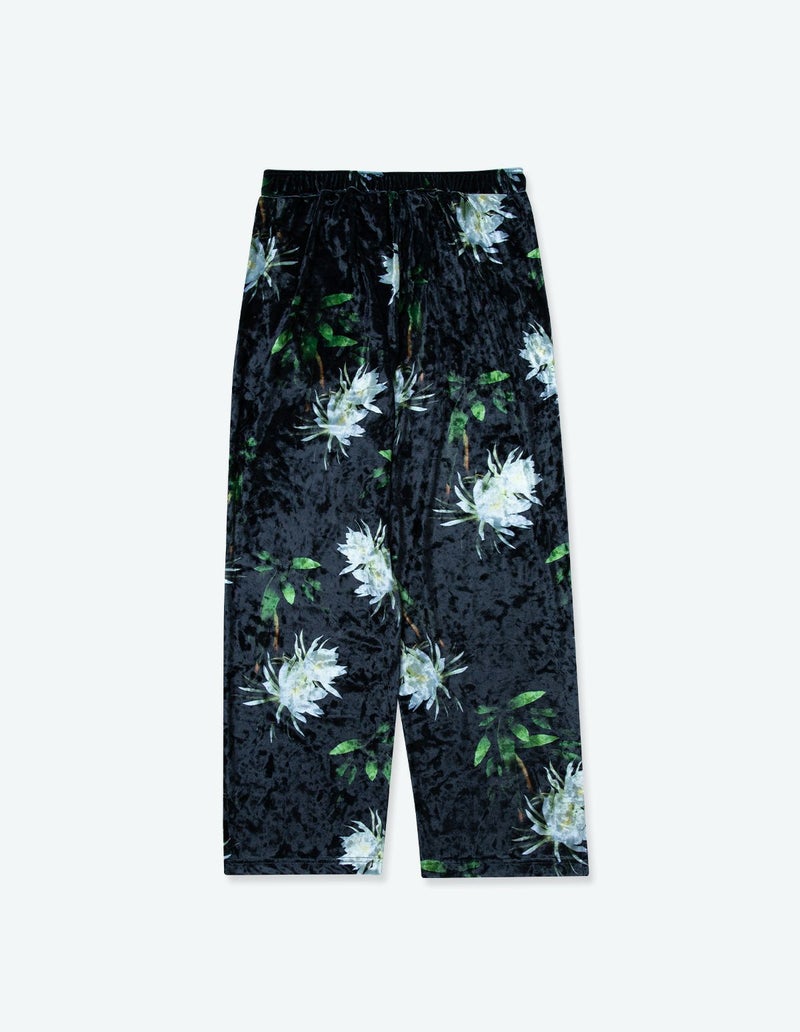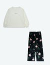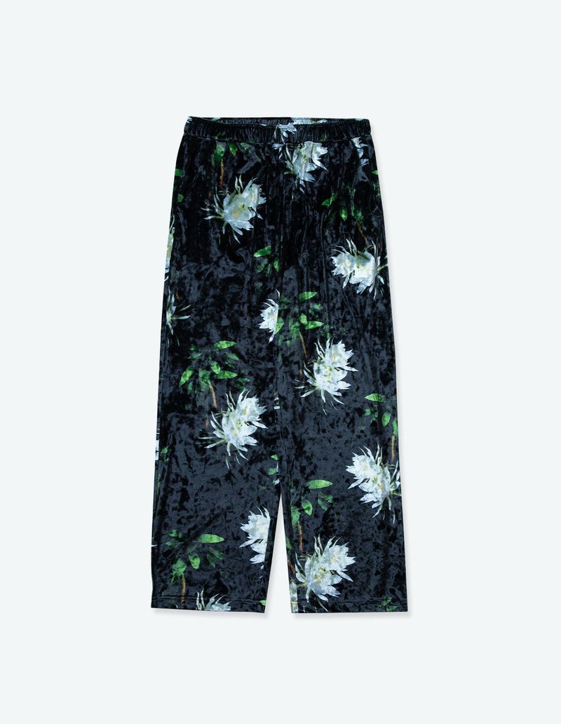 パフスリーブデザインにロゴ刺繍Tシャツに、ベロアプリントパンツをセットした人気のユニセックスセットアップ。ベロアパンツはトップスカラーによってデザインが異なります。アイボリーには鮮やかなピオニーを、ブラックには月下美人をプリント。