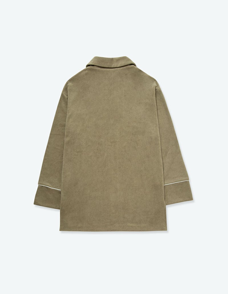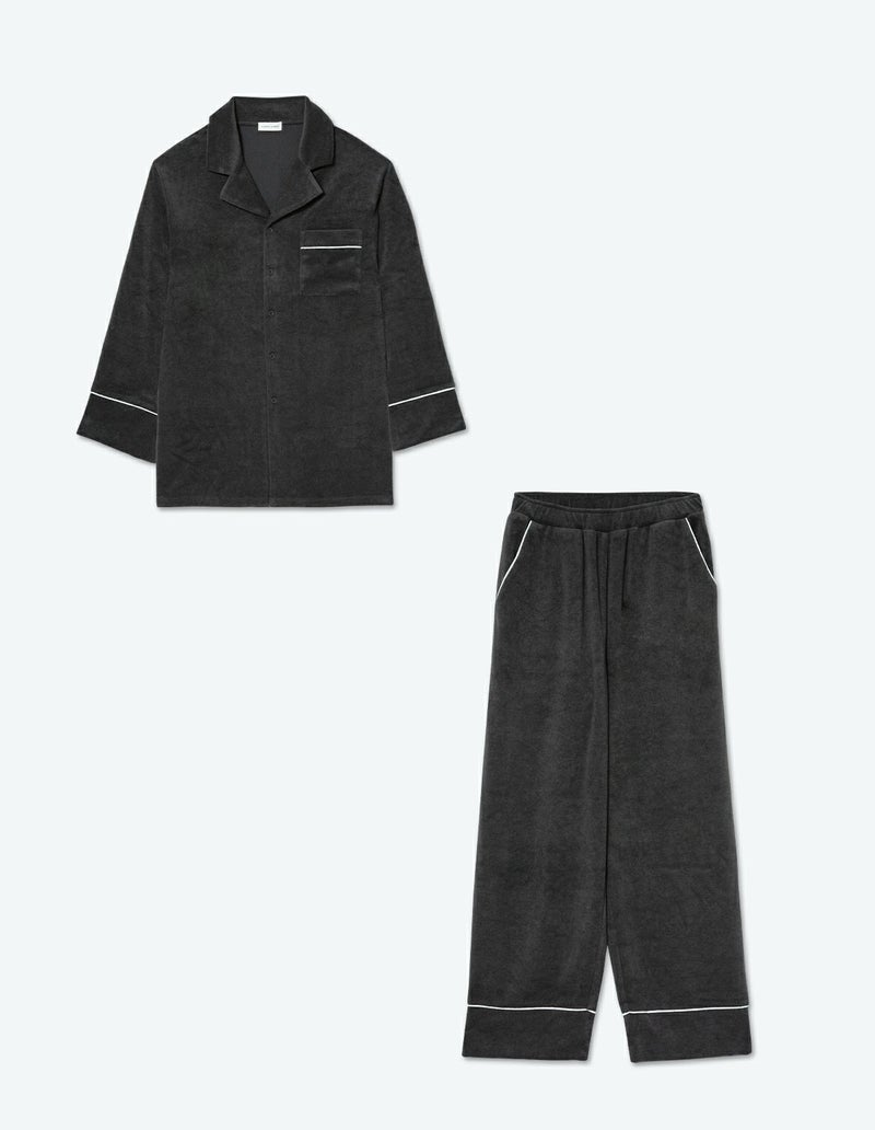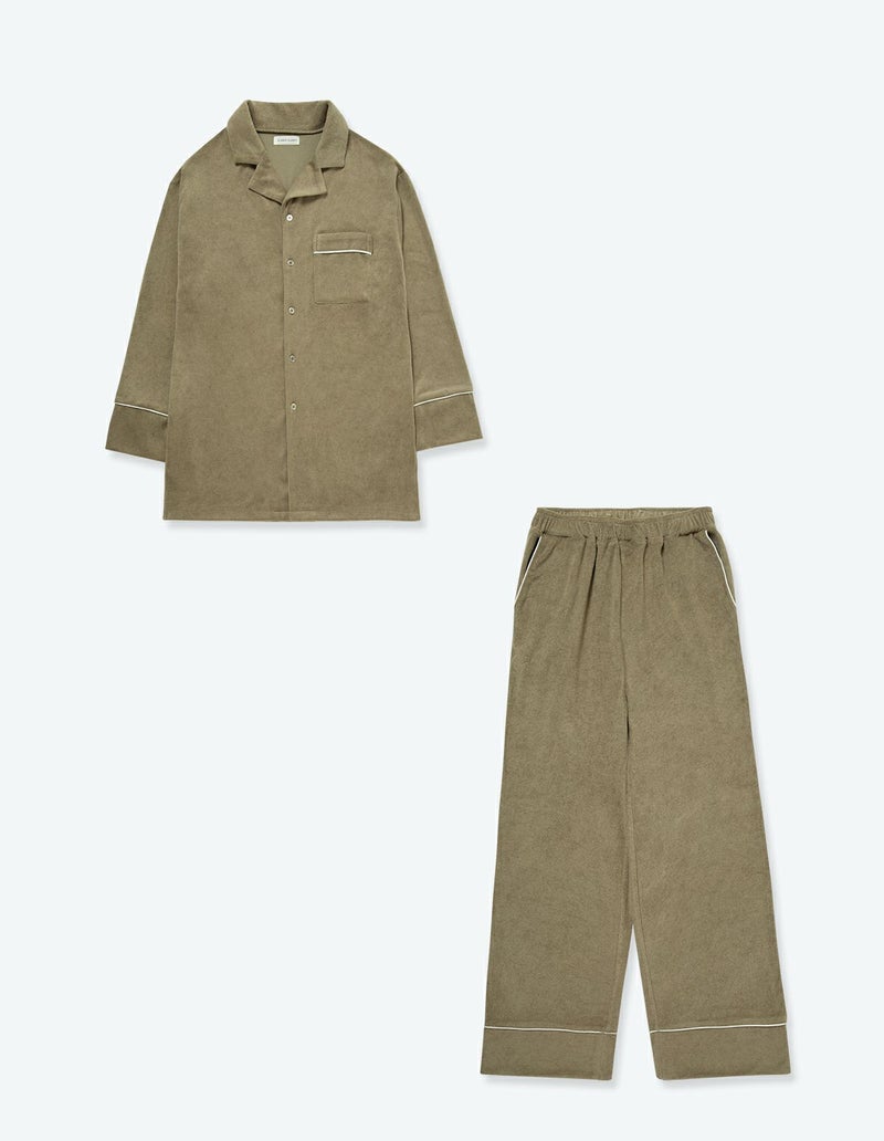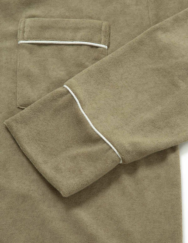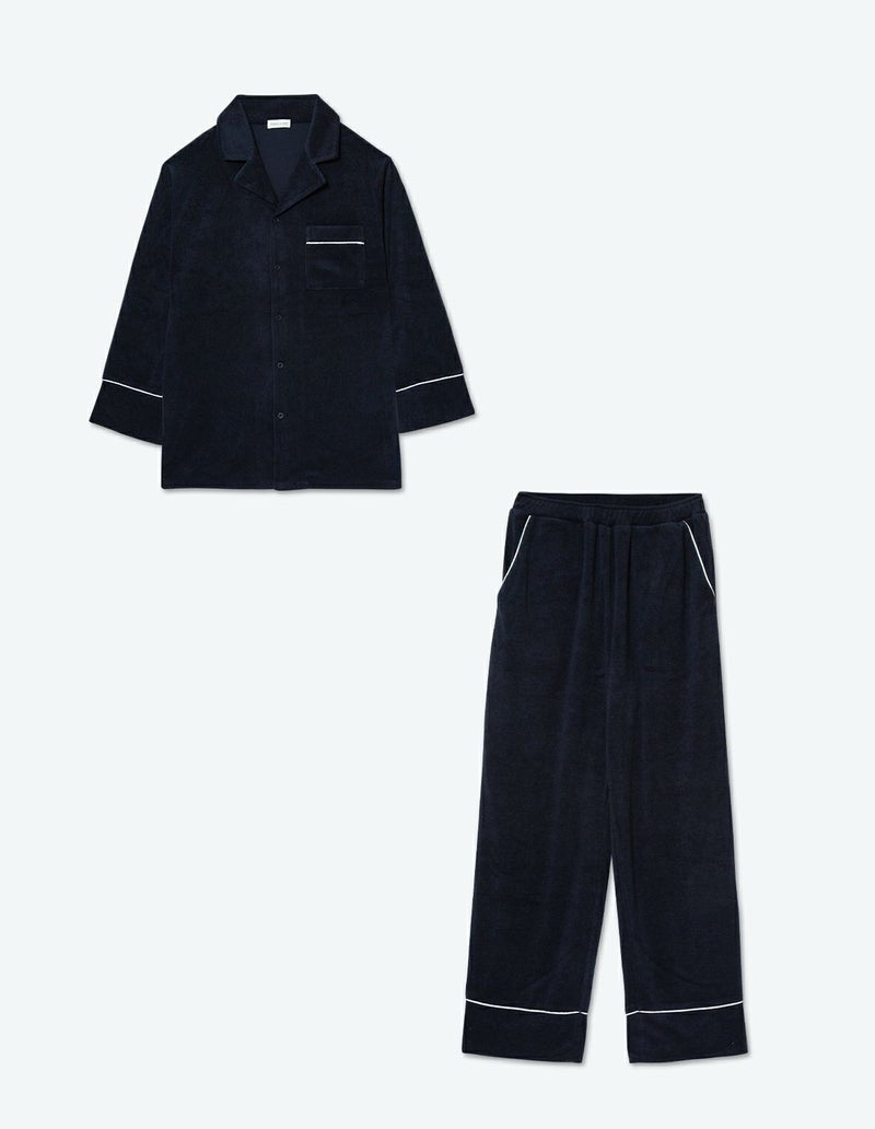 柔らかな肌触りのメンズパイルパジャマ長袖ロングパンツセット。ゆったりとしたシルエットでベーシックなシャツデザインに袖口とポケットのパイピングでアクセントをプラス。厚手の素材ながらもスッキリとしたシルエットに仕上げました。ペアアイテムとしてもおすすめです。