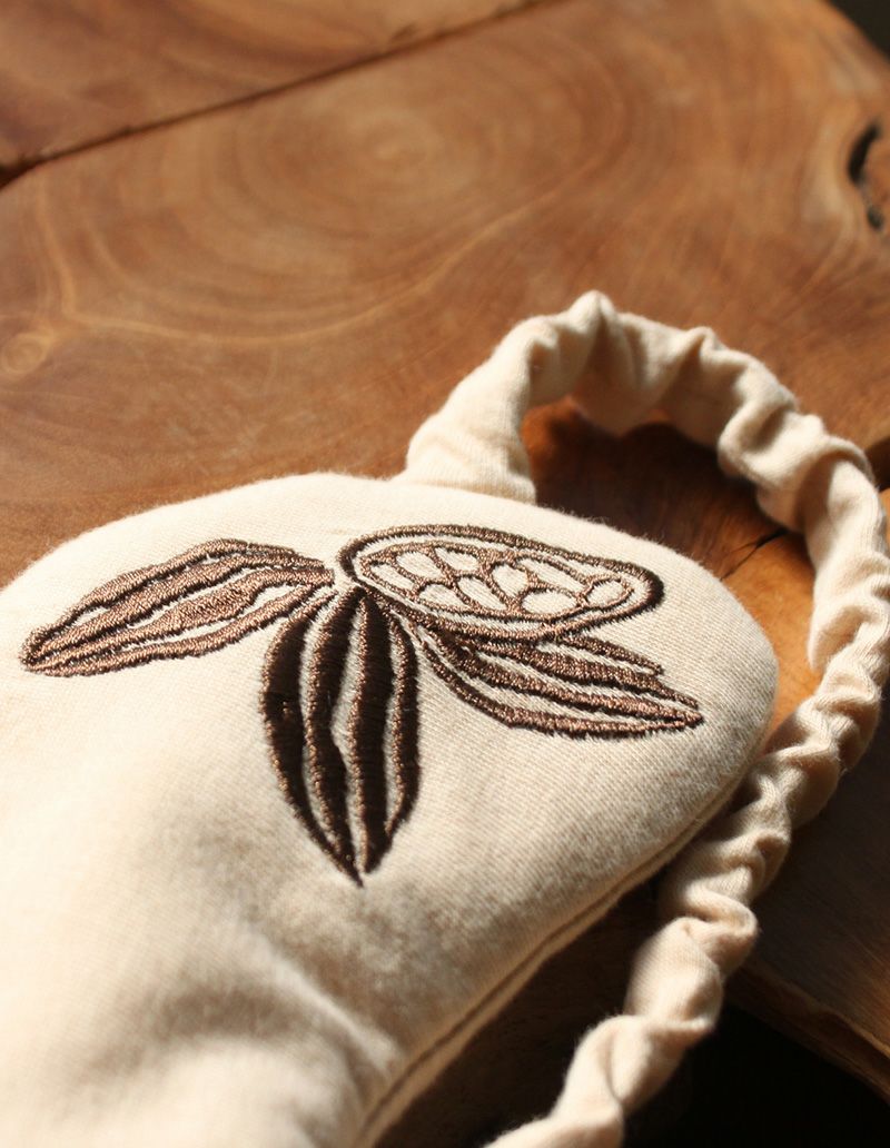 デザインはカカオの美しい果実のフォルムを、 SLEEPY SLEEPYならではの華やかな描写、 そして今回は繊細な刺繍でカカオ豆を表現した風合いある一点に仕上げています。