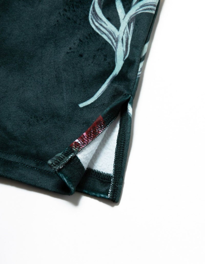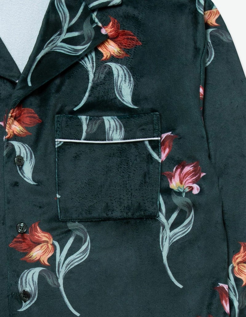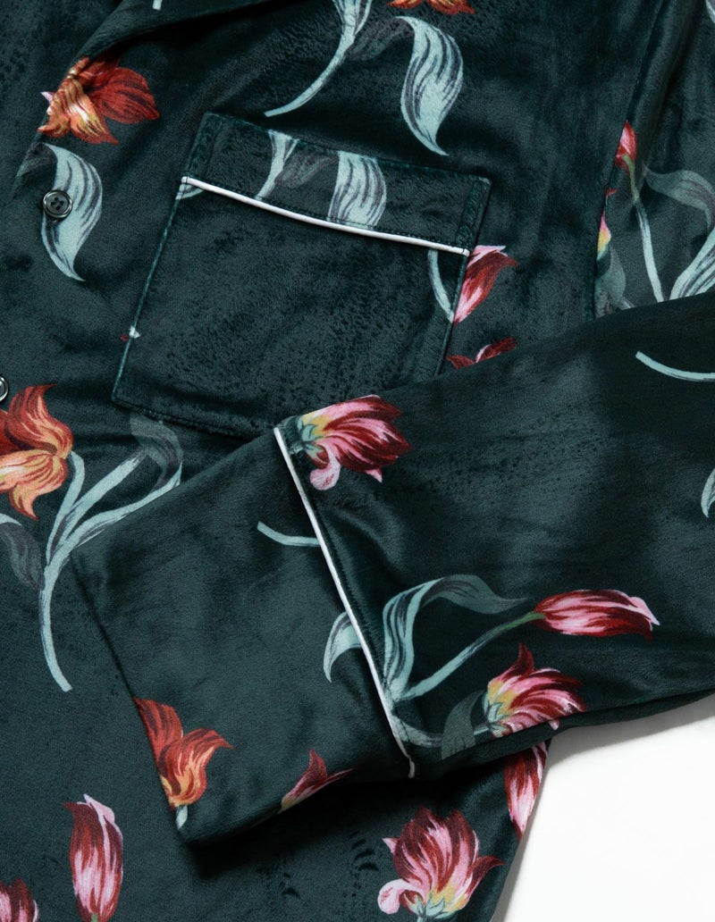 チューリップの持つ官能的なラインを抽出したフラワーパターンを、柔らかくしっとりとしたベロア生地プリントした長袖ロングパンツ。チューリップの花弁に優美にさす色と、葉っぱのラインとのコントラストでシックな印象にまとめたデザイン。着心地の柔らかなベロアは保温性も高く暖かく過ごしいただけます。 ペアアイテムとしてもおすすめ。