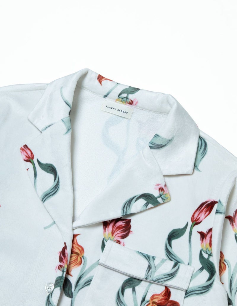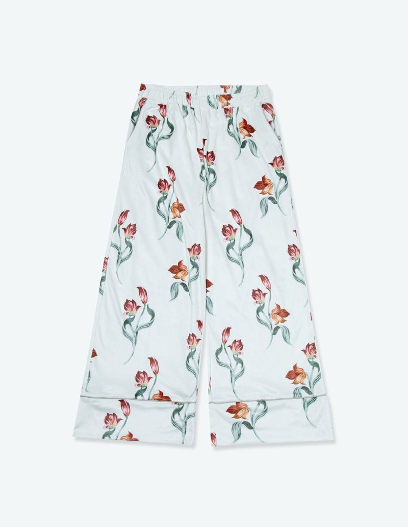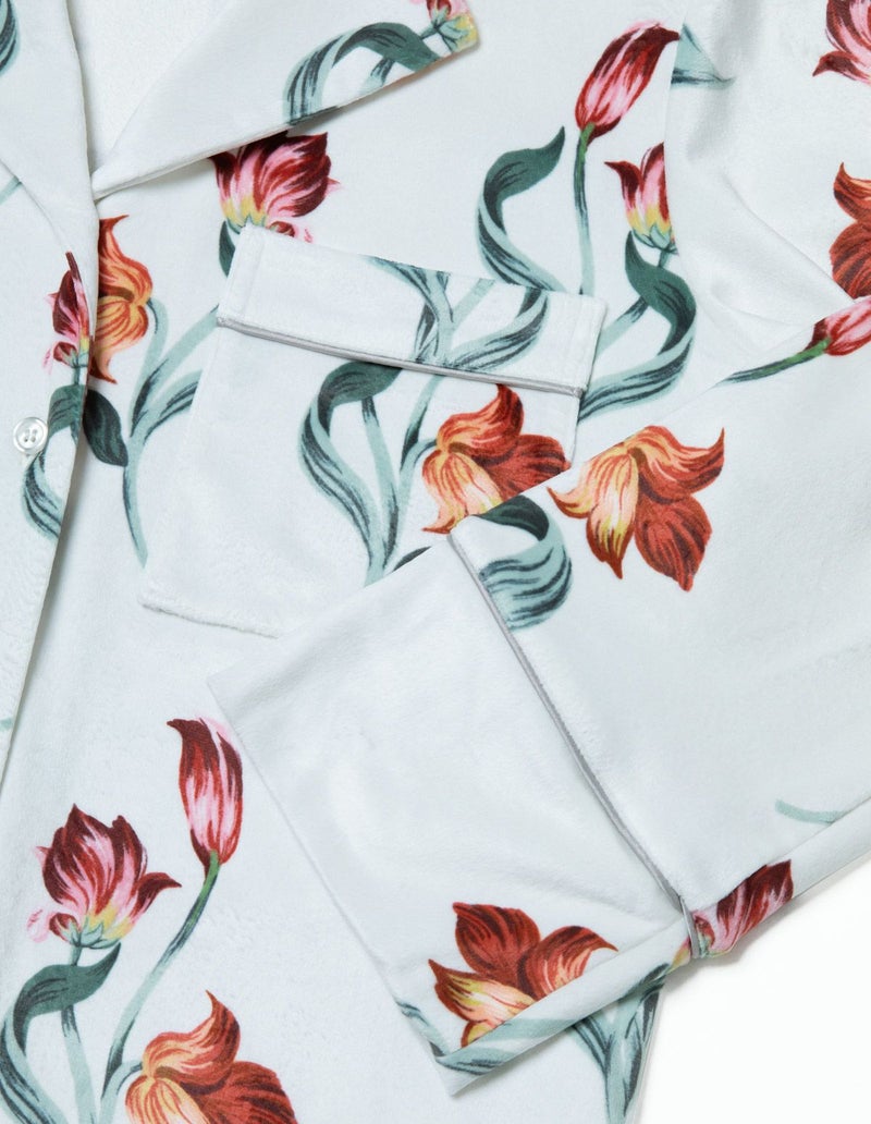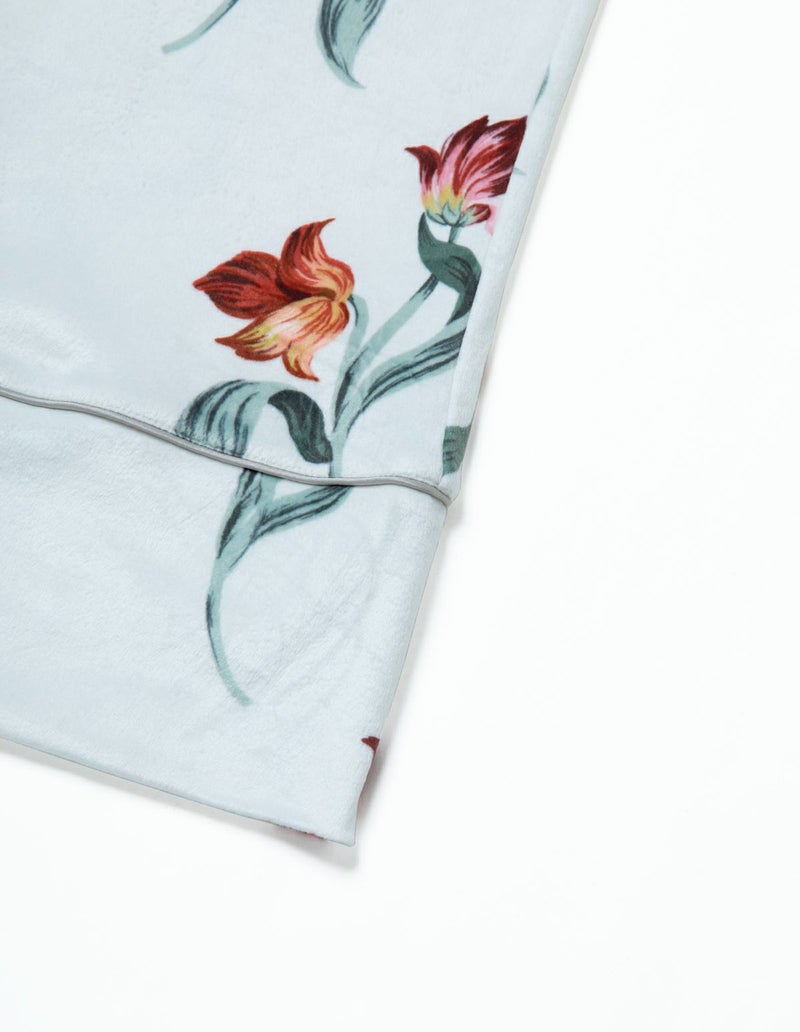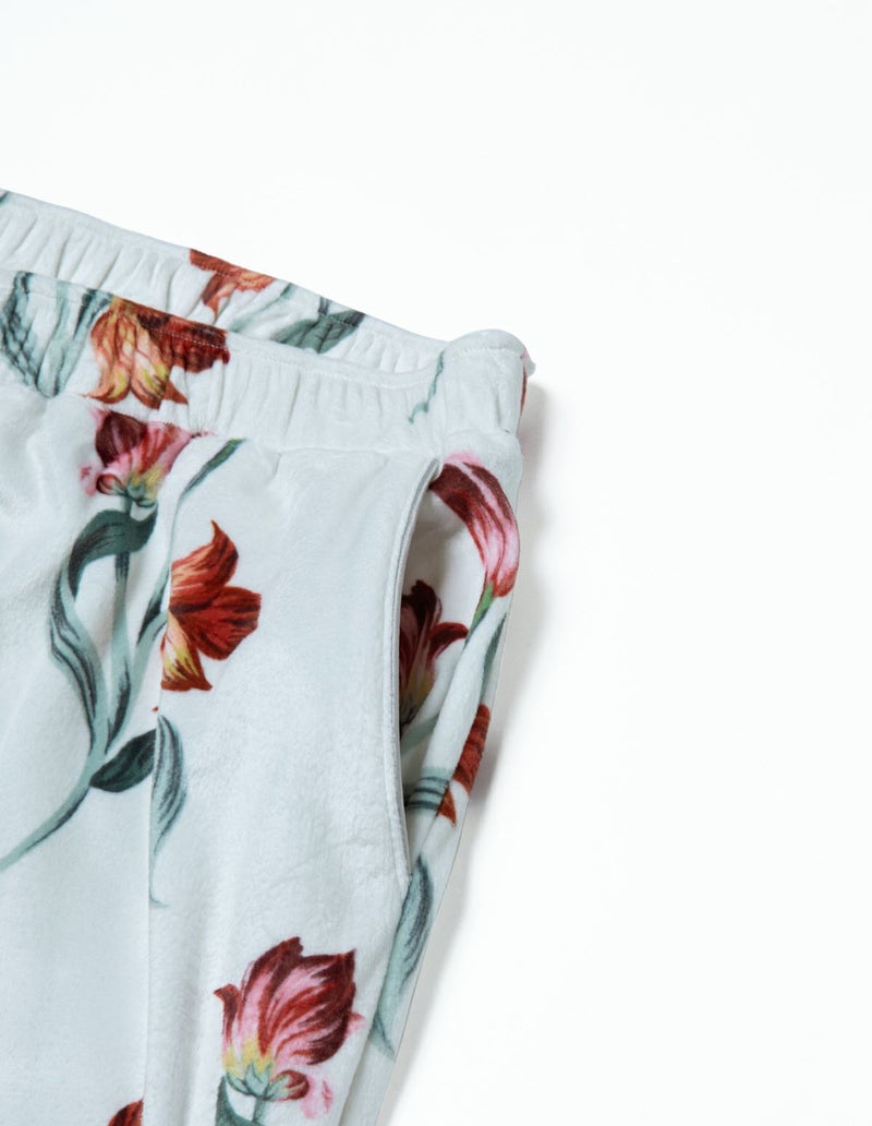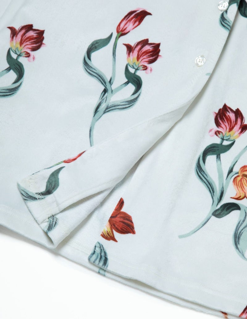チューリップの持つ官能的なラインを抽出したフラワーパターンを、柔らかくしっとりとしたベロア生地プリントした長袖ロングパンツ。チューリップの花弁に優美にさす色と、葉っぱのラインとのコントラストでシックな印象にまとめたデザイン。着心地の柔らかなベロアは保温性も高く暖かく過ごしいただけます。 ペアアイテムとしてもおすすめ。