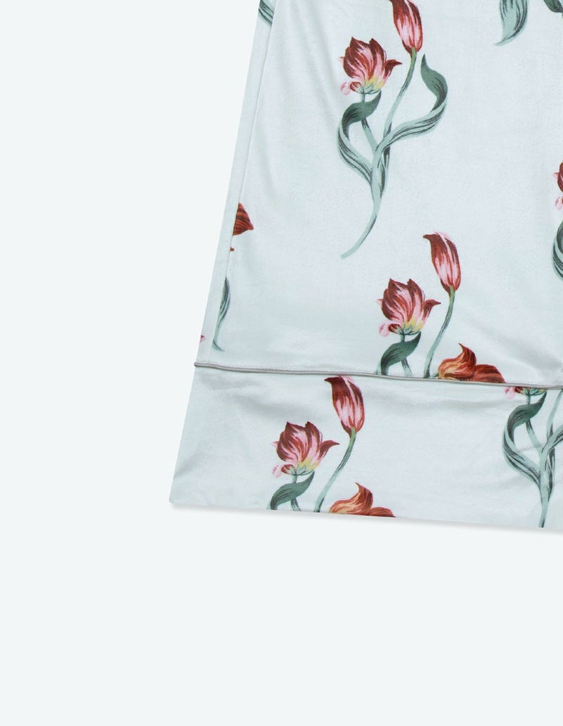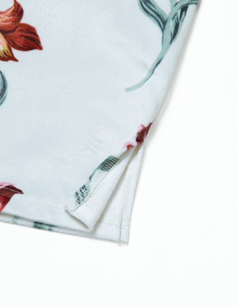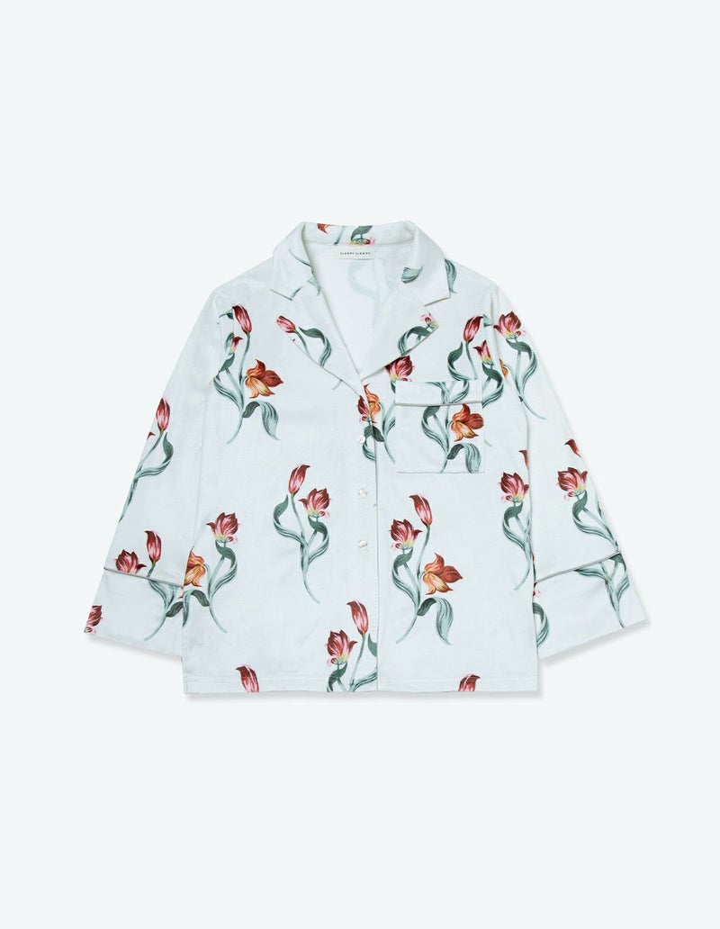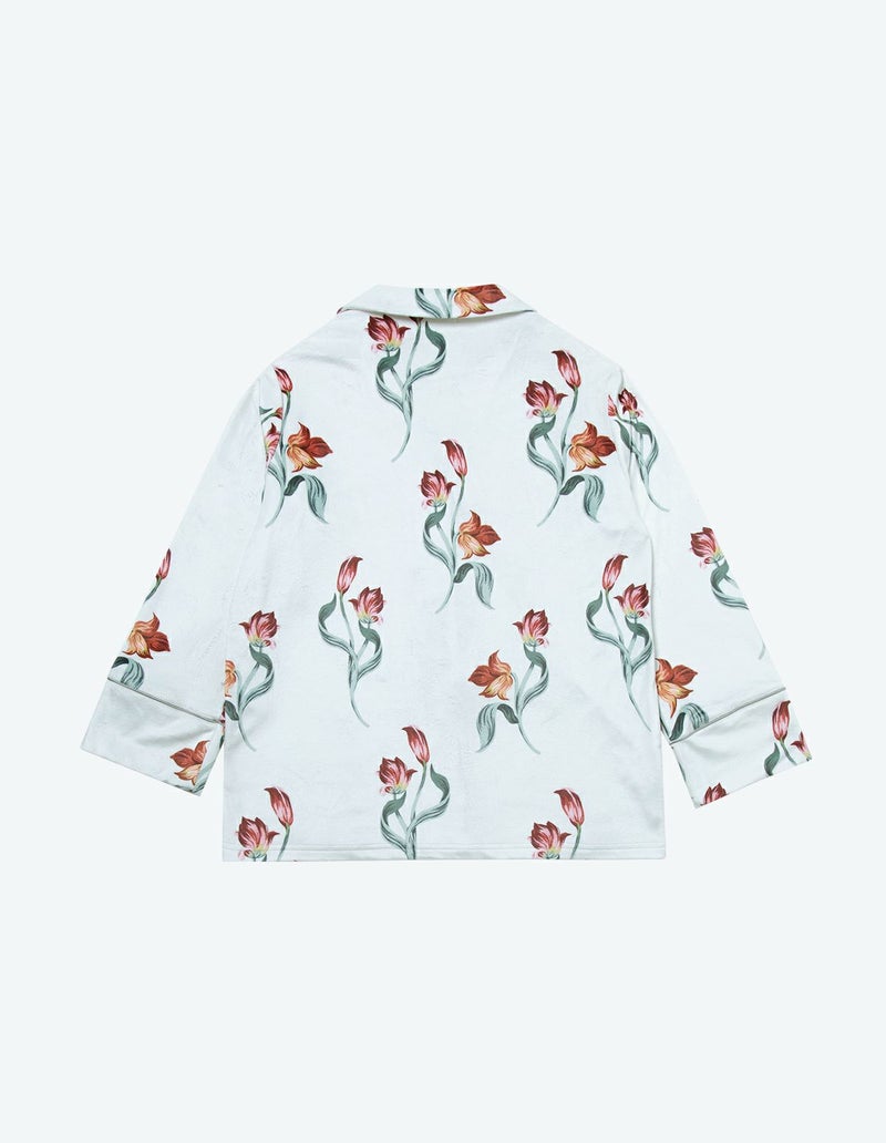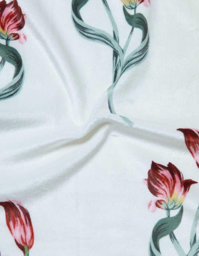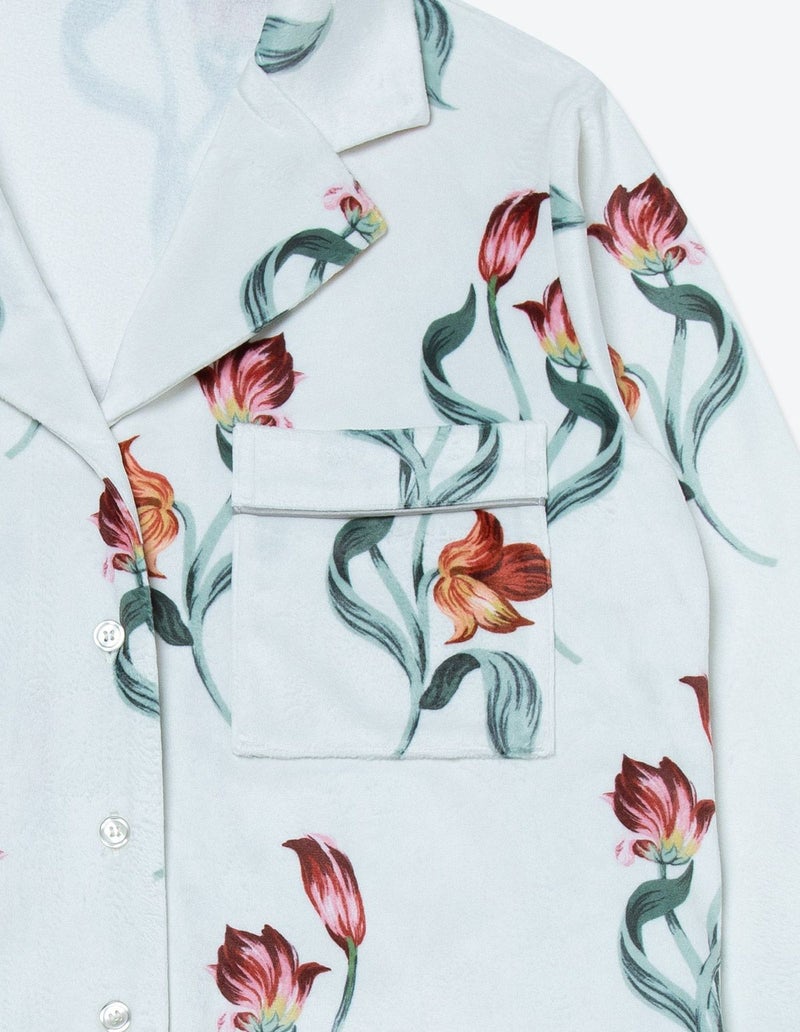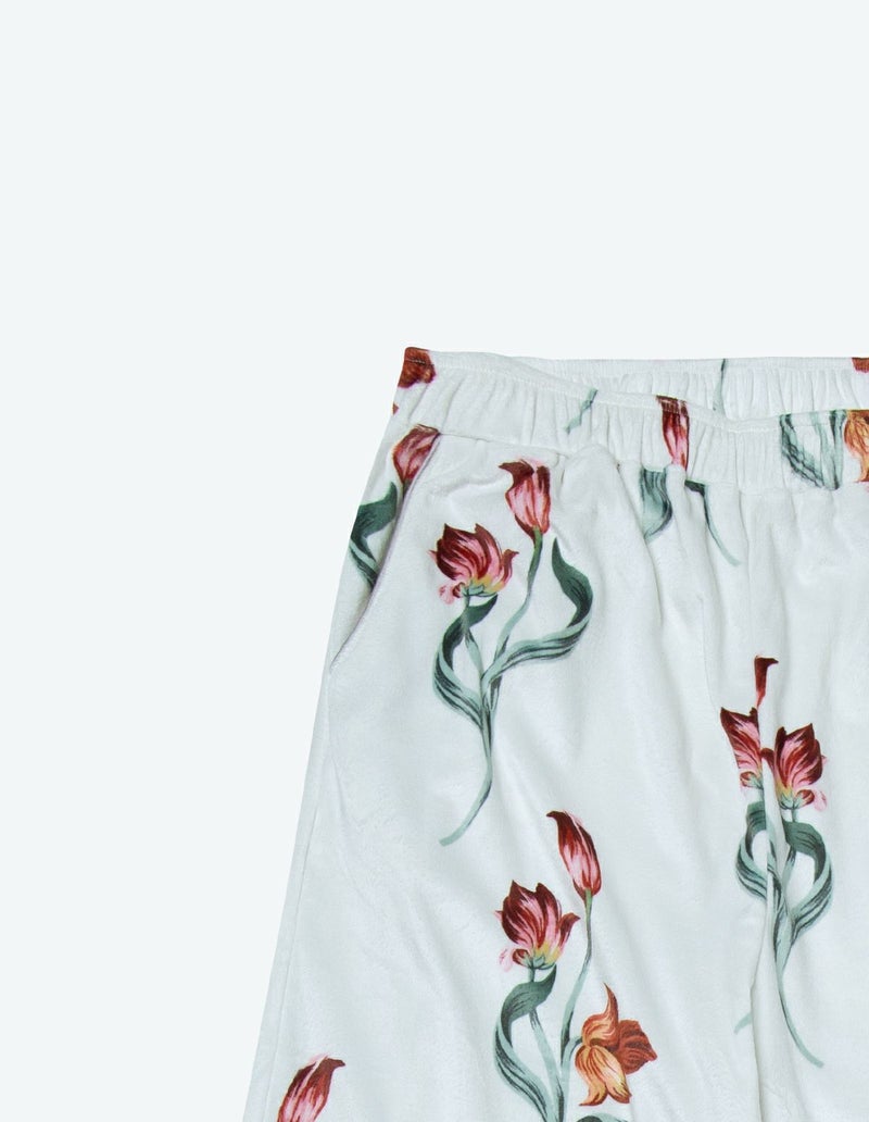 チューリップの持つ官能的なラインを抽出したフラワーパターンを、柔らかくしっとりとしたベロア生地プリントした長袖ロングパンツ。チューリップの花弁に優美にさす色と、葉っぱのラインとのコントラストでシックな印象にまとめたデザイン。着心地の柔らかなベロアは保温性も高く暖かく過ごしいただけます。 ペアアイテムとしてもおすすめ。