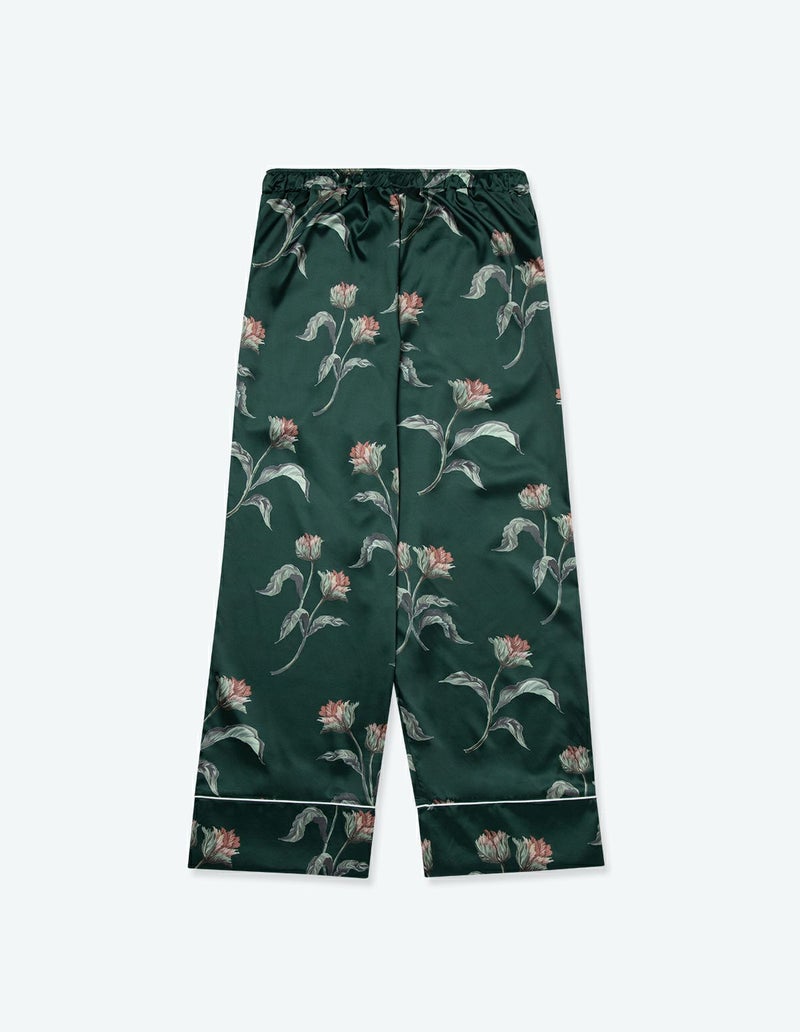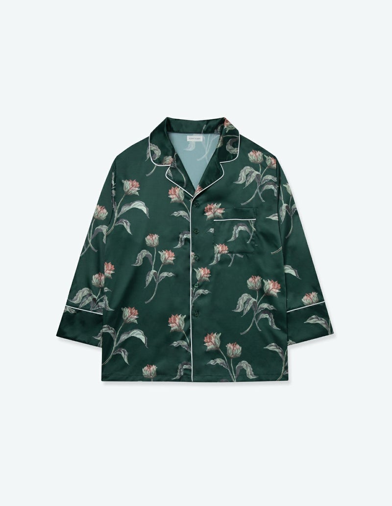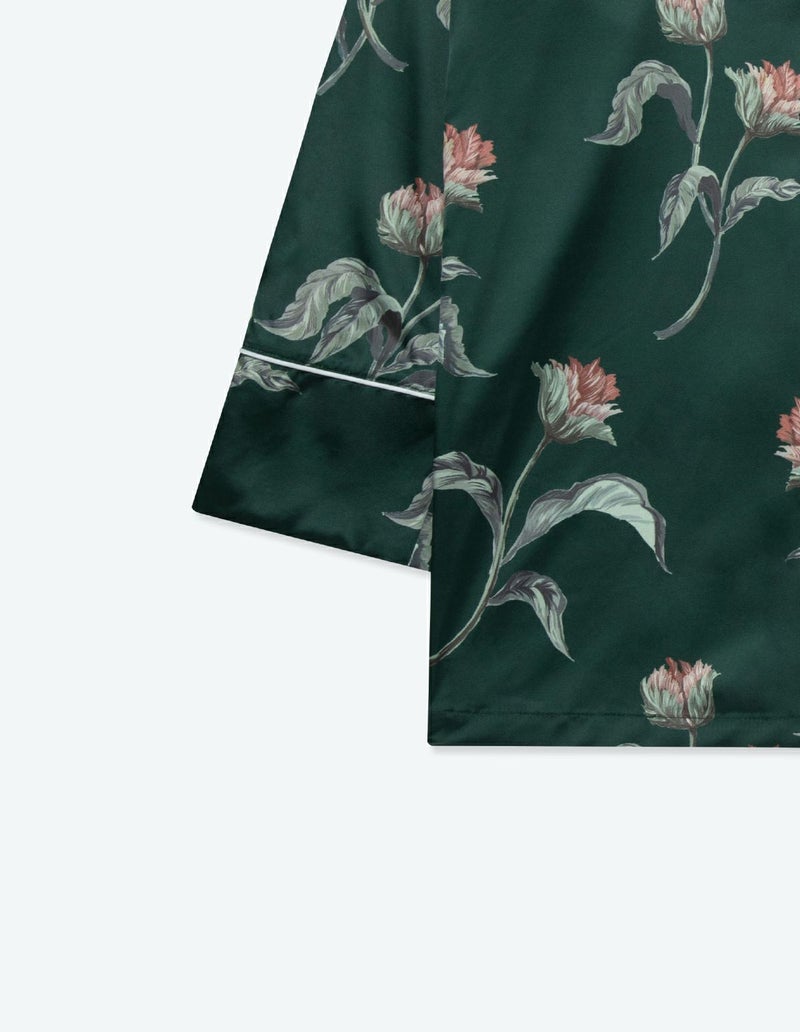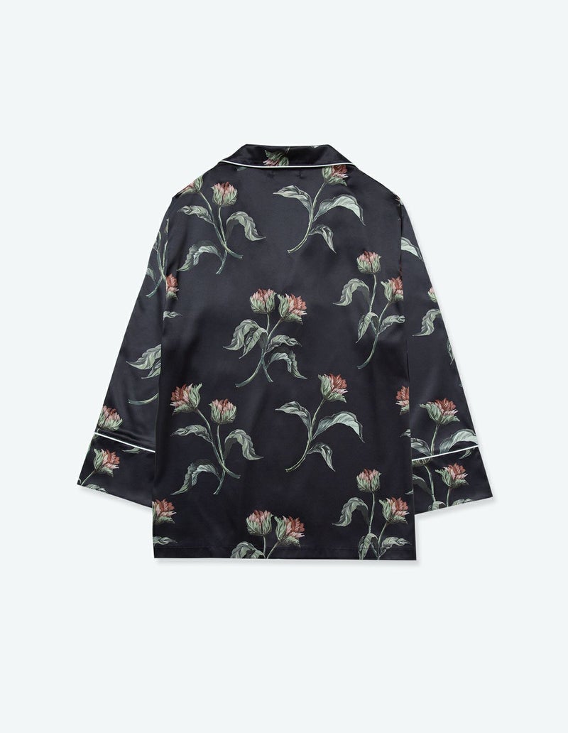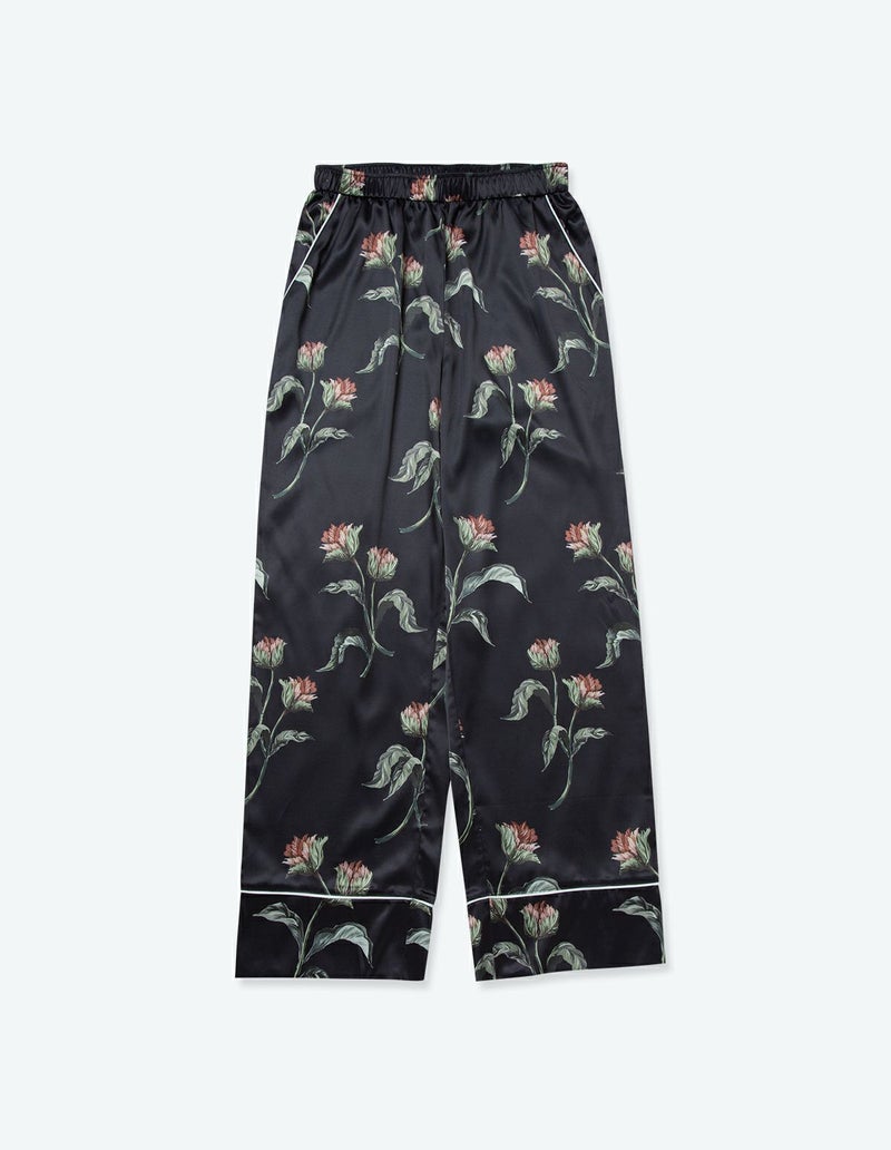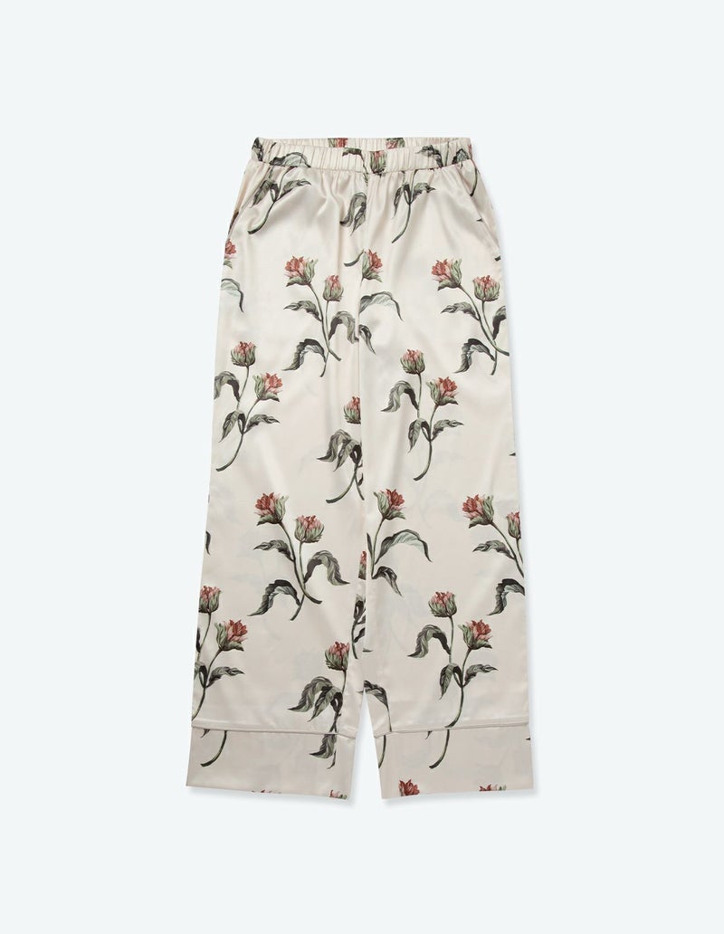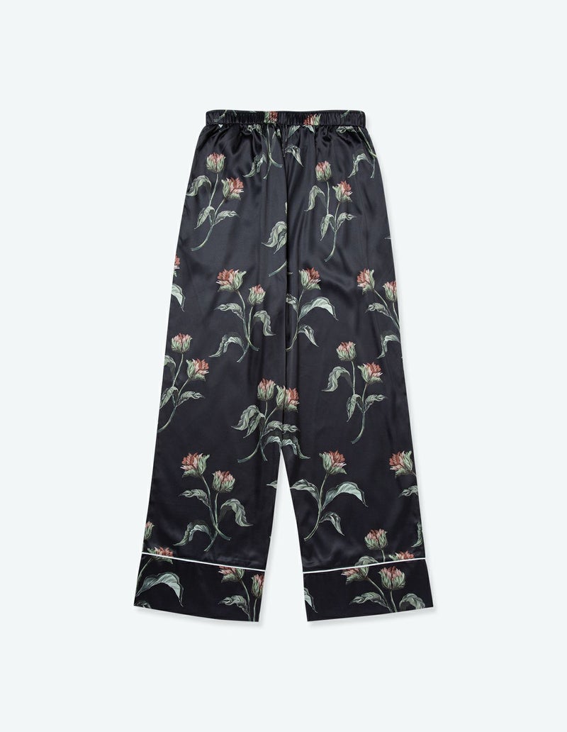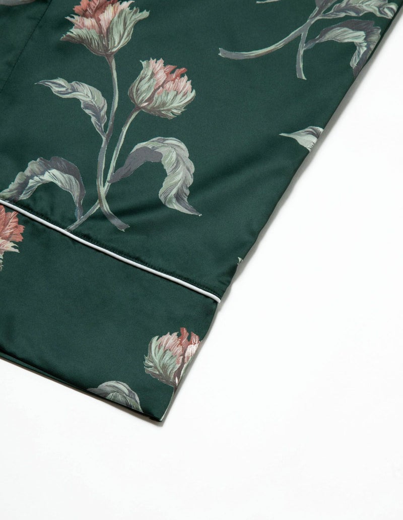 細やかなタッチが印象的な華やかなオリジナルフラワーを大胆にプリントした長袖ロングパンツセット。フラワープリントを施したパッケージ入りで特別なギフトにぴったり。微光沢のサテン生地がさらりとした肌触りでロングシーズン着用可能な素材です。ペアアイテムとしてもおすすめ。