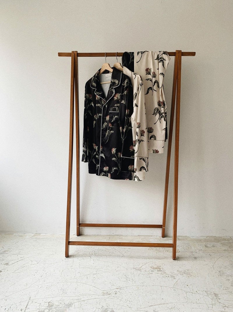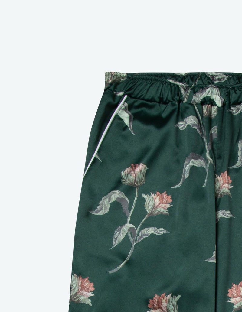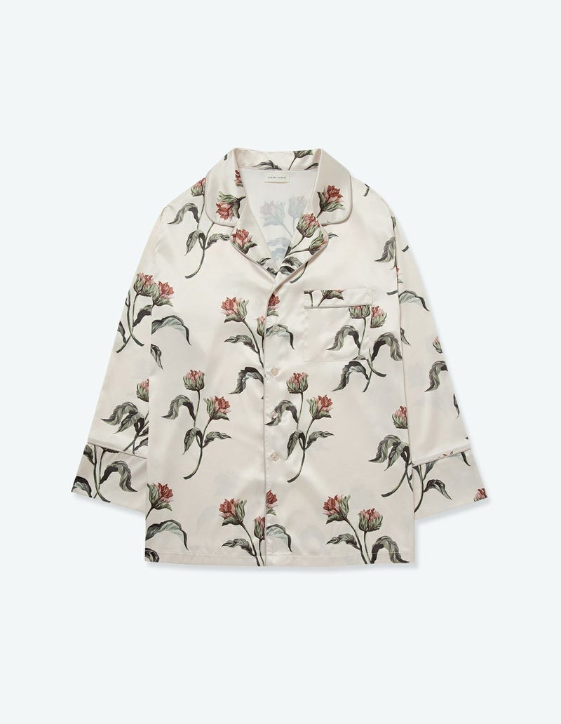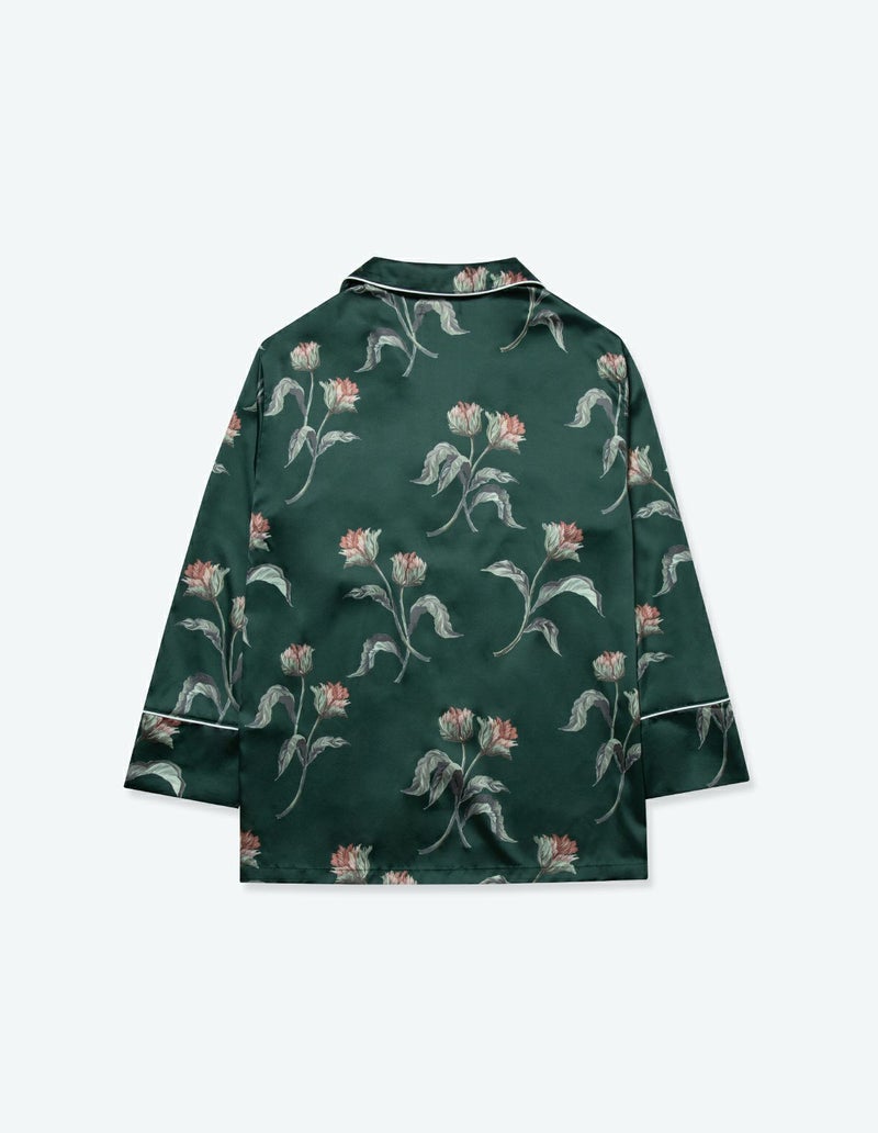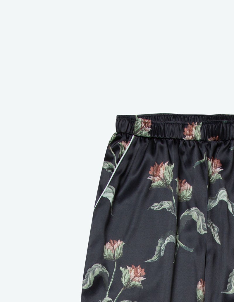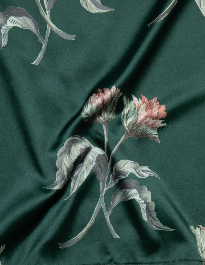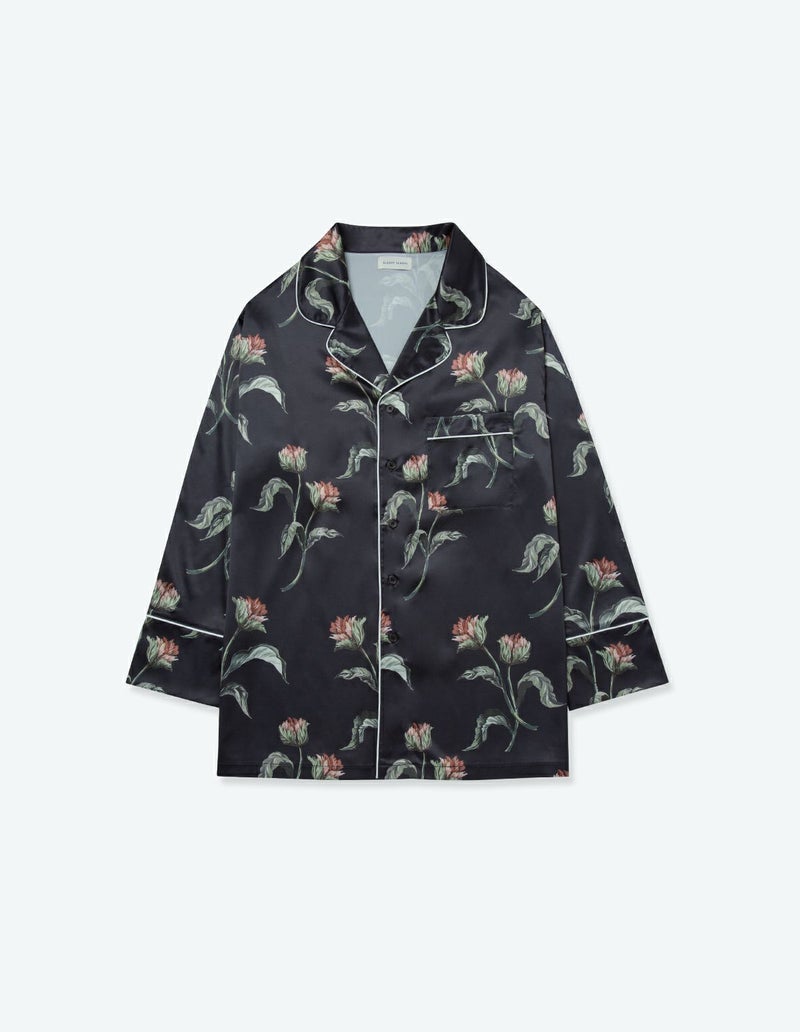 細やかなタッチが印象的な華やかなオリジナルフラワーを大胆にプリントした長袖ロングパンツセット。フラワープリントを施したパッケージ入りで特別なギフトにぴったり。微光沢のサテン生地がさらりとした肌触りでロングシーズン着用可能な素材です。ペアアイテムとしてもおすすめ。