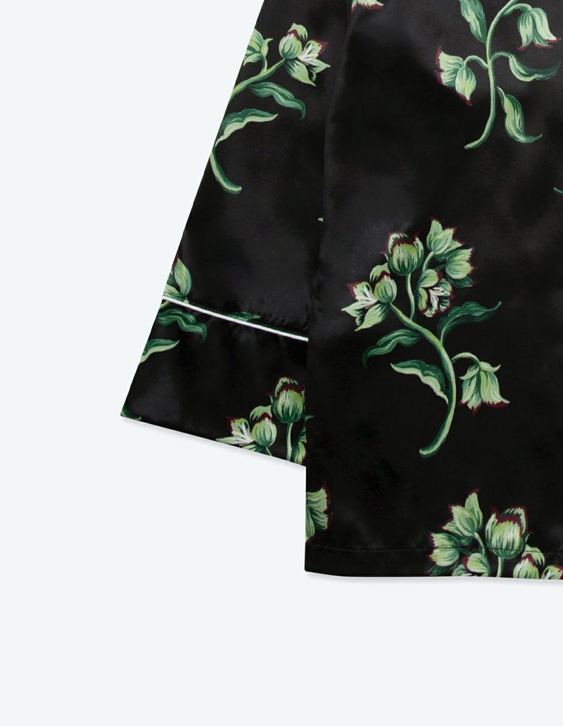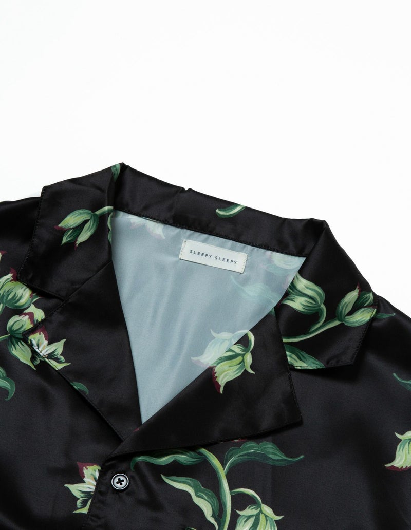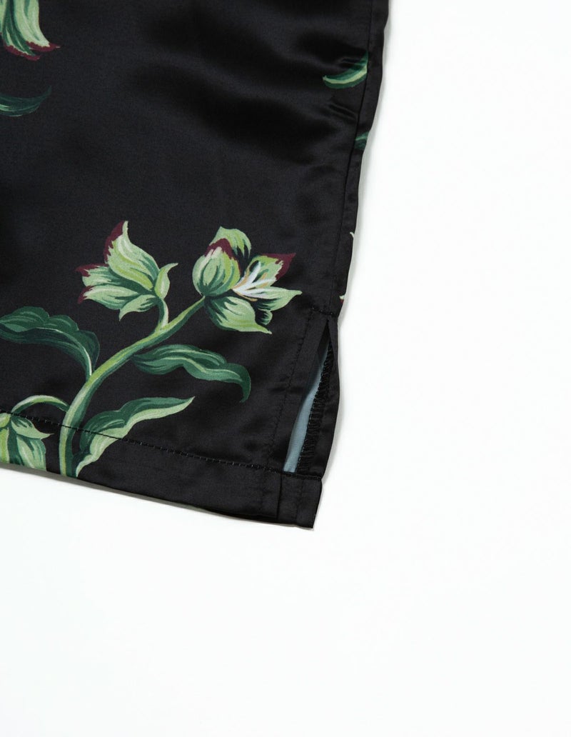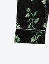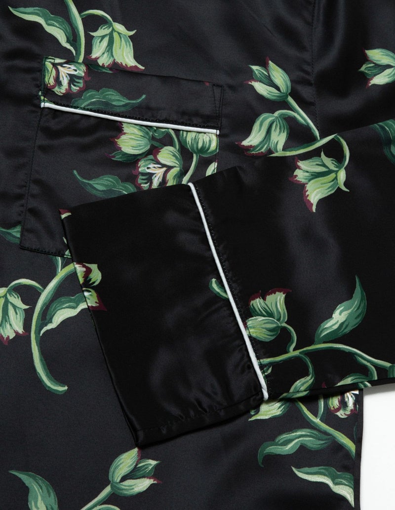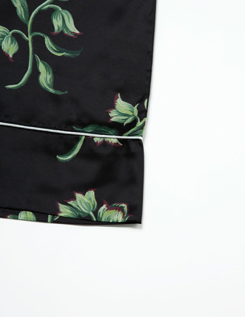 クリスマスローズを大柄で施したフラワープリントの長袖ロングパンツセット。微光沢のサテン生地がさらりとした肌触りで、シーズンレスに着用可能な素材です。シックなブラックベースでご用意。レディースとのペアアイテムとしてもおすすめです。
