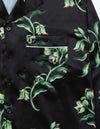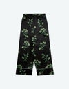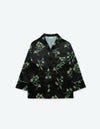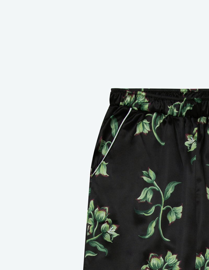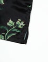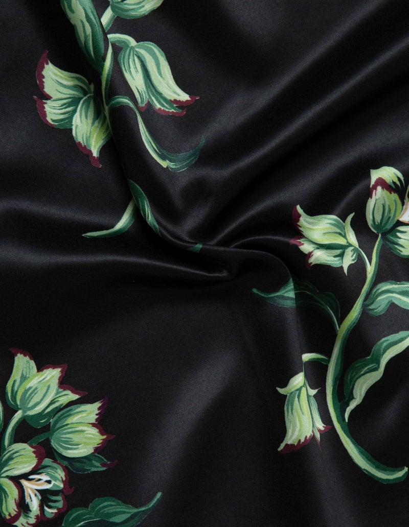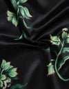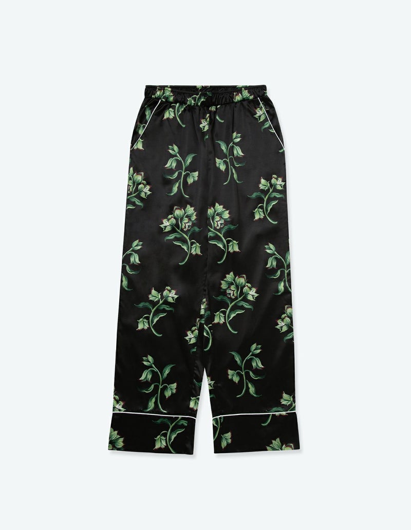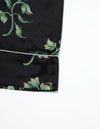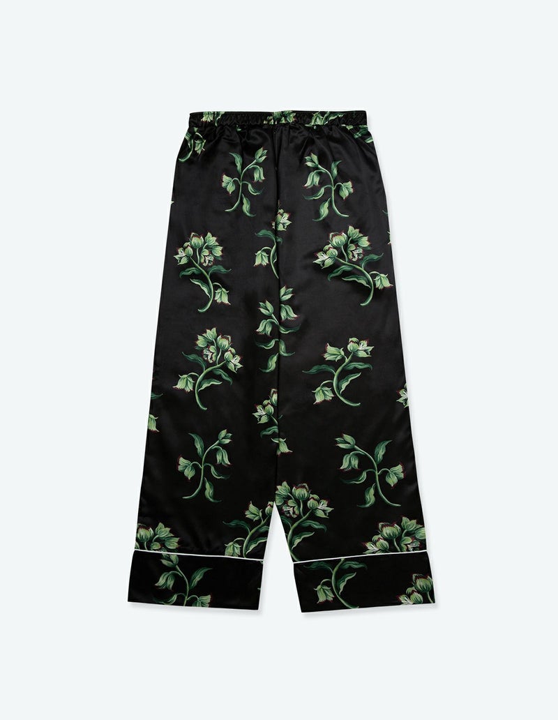 クリスマスローズを大柄で施したフラワープリントの長袖ロングパンツセット。微光沢のサテン生地がさらりとした肌触りで、シーズンレスに着用可能な素材です。シックなブラックベースでご用意。レディースとのペアアイテムとしてもおすすめです。
