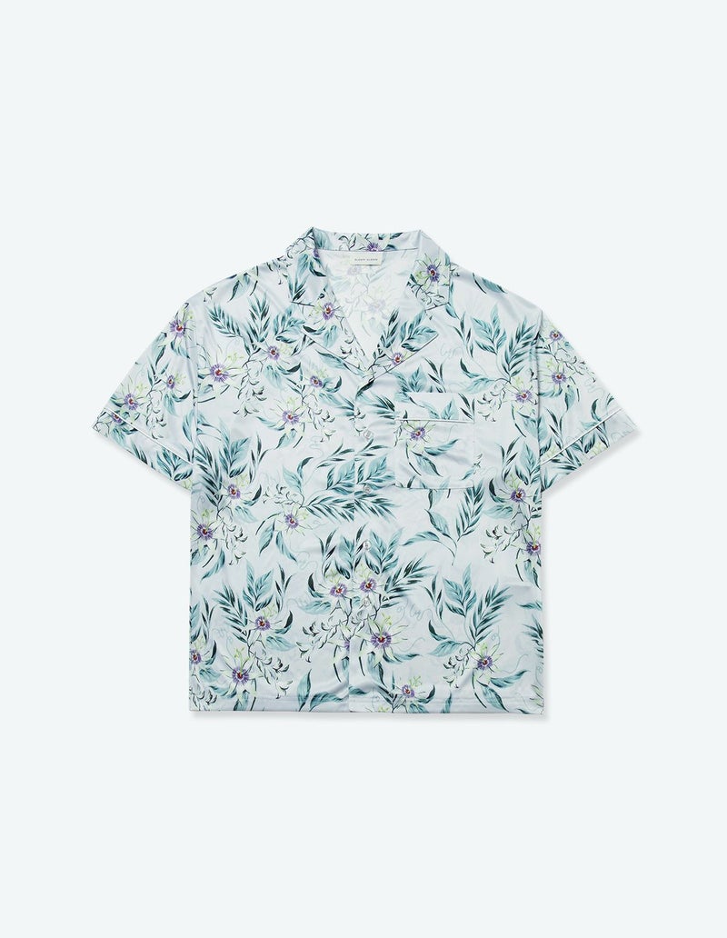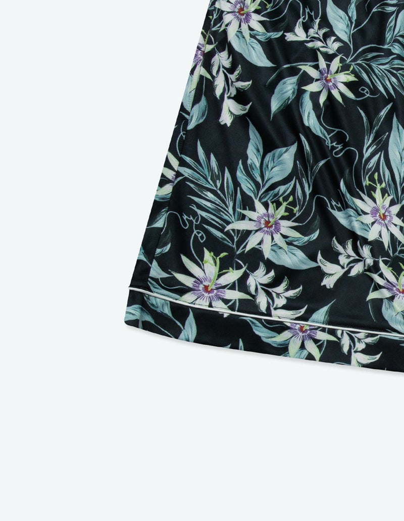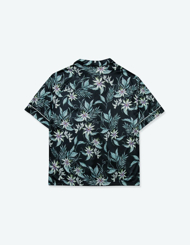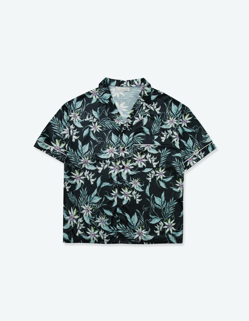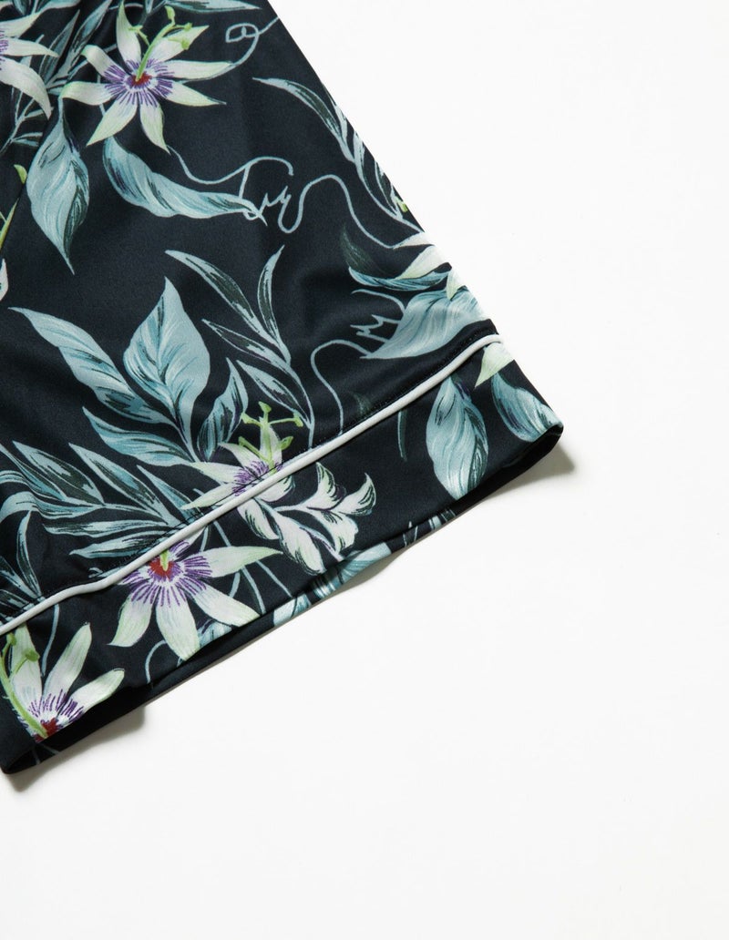 十字架上の花とされたパッションフラワーは煌びやかな美しさが特徴。その逸話から「聖なる愛」を花言葉持つ。ゆとりのあるオーバーサイズデザインで、アロハシャツのようにご着用いただくことも可能です。伸縮性の良いカットソー素材でありながら微光沢のある生地感で上質なイメージも演出。さらりとして速乾性もあり心地よくお過ごしいただけるアイテムです。おそろいで着られるペアパジャマとして誕生日のギフト、結婚祝いなど様々なお祝いシーンにもおすすめです。