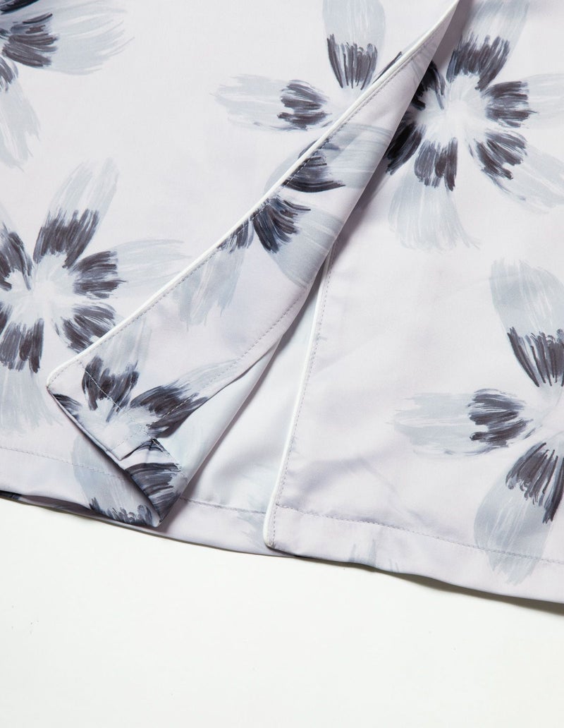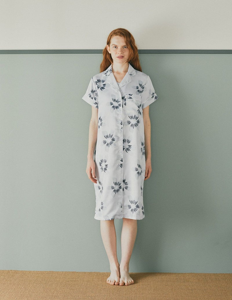 光でうつしとった花弁をイメージして大胆に描かれたフラワープリントワンピースセット。パット付きのキャミソール とのセットでそれぞれ着回しのきくアイテム。微光沢のサテン生地がさらりとした肌触りで、シーズンレスに着用可能な素材です。おそろいで着られるペアパジャマとして誕生日のギフト、結婚祝いなど様々なお祝いシーンにもおすすめ。