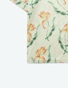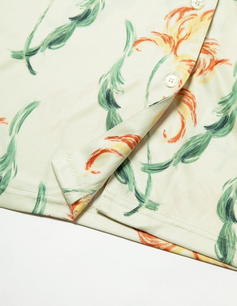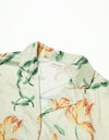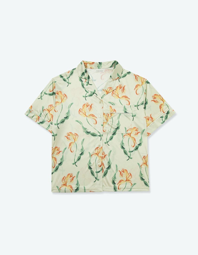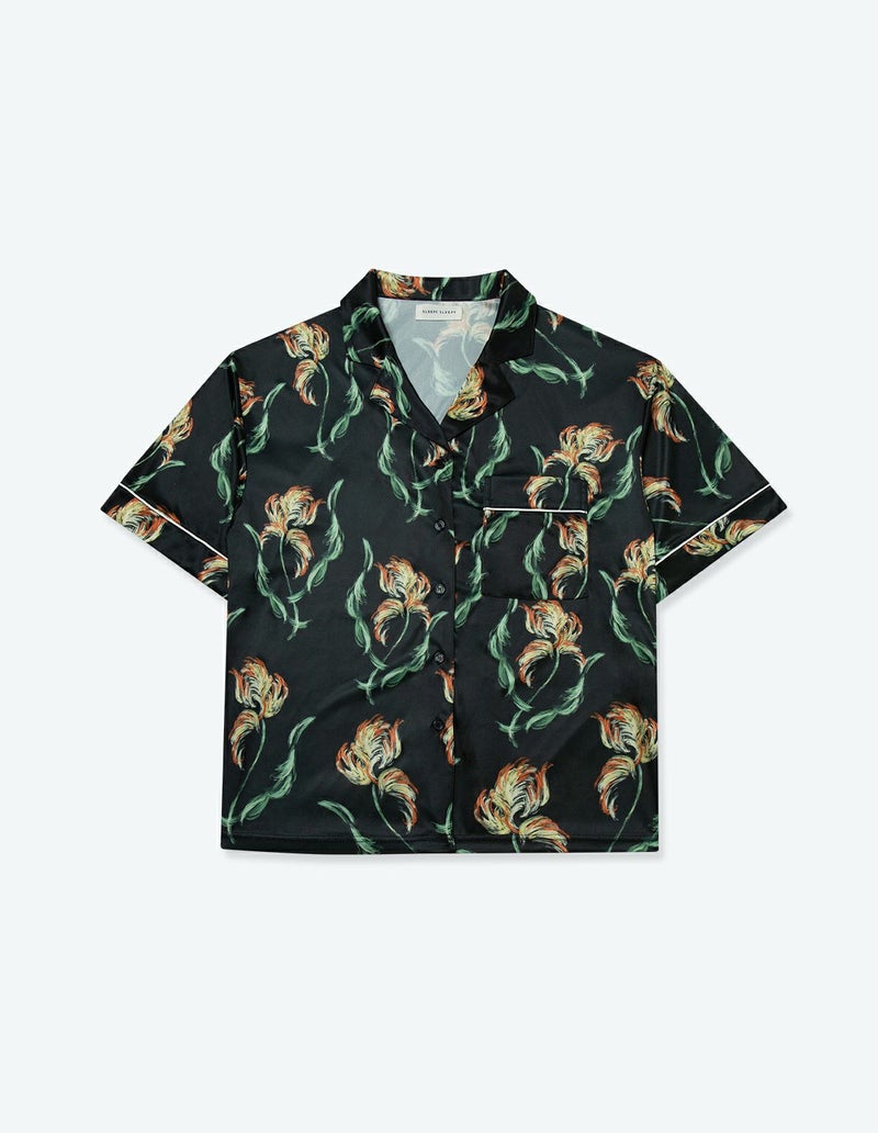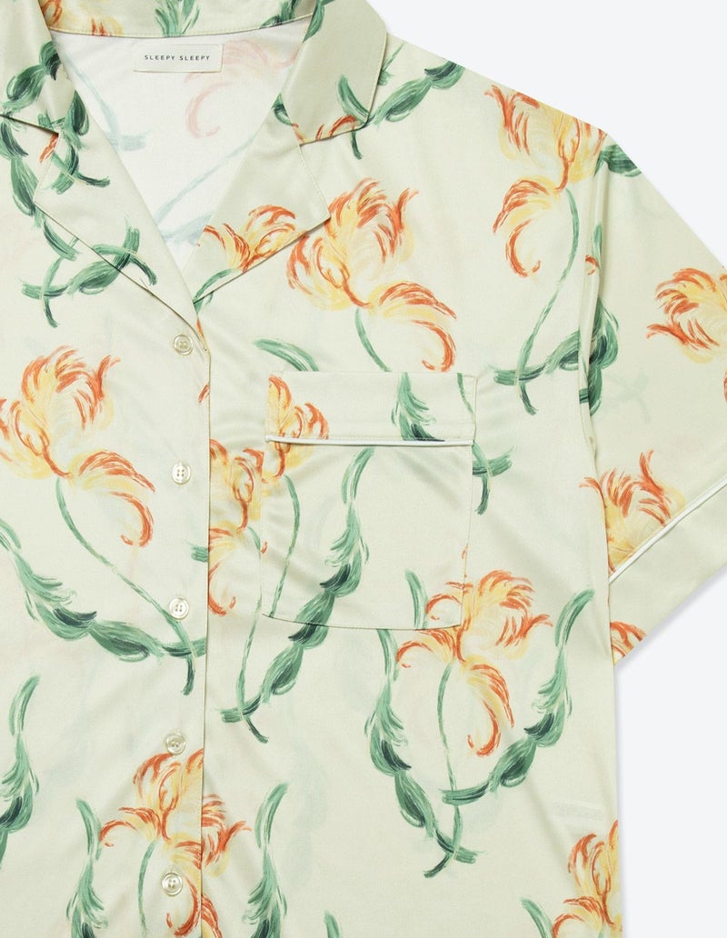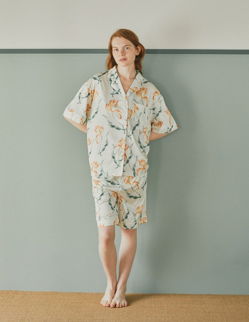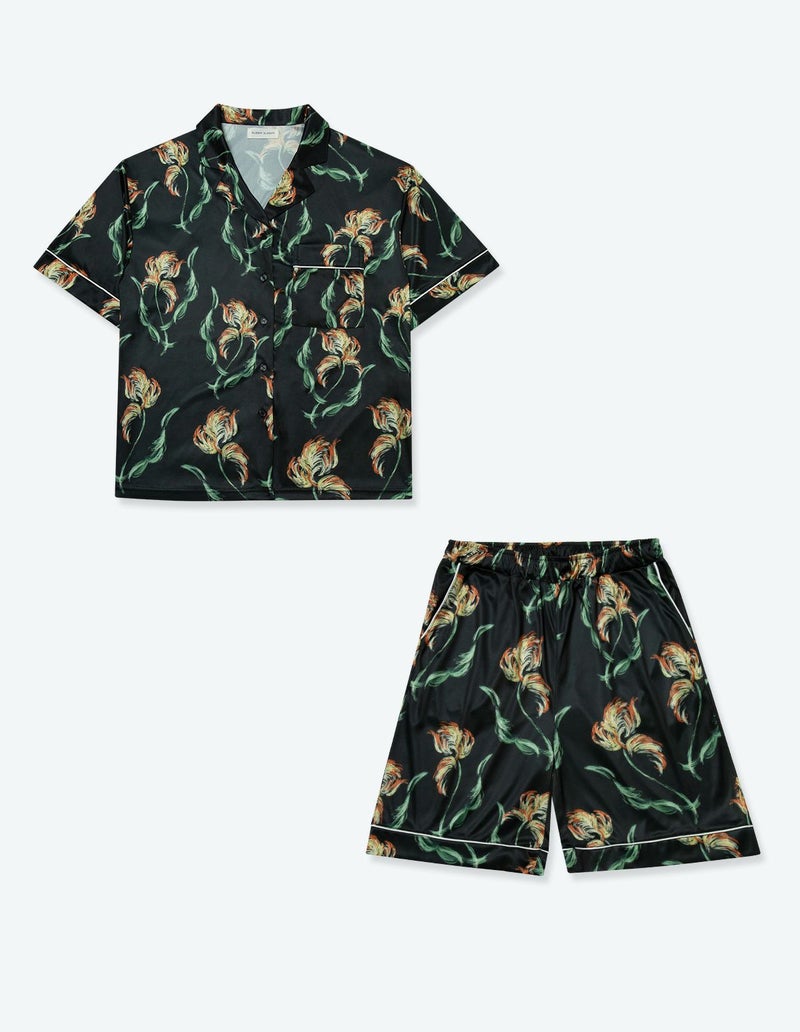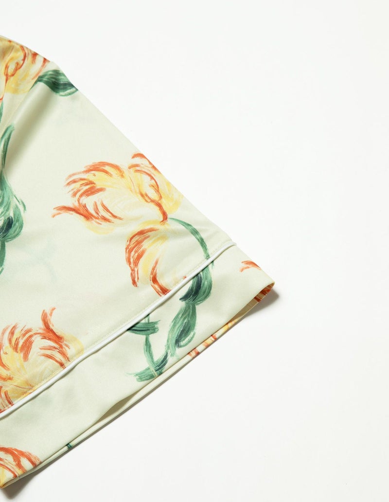 美しく広がるパーロットチューリップをモチーフに、散り際に生み出す花弁や葉っぱの官能的なラインを大胆なブラシストロークで描いたフラワープリントの半袖パジャマセット。ゆとりのあるオーバーサイズデザインで、アロハシャツのようにご着用いただくことも可能です。伸縮性の良いカットソー素材でありながら微光沢のある生地感で上質なイメージも演出。さらりとして速乾性もあり心地よくお過ごしいただけるアイテム。おそろいで着られるペアパジャマとして誕生日のギフト、結婚祝いなど様々なお祝いシーンにもおすすめです。