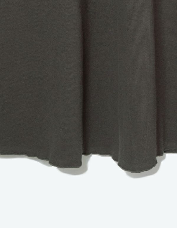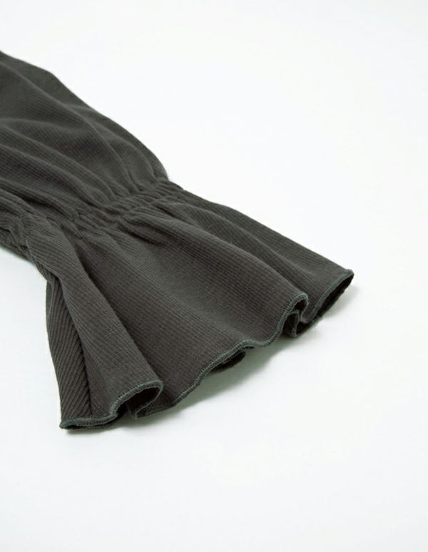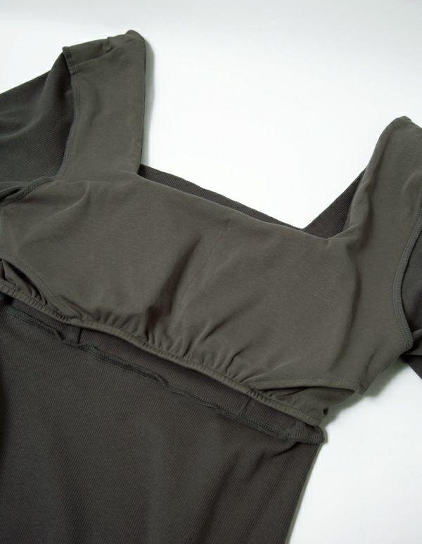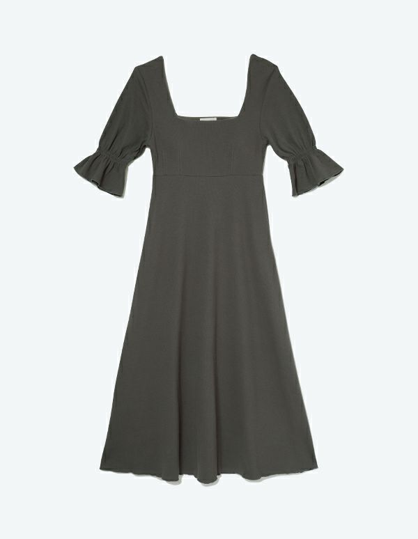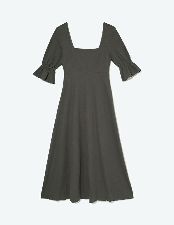 コットンリブカットソーを使用したフレアワンピース。Aラインに広がるシルエットとパフスリーブでデコラティブでありながら、深めのスクエアネックですっきりとした印象に。パット付きで着心地のいいリラクシングウェアです。アイボリーとチャコールの2色展開です。