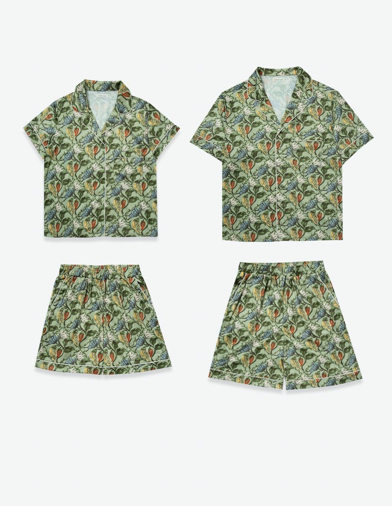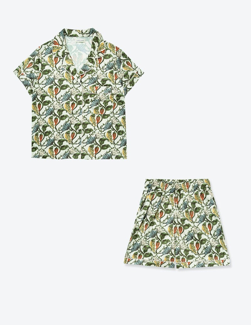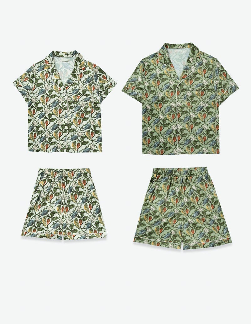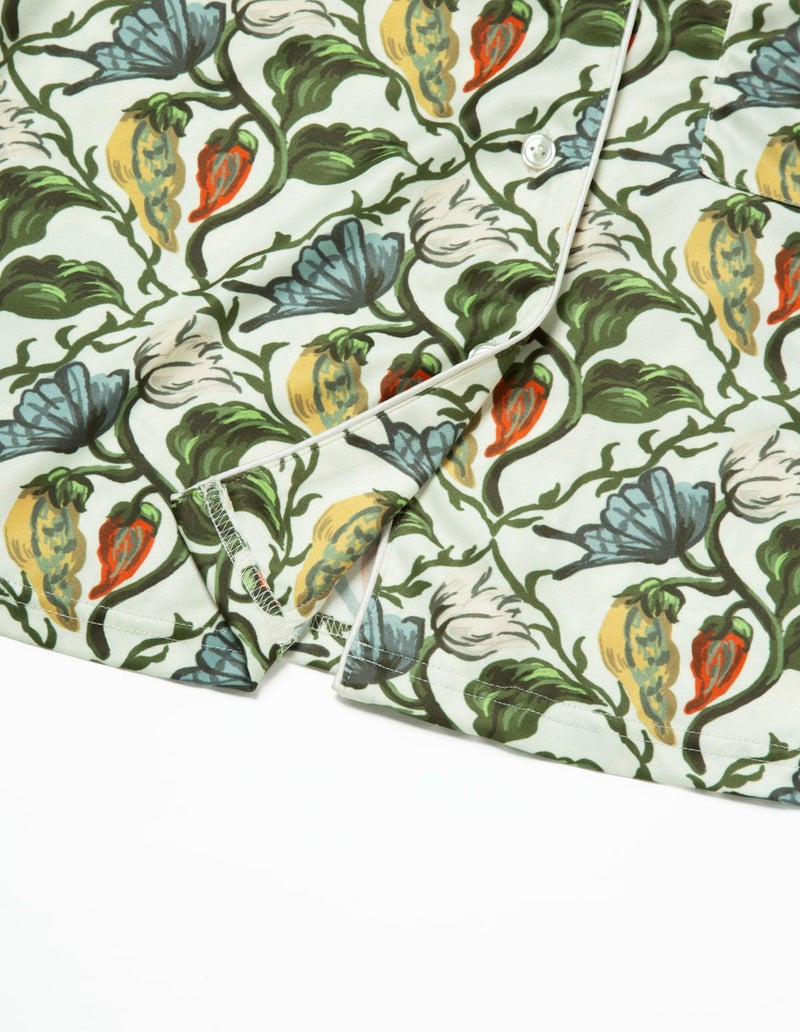 フラワーモチーフと幾何学模様を組み合わせたプリントのパジャマセットアっぷ。幾何学ラインも含め全て植物でデザイン。春夏らしい実りのあるモチーフを格子柄に収めたプリントで、鮮やかな配色でありながら、ソフトなカットソー素材と合わせることで上品な印象に仕上げました。