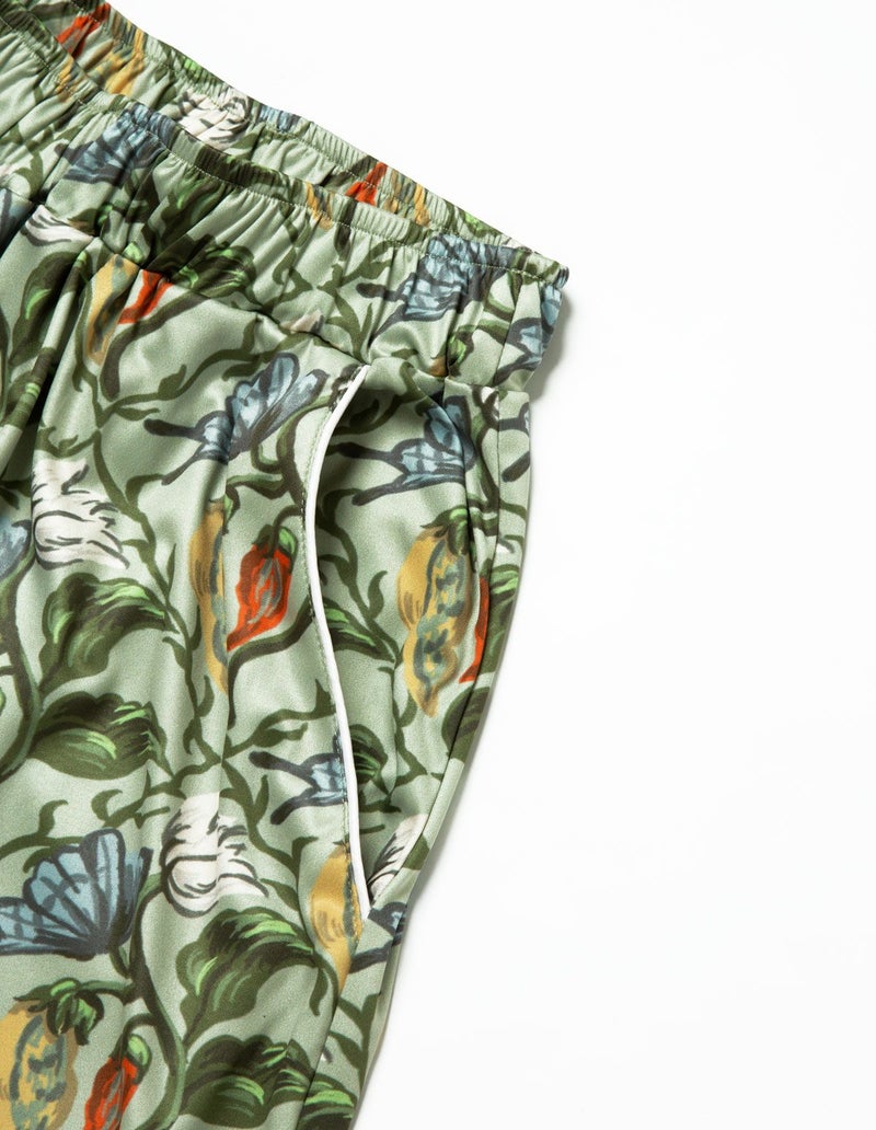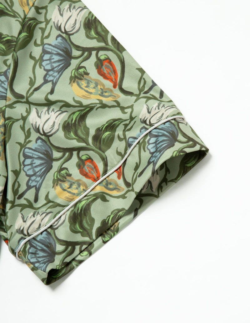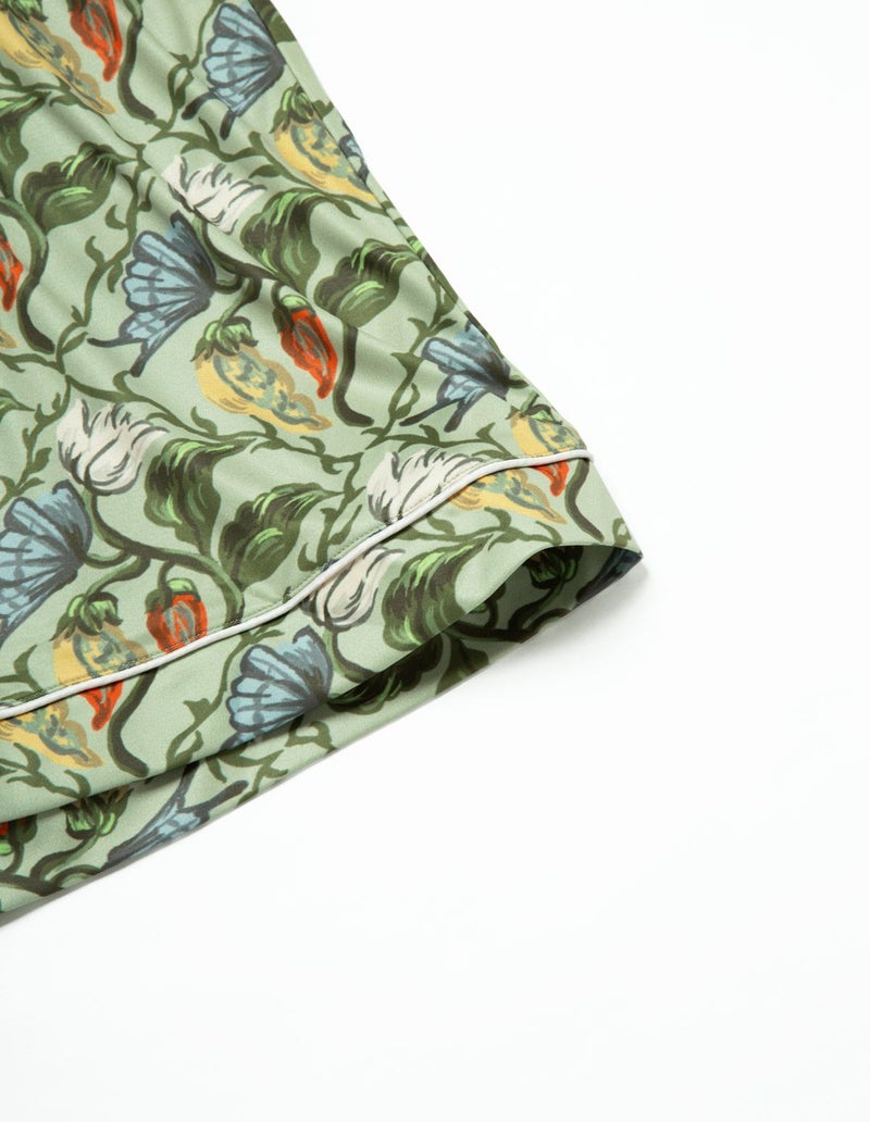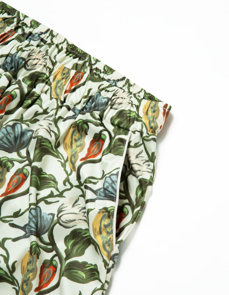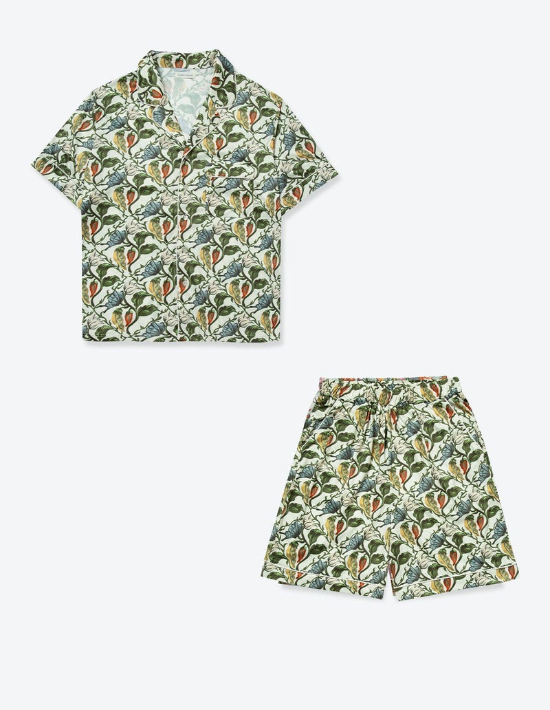 フラワーモチーフと幾何学模様を組み合わせたプリントのパジャマセットアっぷ。幾何学ラインも含め全て植物でデザイン。春夏らしい実りのあるモチーフを格子柄に収めたプリントで、鮮やかな配色でありながら、ソフトなカットソー素材と合わせることで上品な印象に仕上げました。