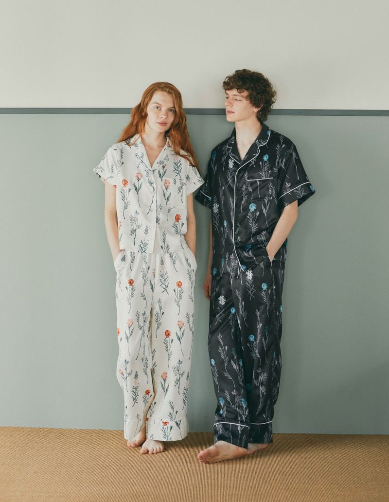 ゆらゆらとたゆたう野の花広がる理想の花園メドウガーデン。風にそよぐ草花の中を纏う牧歌的な情景を落とし込んだフラワープリントパジャマをペアでラッピングしたギフトセット。微光沢のサテン生地がさらりとした肌触りで、シーズンレスに着用可能な素材です。 おそろいで着られるペアパジャマとして誕生日のギフト、結婚祝いなど様々なお祝いシーンにもおすすめです。