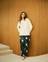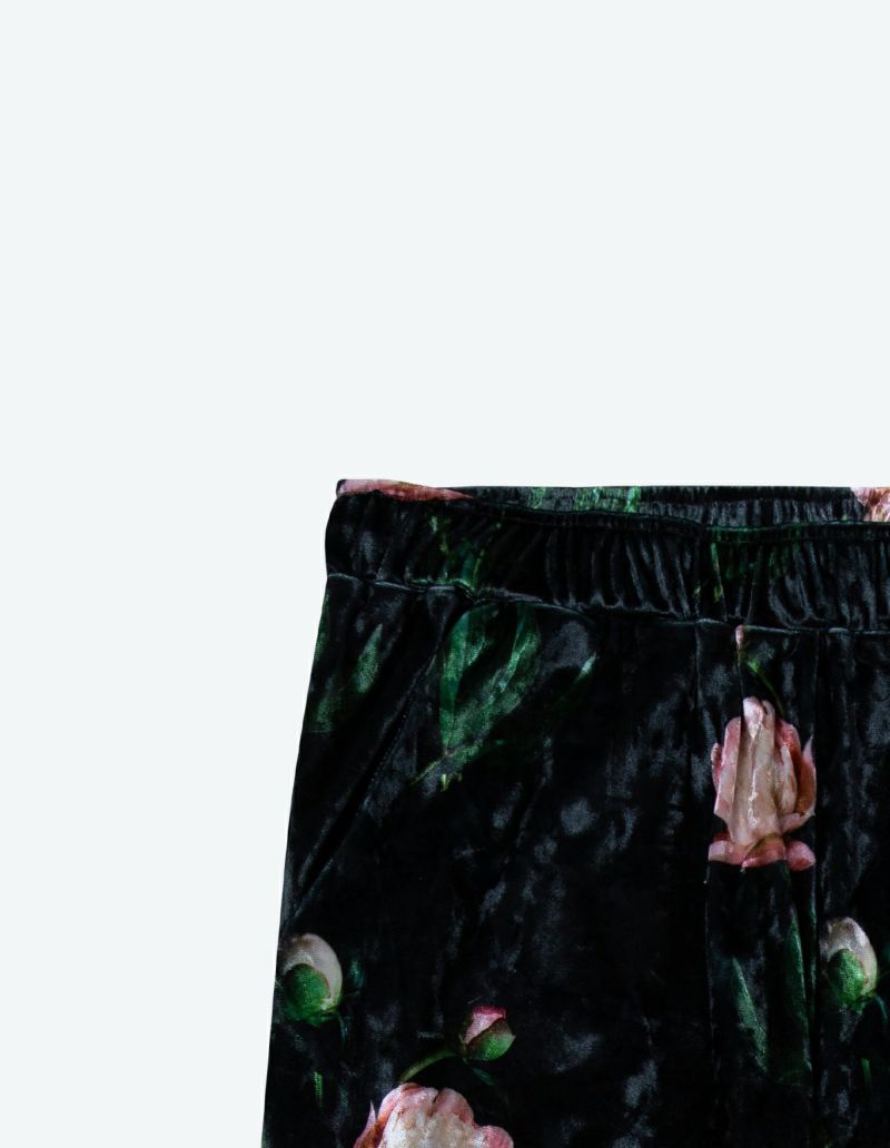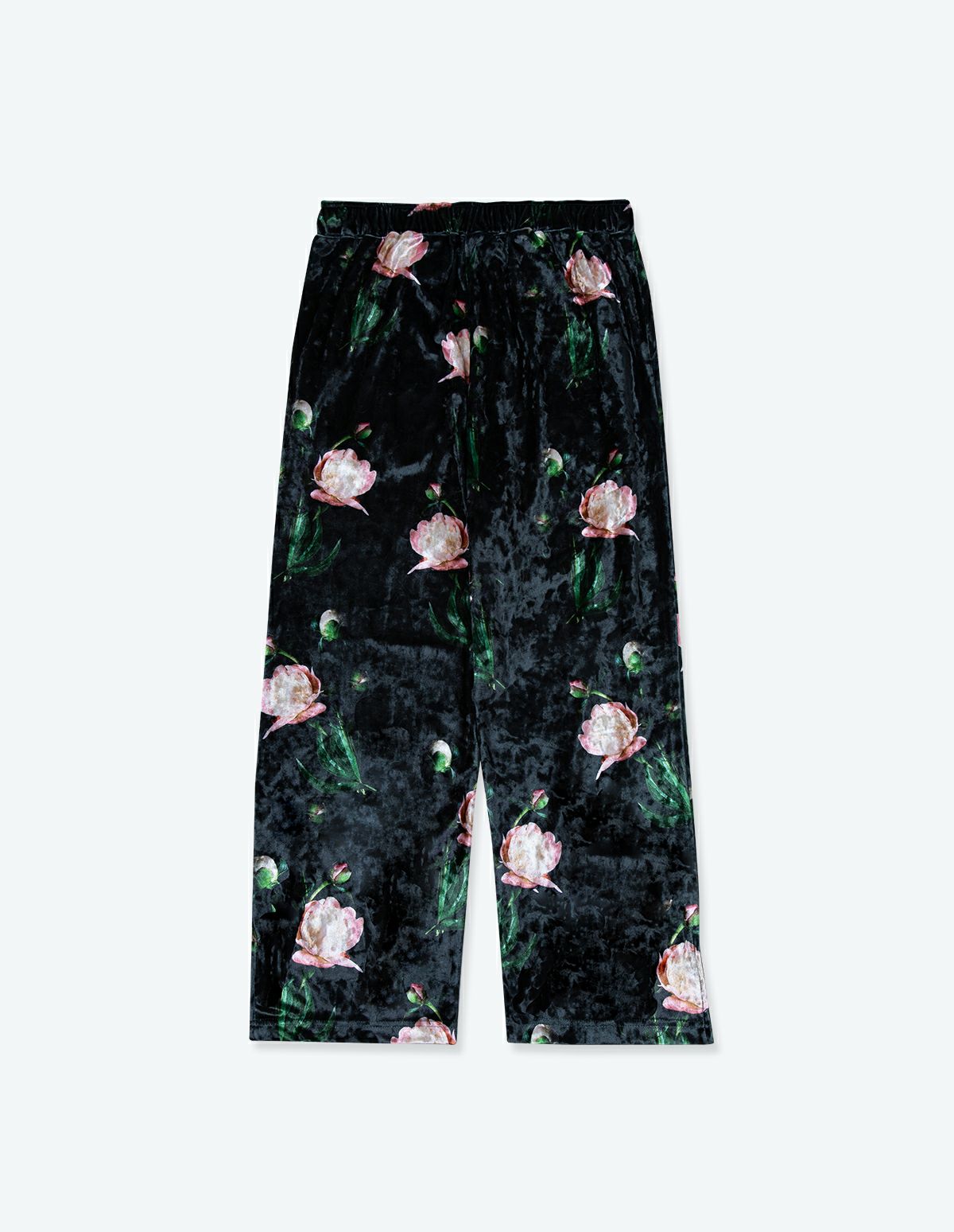 パフスリーブデザインにロゴ刺繍Tシャツに、ベロアプリントパンツをセットした人気のユニセックスセットアップ。ベロアパンツはトップスカラーによってデザインが異なります。アイボリーには鮮やかなピオニーを、ブラックには月下美人をプリント。