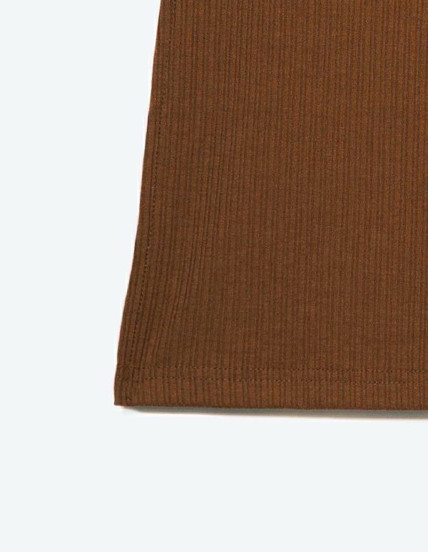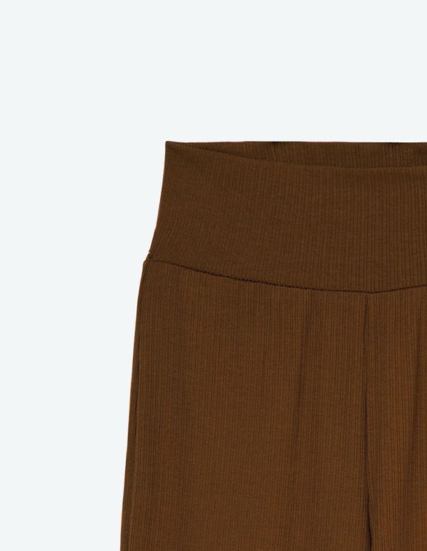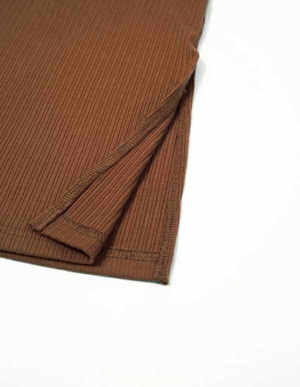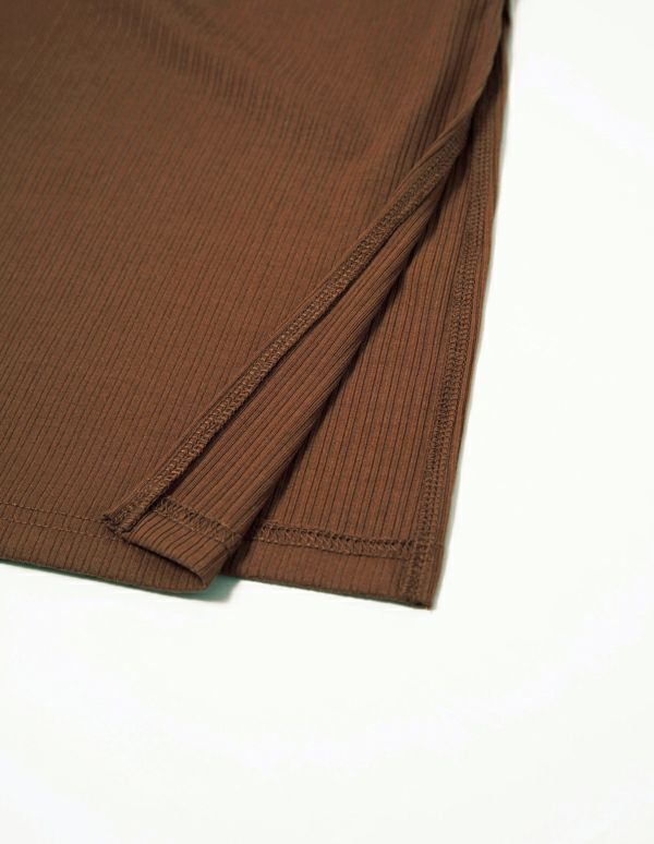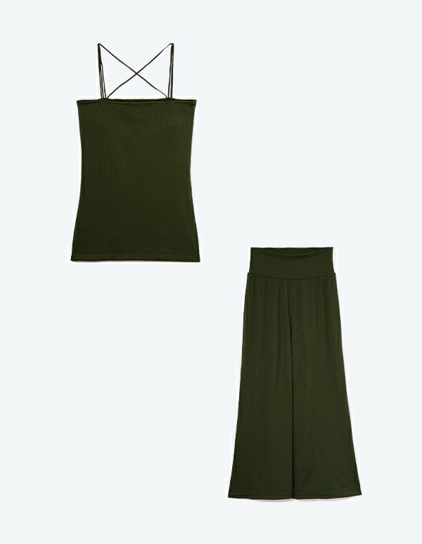 柔らかなランダムリブカットソー生地を使用したキャミソールセットアップ。トップスはタイト、パンツはワイドシルエットでメリハリのあるスタイルでありながら、パットと腹巻付きで過ごしやすいリラクシングウェア。ブラウンとグリーンの2色展開です。