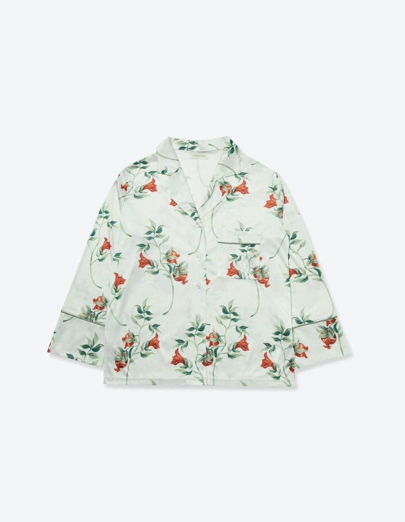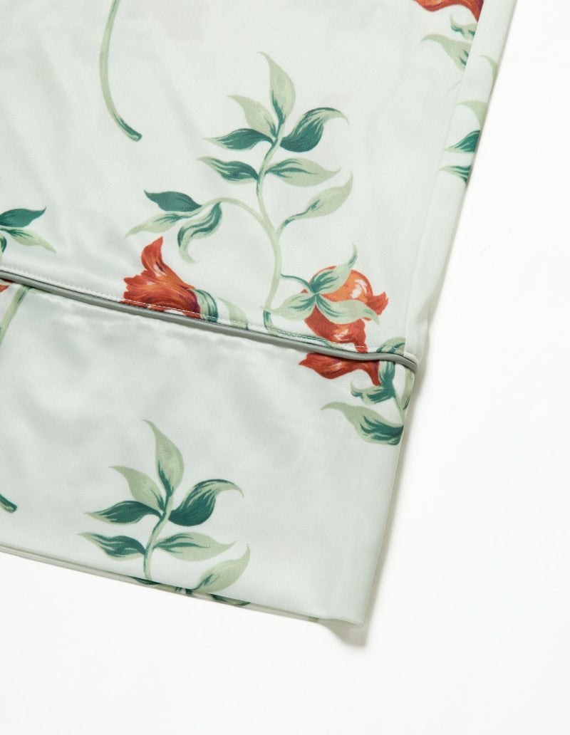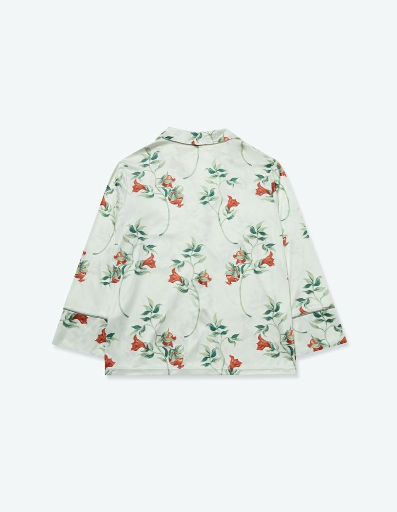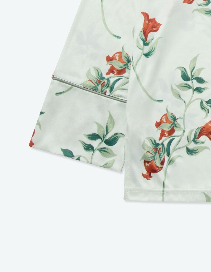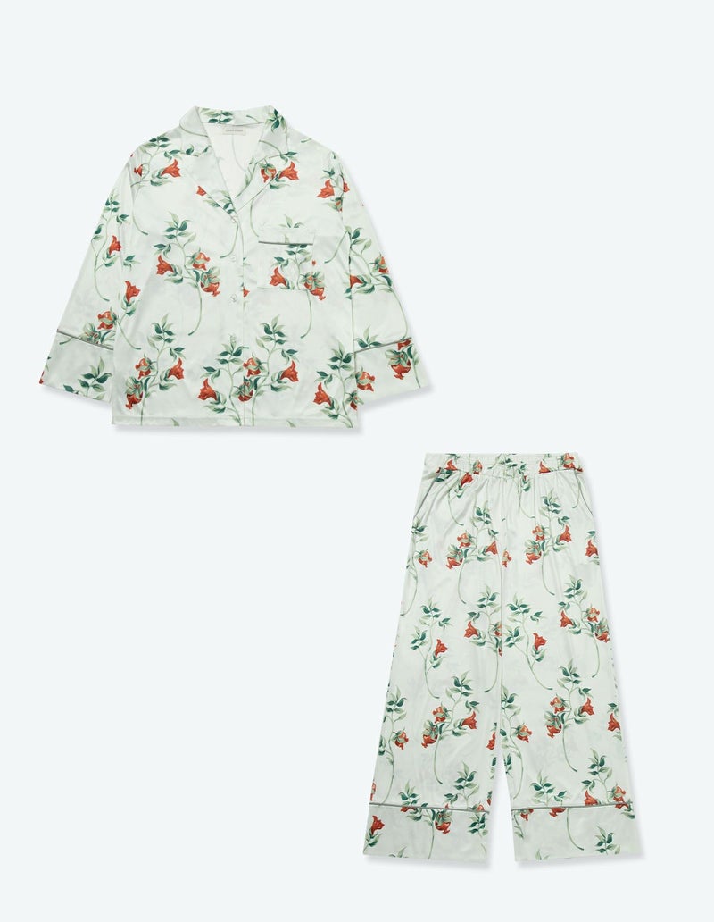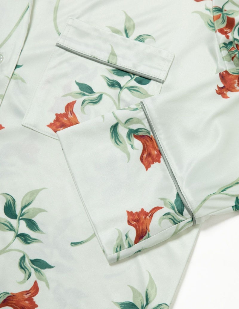 「祝福」の象徴として描かれるザクロと、対をなすような鮮やかな花と葉っぱのコントラストを甘な曲線で描いたフラワープリントパジャマ。 カットソー生地の長袖ロングパンツで微光沢のある生地感は上質なイメージを演出。さらりとした肌触りで心地よく着用いただけます。 ペアアイテムとしてもおすすめ。