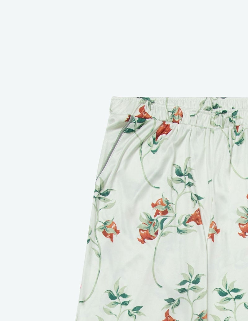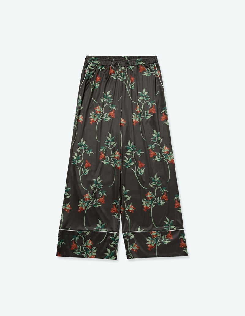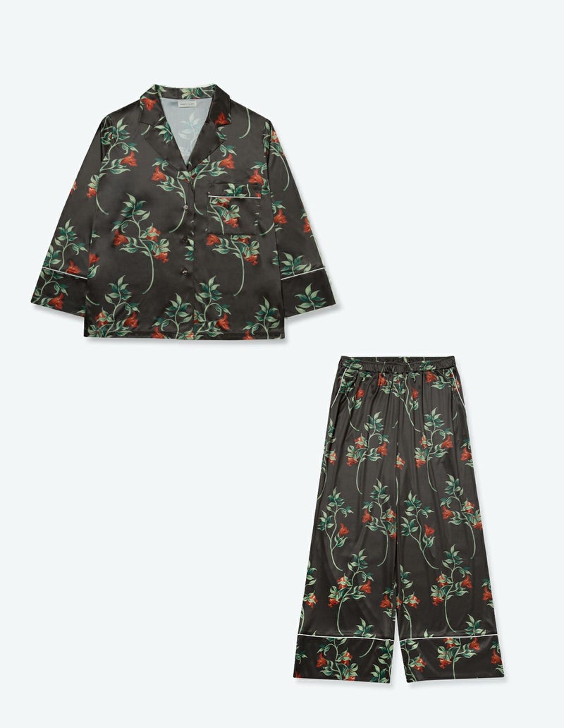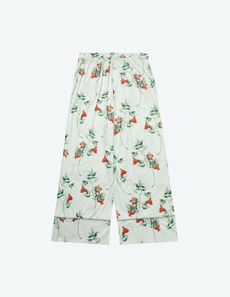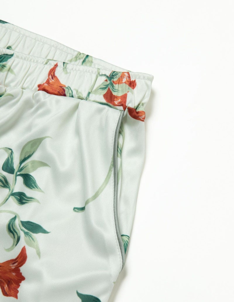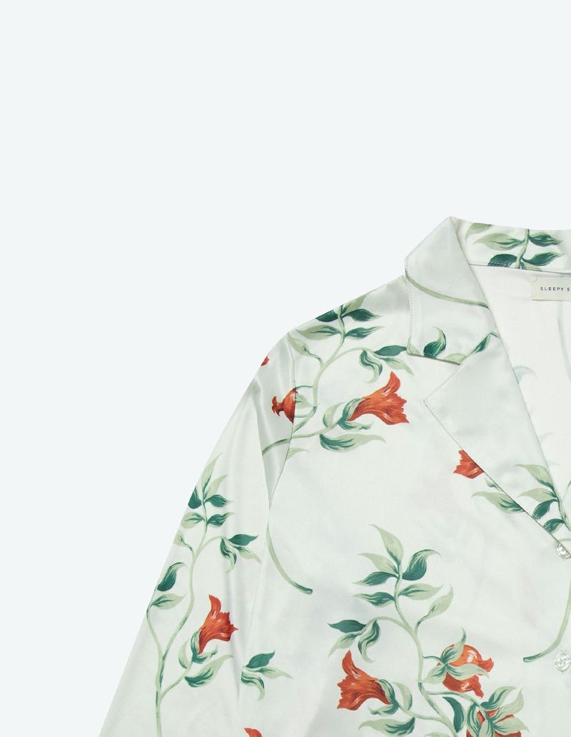 「祝福」の象徴として描かれるザクロと、対をなすような鮮やかな花と葉っぱのコントラストを甘な曲線で描いたフラワープリントパジャマ。 カットソー生地の長袖ロングパンツで微光沢のある生地感は上質なイメージを演出。さらりとした肌触りで心地よく着用いただけます。 ペアアイテムとしてもおすすめ。