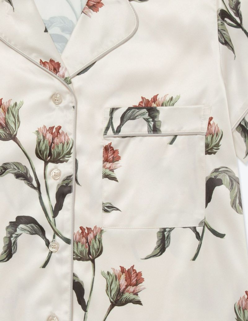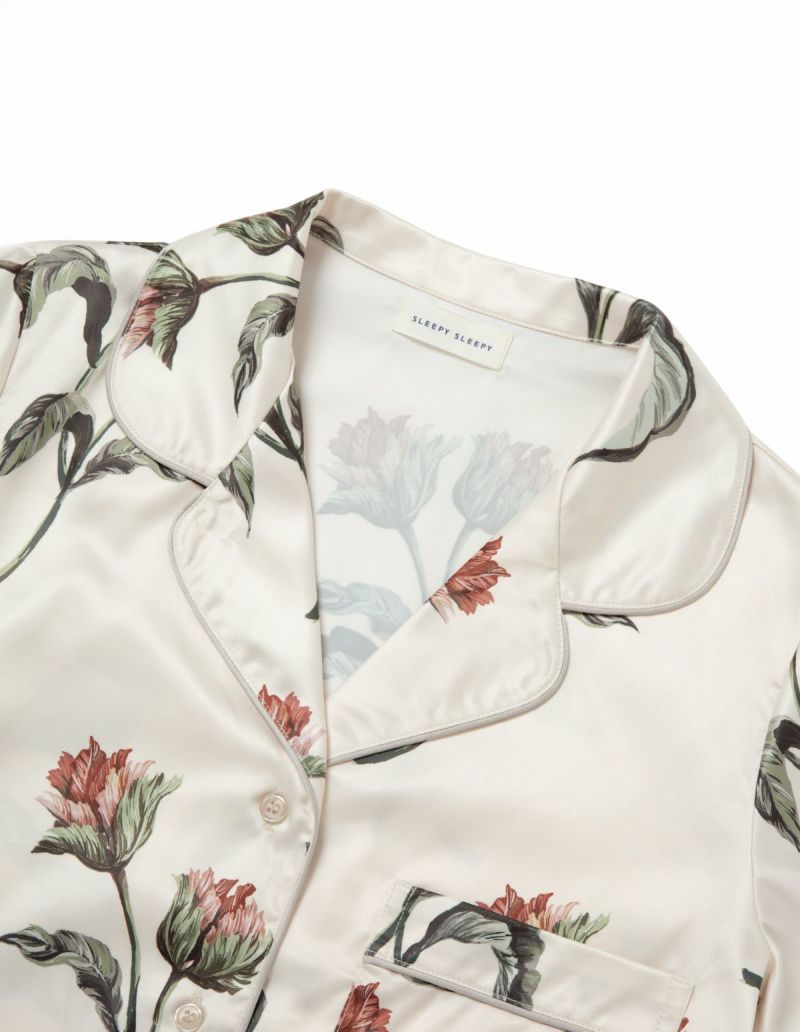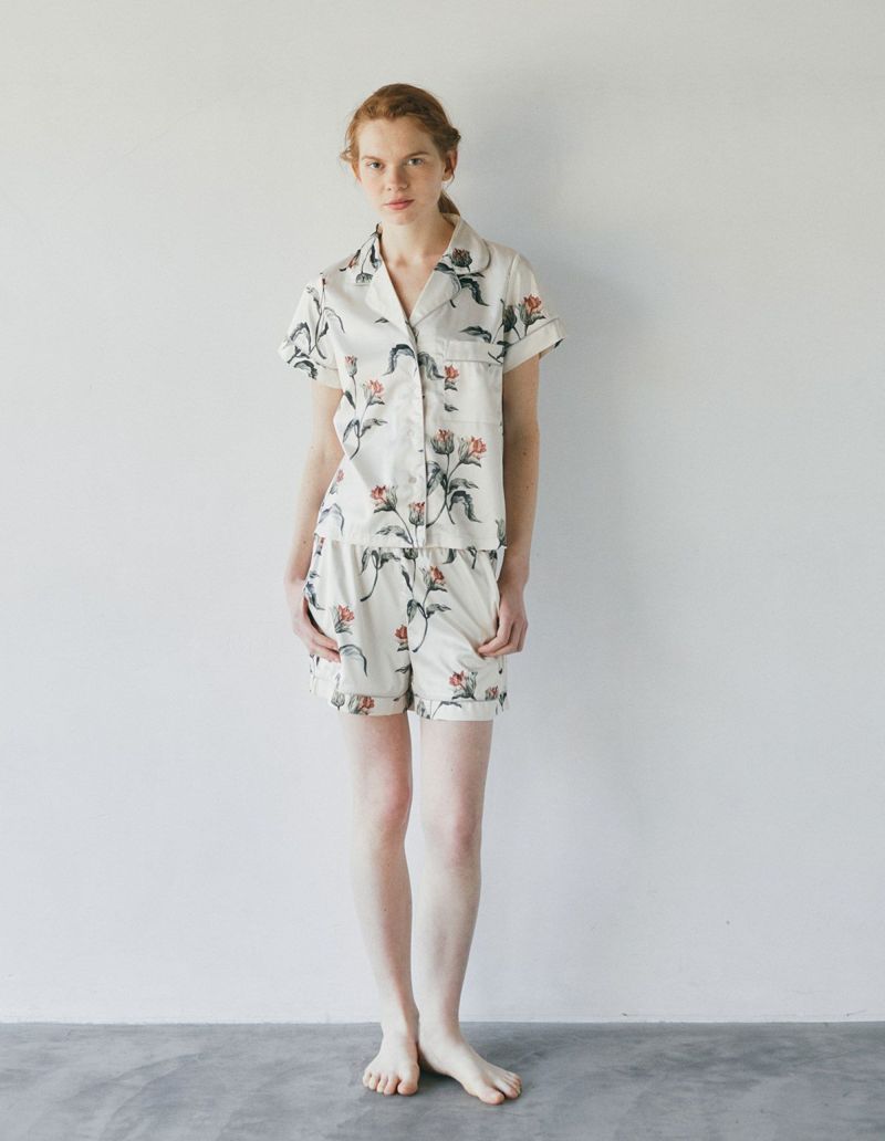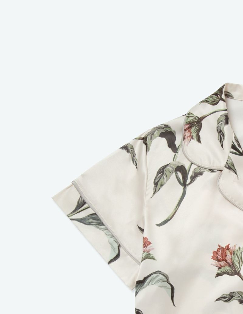 フラワープリントを施したパッケージ付きパジャマをペアでカセットしたフラワーパジャマギフトセット。 細やかなタッチが印象的な華やかなオリジナルフラワーを大胆にプリントした半袖セット。フラワープリントを施したパッケージ入りで特別なギフトにぴったり。微光沢のサテン生地がさらりとした肌触りでロングシーズン着用可能な素材です。ペアアイテムとしてもおすすめ。