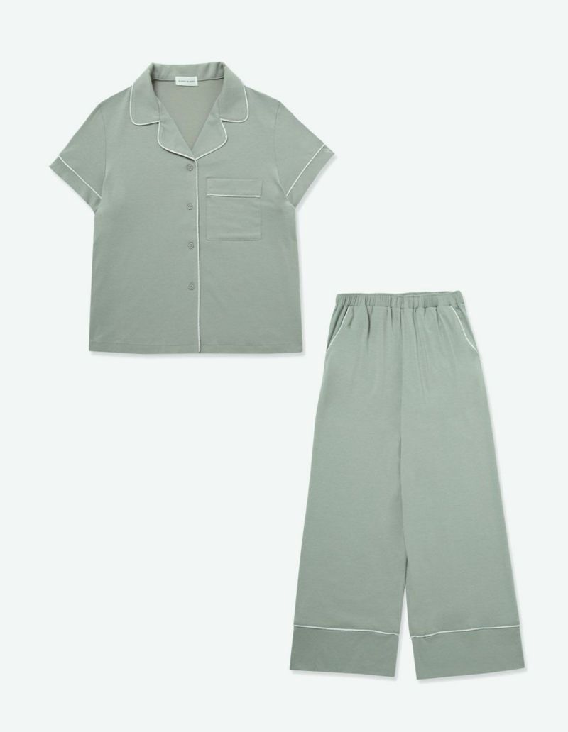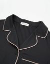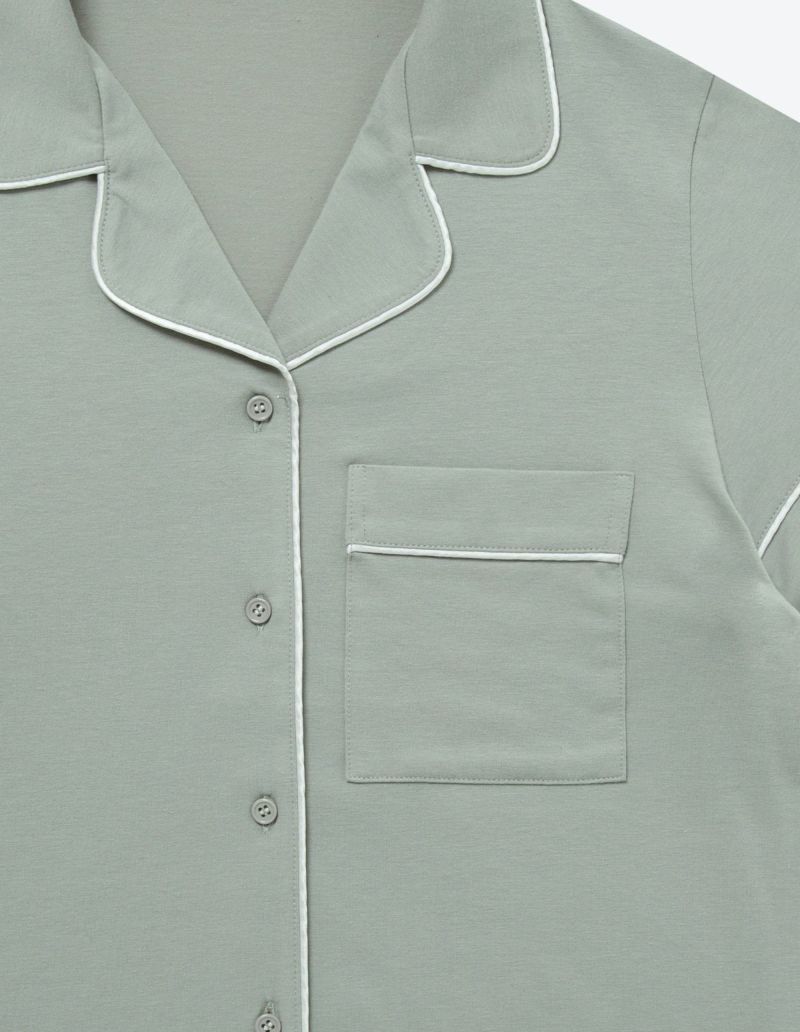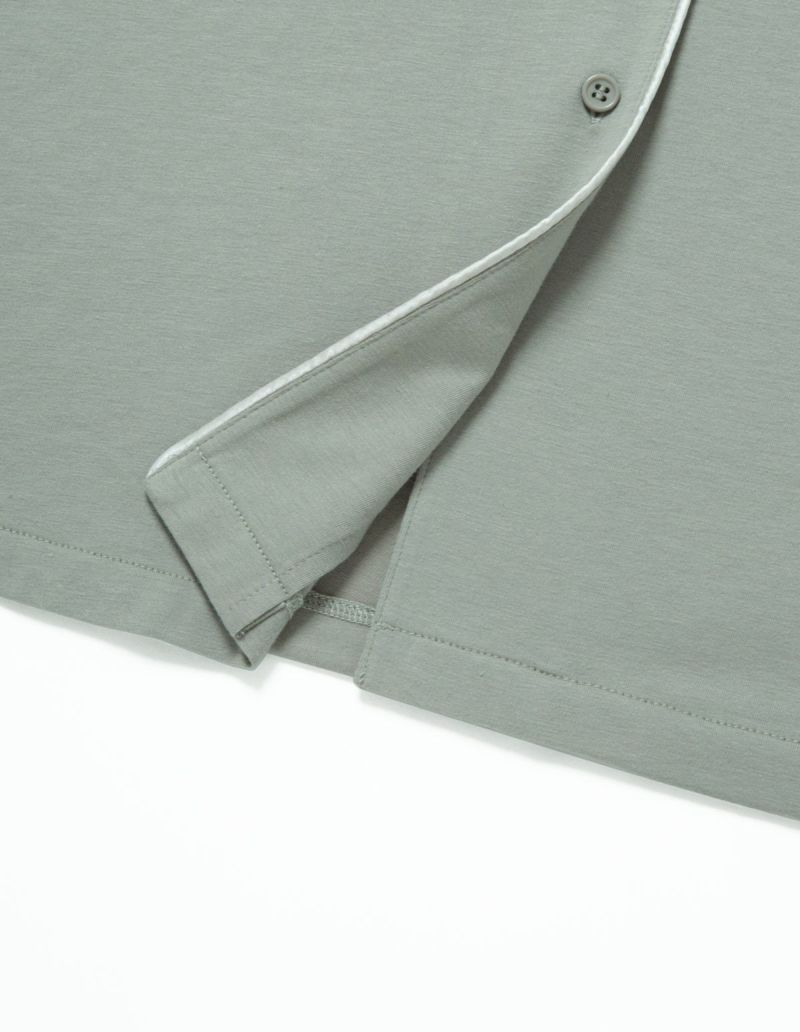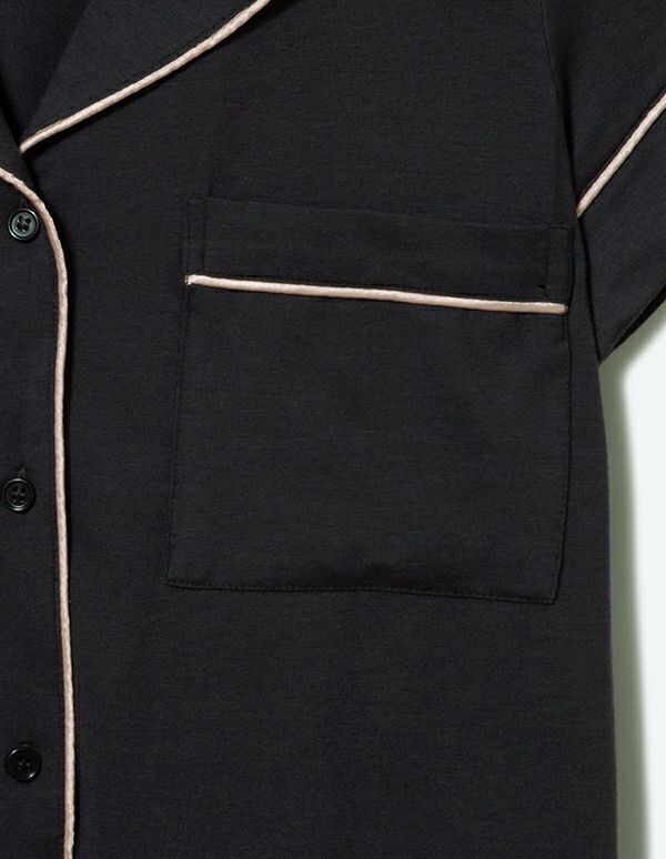 柔らかくストレッチ性のある綿混の半袖とロングパンツのパジャマセット。 薄手の生地で落ち感がありすっきりとしたシルエット。深めのVネックは首元・胸元のシルエットを美しく演出します。アームにゆとりがあり斜めに入る袖口で腕周りもスッキリ細見え効果も。ニュアンスカラーのパッケージ入り。