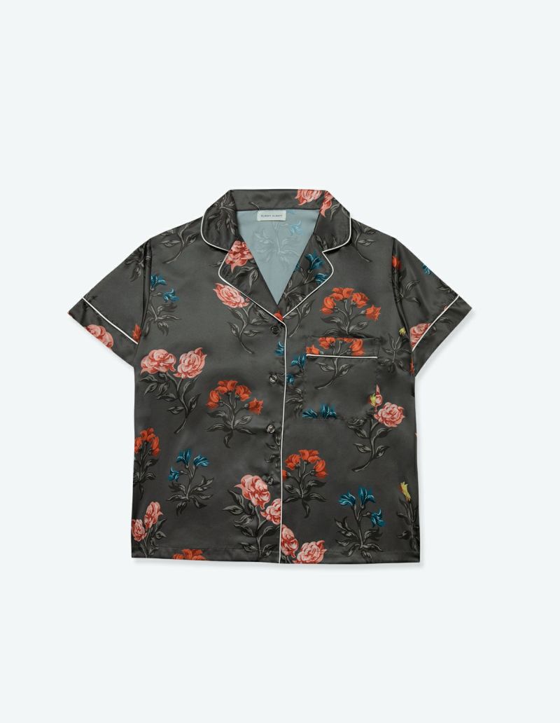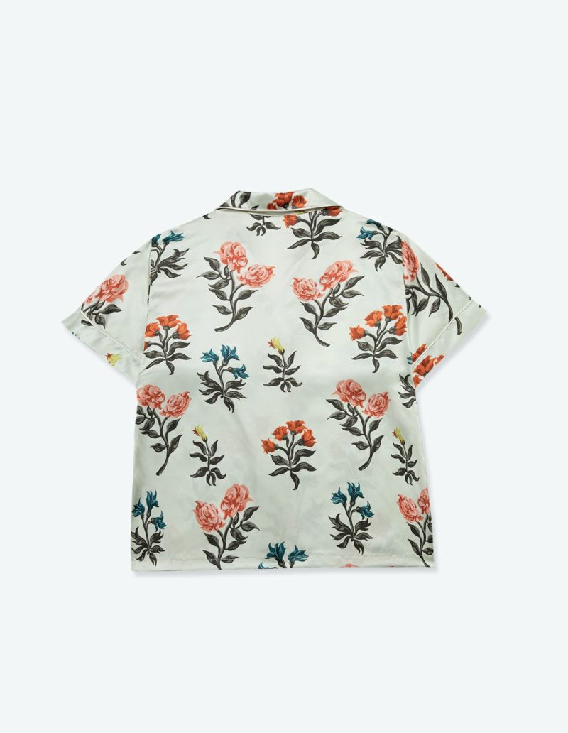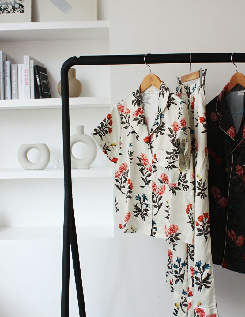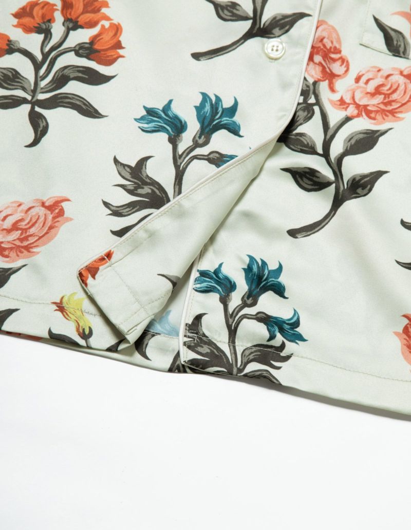 花と春と豊穣の女神、フローラに想いを寄せたフラワープリントパジャマセット。 絵画の女神がまとう花をオマージュした春らしい華やかなデザイン。 微光沢のサテン生地がさらりとした肌触りで、シーズンレスに着用可能な素材です。 おそろいで着られるペアパジャマとして誕生日のギフト、結婚祝いなど様々なお祝いシーンにもおすすめ。