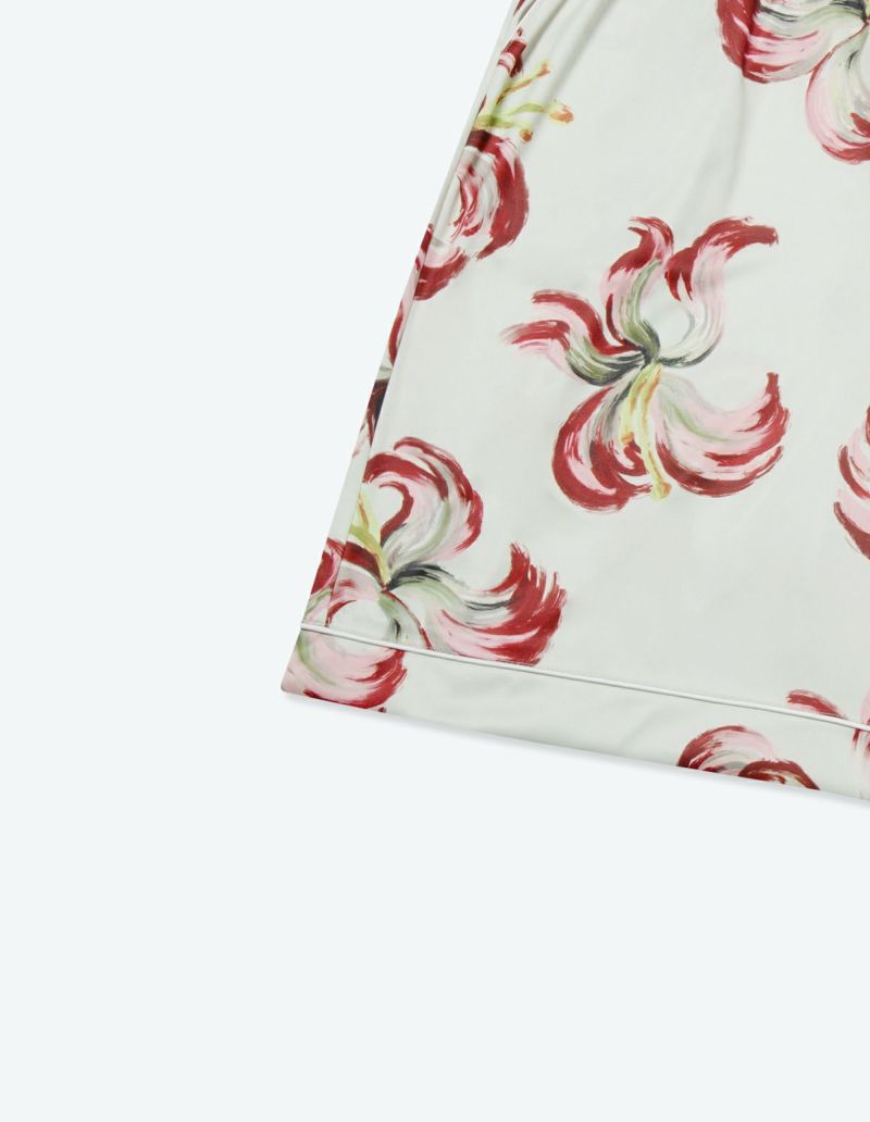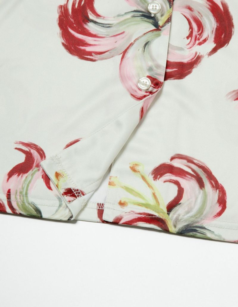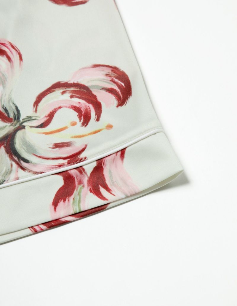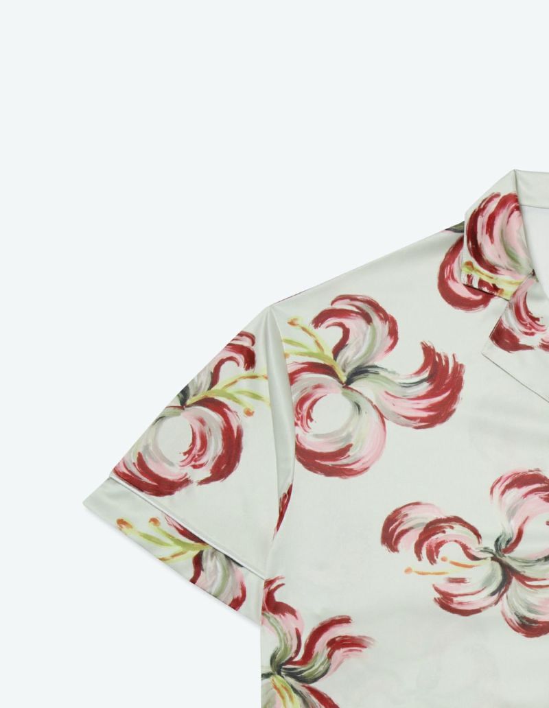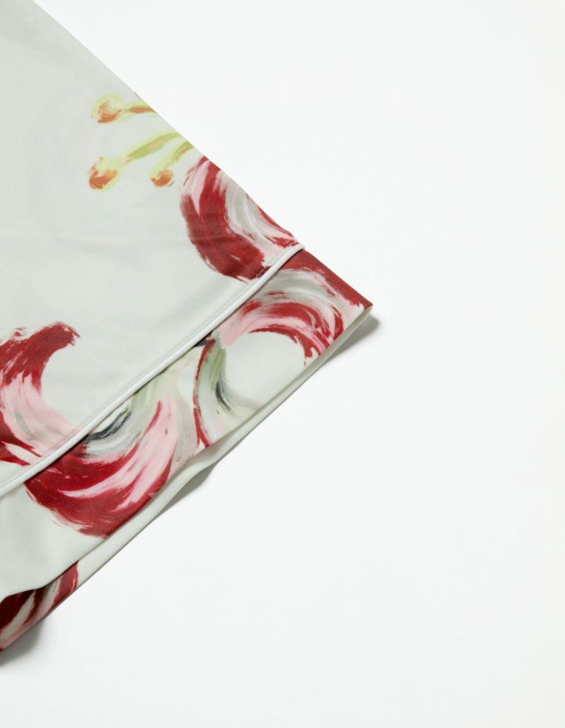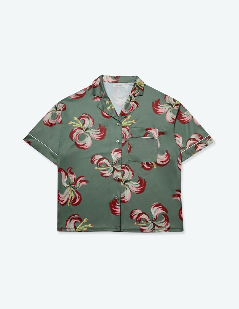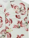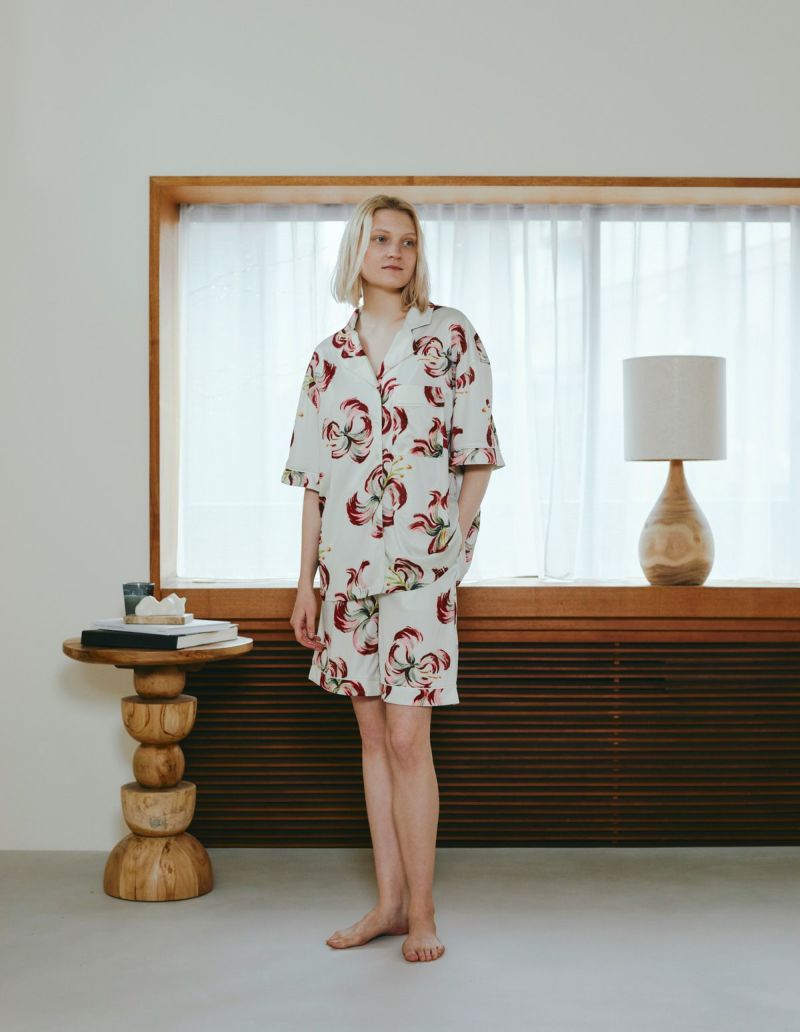 散り際の花びらが生み出すラインを大胆なブラシストロークで描いたフラワープリントの半袖パジャマセット。 かすれた筆先でドライに近づく花を表現。ゆとりのあるオーバーサイズデザインで、 アロハシャツのようにご着用いただくことも可能です。 伸縮性の良いカットソー素材でありながら微光沢のある生地感で上質なイメージも演出。さらりとして速乾性もあり心地よくお過ごしいただけるアイテムです。 おそろいで着られるペアパジャマとして誕生日のギフト、結婚祝いなど様々なお祝いシーンにもおすすめです。