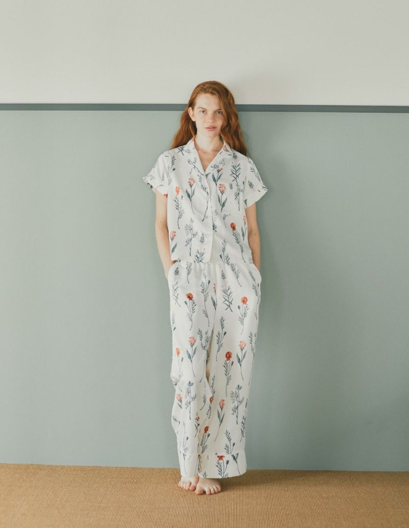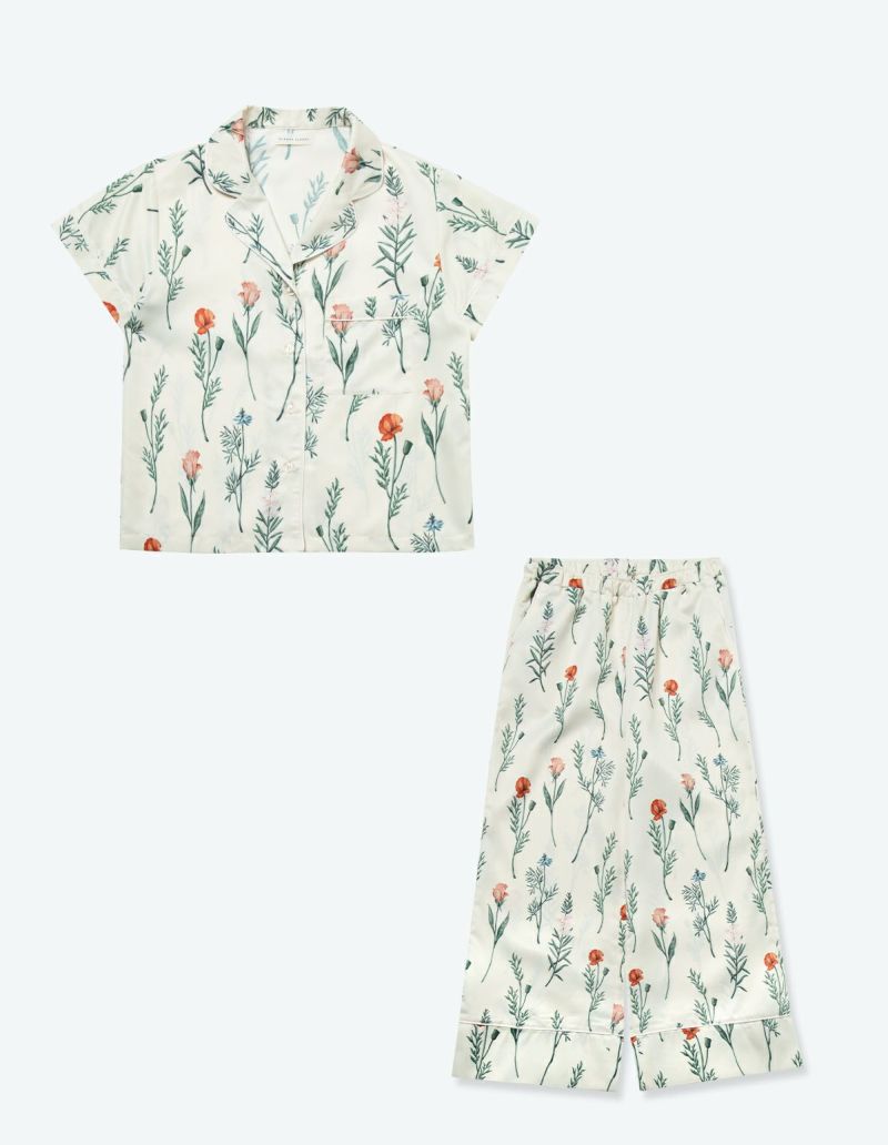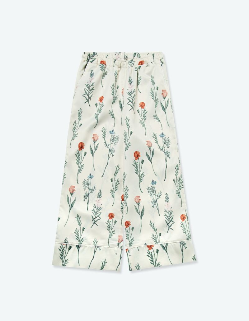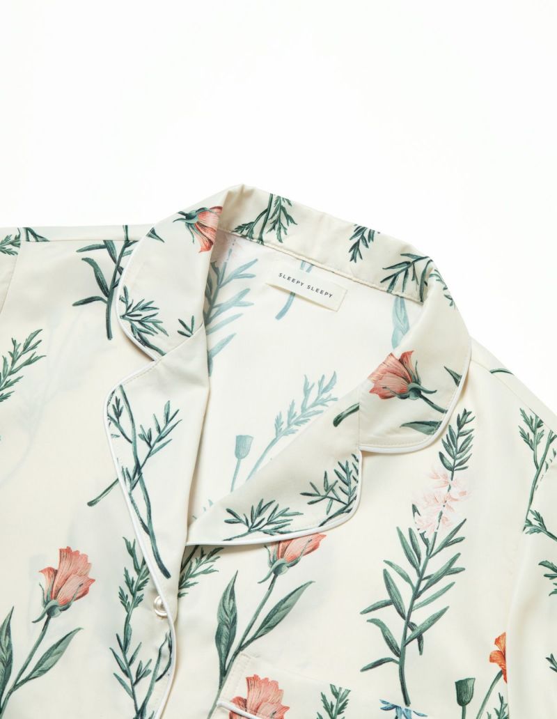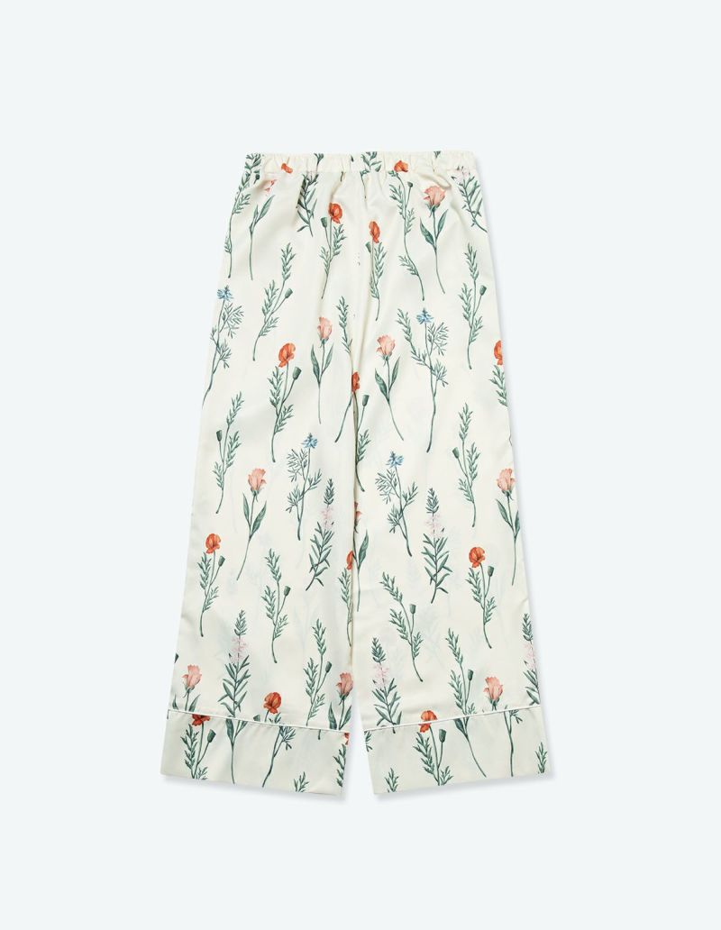 ゆらゆらとたゆたう野の花広がる理想の花園メドウガーデン。風にそよぐ草花の中を纏う牧歌的な情景を落とし込んだフラワープリントパジャマ。微光沢のサテン生地がさらりとした肌触りで、シーズンレスに着用可能な素材です。おそろいで着られるペアパジャマとして誕生日のギフト、結婚祝いなど様々なお祝いシーンにもおすすめ。