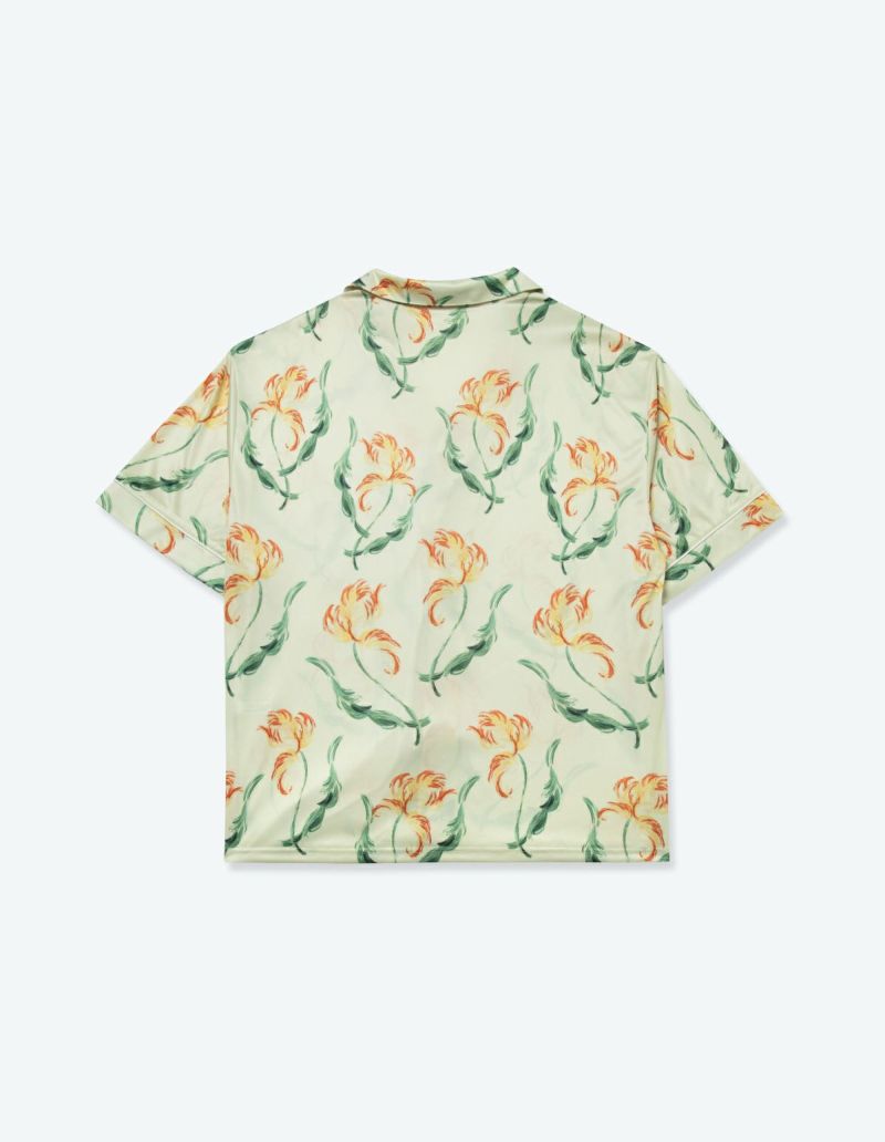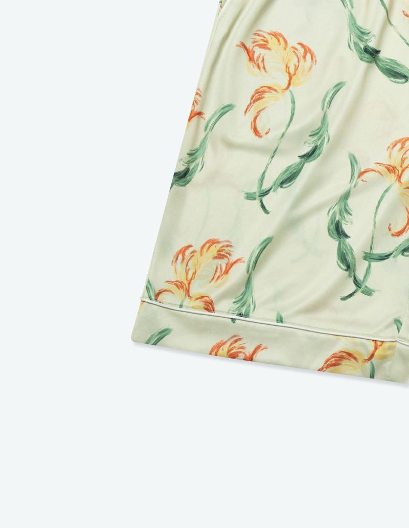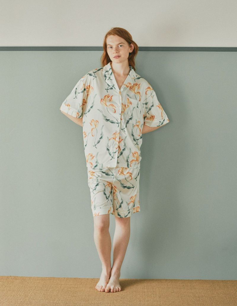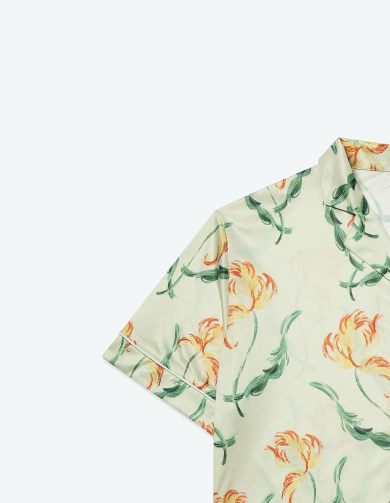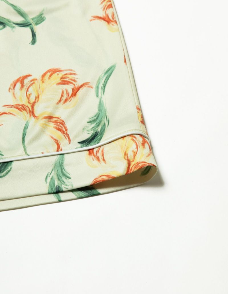 美しく広がるパーロットチューリップをモチーフに、散り際に生み出す花弁や葉っぱの官能的なラインを大胆なブラシストロークで描いたフラワープリントの半袖パジャマセット。ゆとりのあるオーバーサイズデザインで、アロハシャツのようにご着用いただくことも可能です。伸縮性の良いカットソー素材でありながら微光沢のある生地感で上質なイメージも演出。さらりとして速乾性もあり心地よくお過ごしいただけるアイテム。おそろいで着られるペアパジャマとして誕生日のギフト、結婚祝いなど様々なお祝いシーンにもおすすめです。