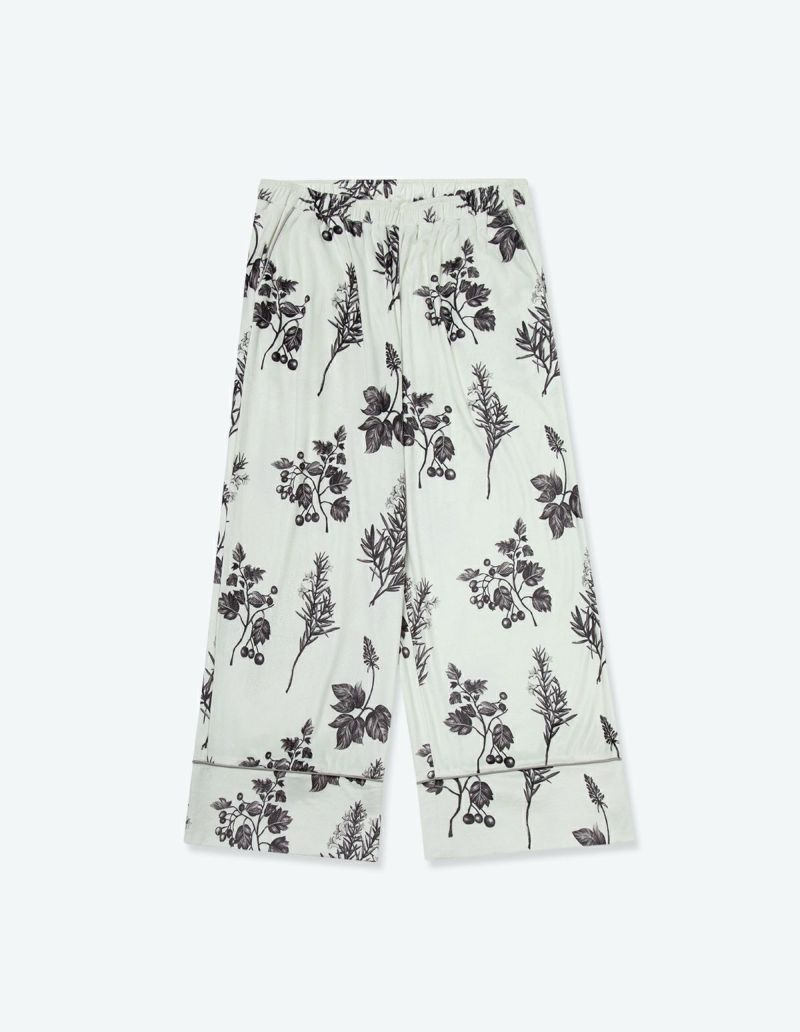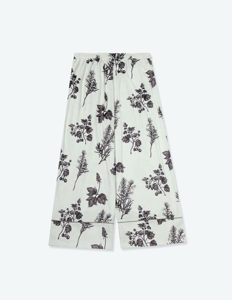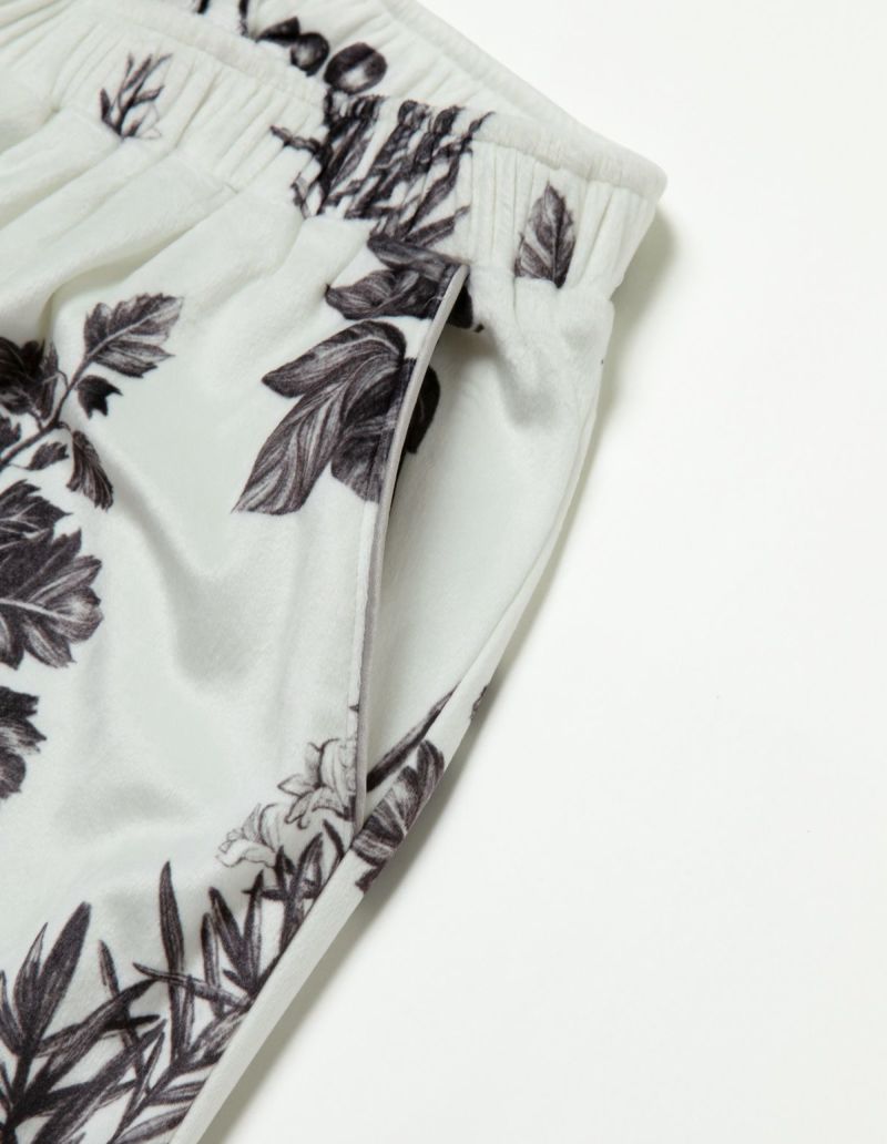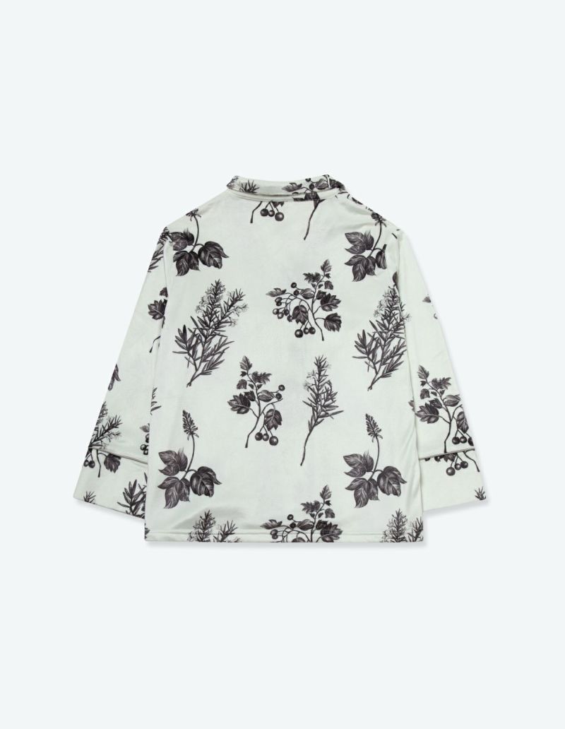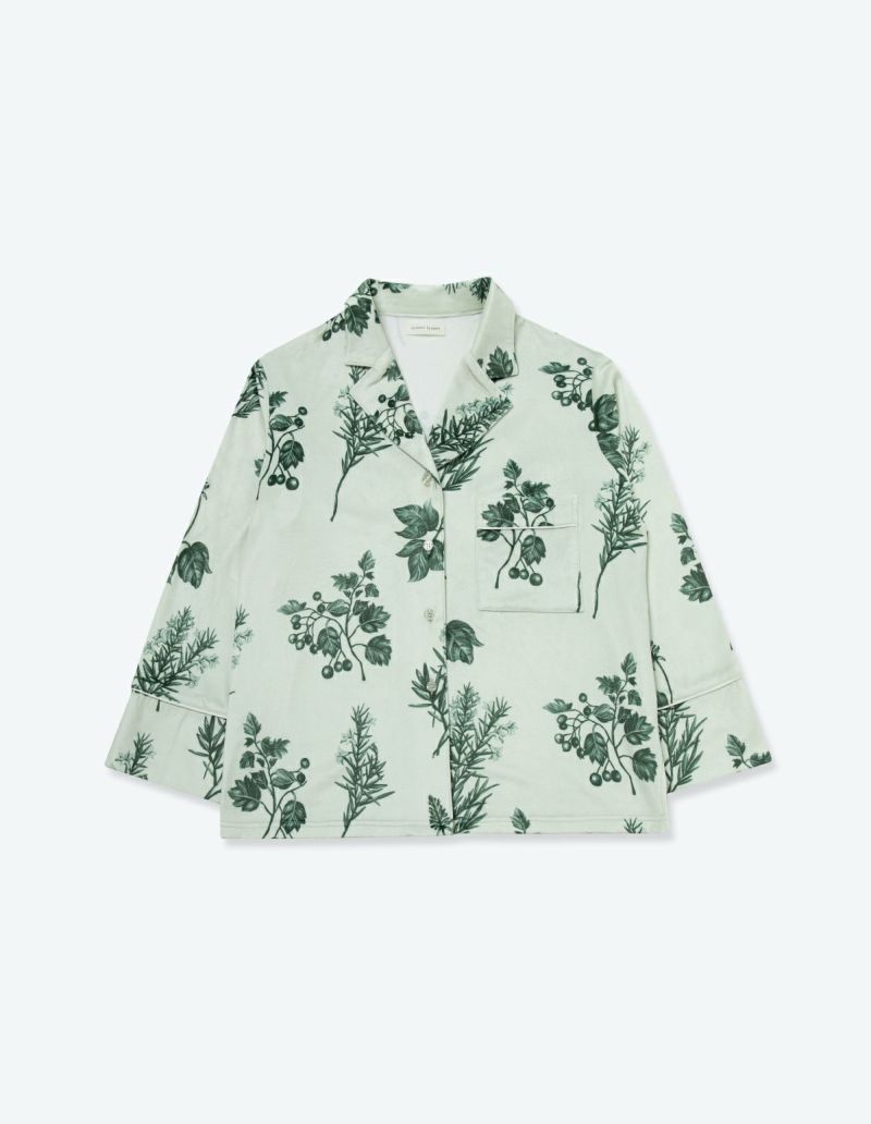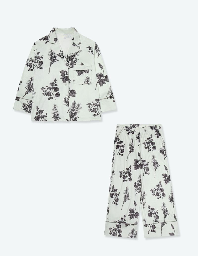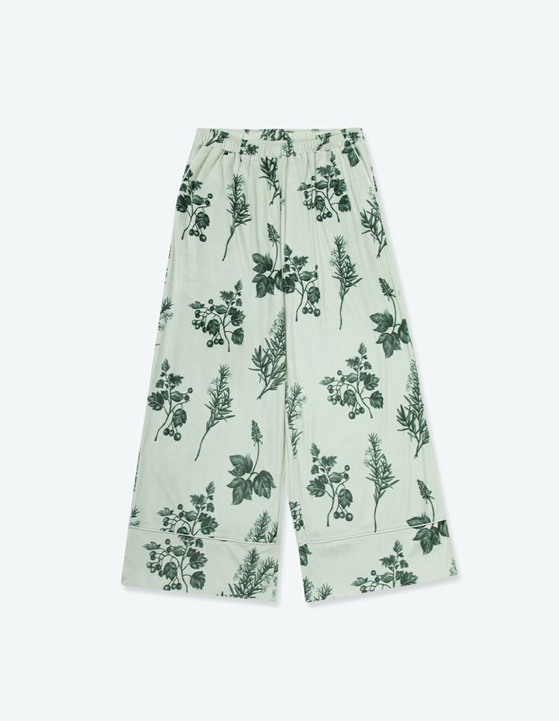 野に咲くハーブを銅版画のようなタッチで描いたフラワーパターンを、柔らかくしっとりとしたベロア生地プリントした長袖ロングパンツ。 繊細に描かれたハーブの凛とした印象で、やわらかなベロアパジャマをシックにまとめました。 着心地の柔らかなベロアは保温性も高く暖かくお過ごしいただけます。 ペアアイテムとしてもおすすめ。