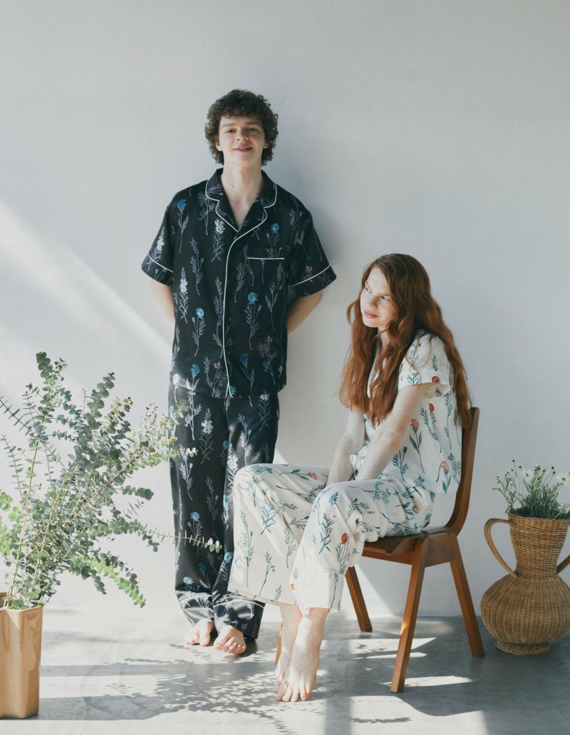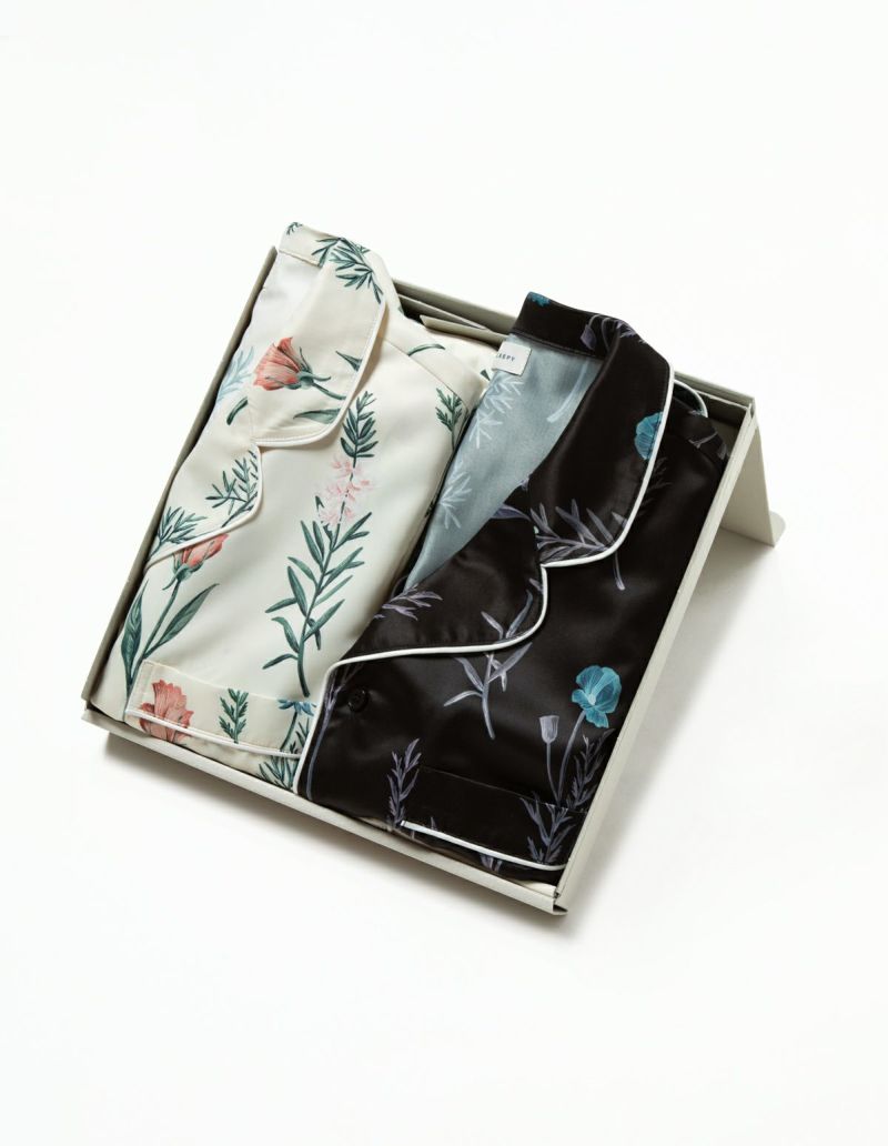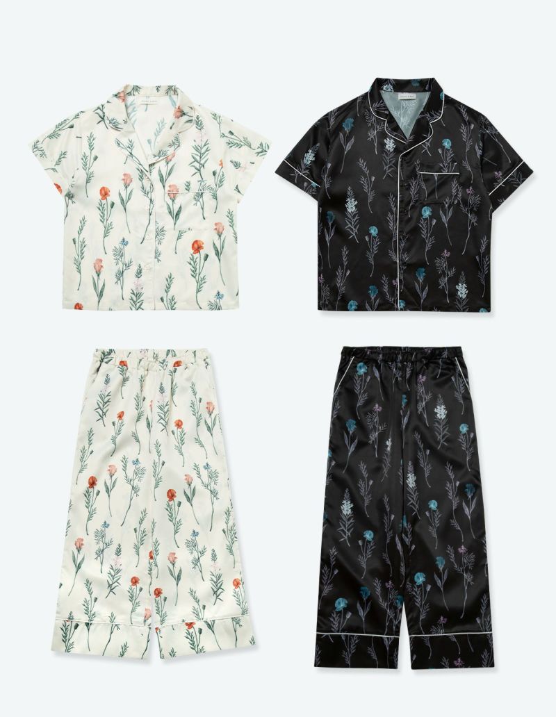 ゆらゆらとたゆたう野の花広がる理想の花園メドウガーデン。風にそよぐ草花の中を纏う牧歌的な情景を落とし込んだフラワープリントパジャマをペアでラッピングしたギフトセット。微光沢のサテン生地がさらりとした肌触りで、シーズンレスに着用可能な素材です。 おそろいで着られるペアパジャマとして誕生日のギフト、結婚祝いなど様々なお祝いシーンにもおすすめです。