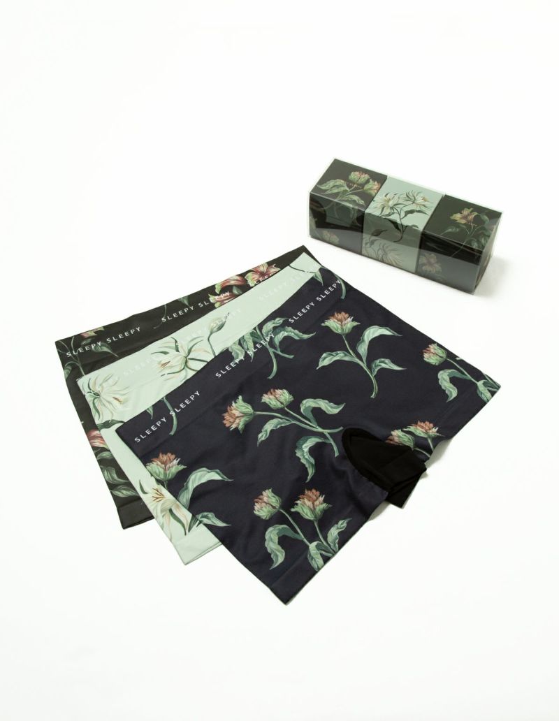 シームレスボディーですっきりとしたシルエットのアンダーパンツの3点ギフトセット。 プリントパッケージを生かしたクリアケース入り。ボクサーはさらりとした肌触りをキープする速乾性と、フィット感と伸縮性に優れたポリエステルタイプ。シックな花柄プリントで様々なギフトシーンにおすすめです。お渡し用のSサイズショッパー付き。